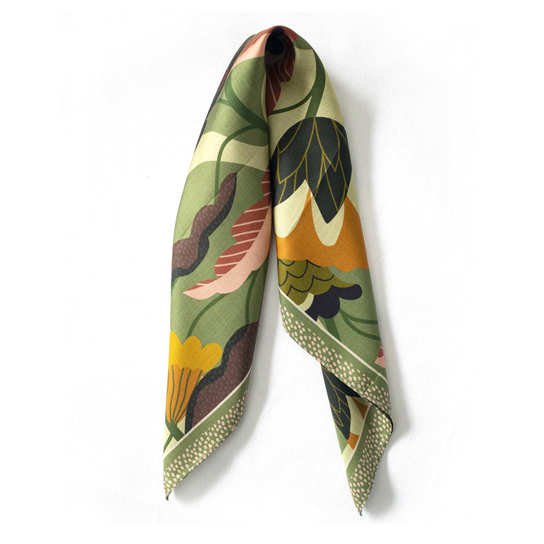 A beautiful and elegant design that shimmers on 100% silk twill. One of the most popular Dora Nola designs - the classic Nana. This print will remind you of the fresh herbs and cut flower gardens of southern France.