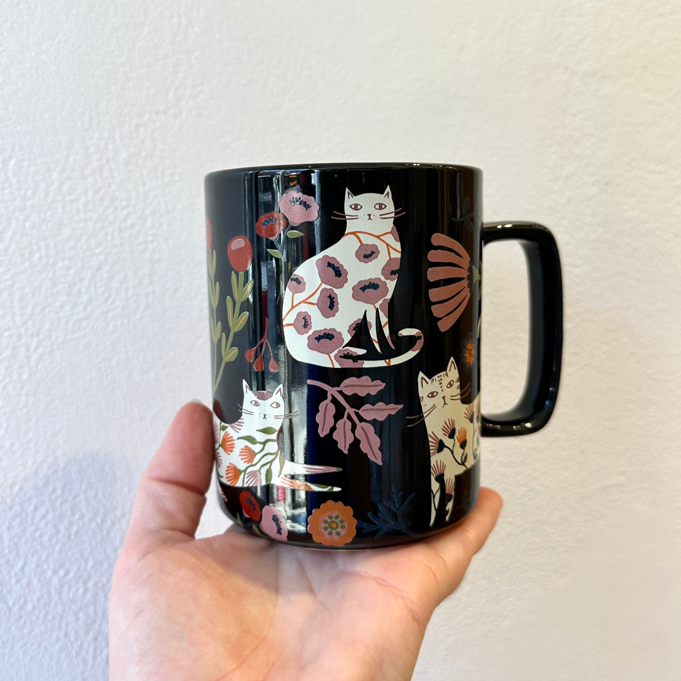 A sleek black ceramic mug adorned with playful white cats and delicate floral accents. Perfect for enjoying your favorite beverage, this mug brings a touch of feline charm and garden-inspired elegance to your drinkware collection.
