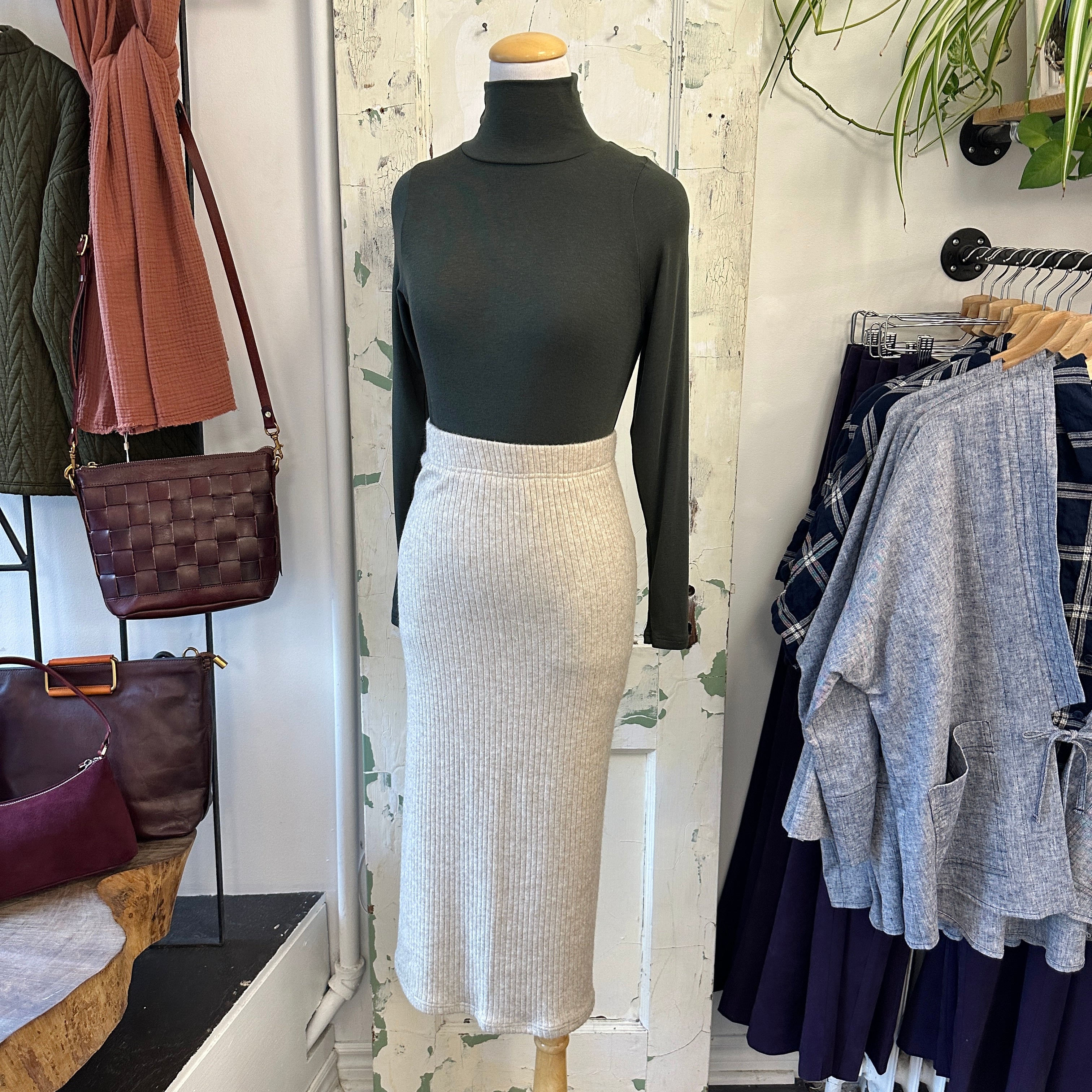A tube skirt! What more to say! It’s longer than our usual version and made from a thick fuzzy rib.