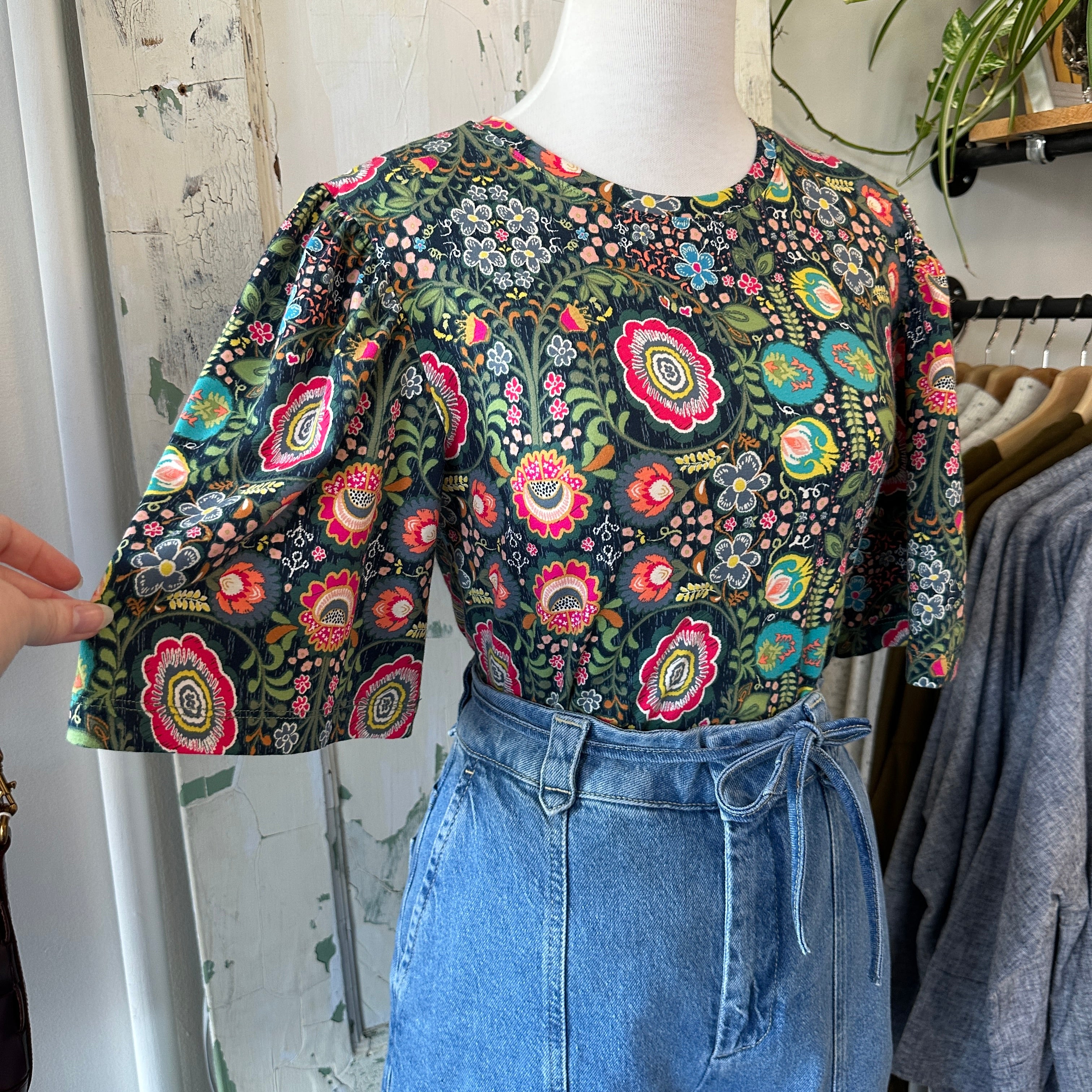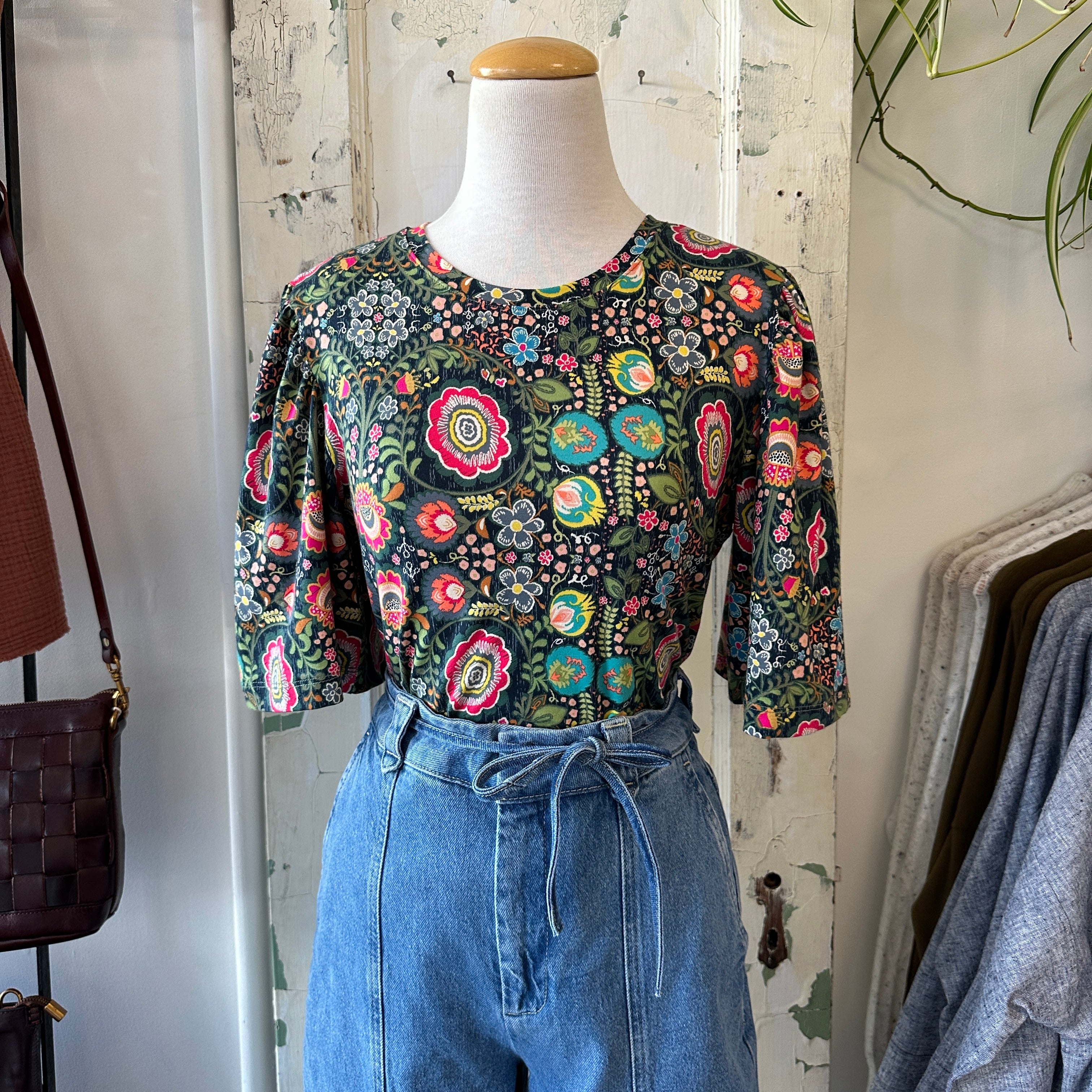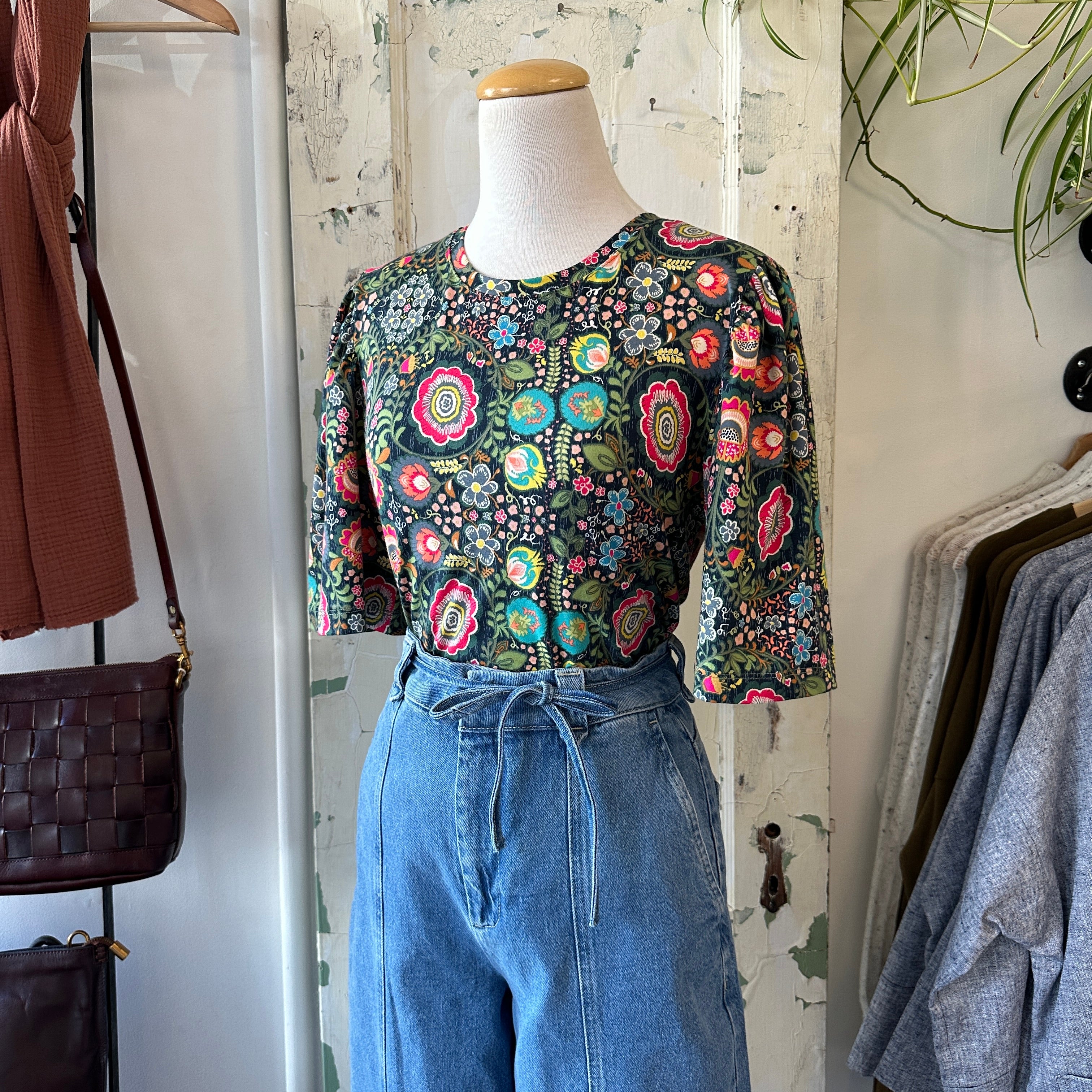 Peahen is a crew-neck knit top with an elbow length full sleeve that is gathered at the shoulder. The fabric is a soft cotton jersey that contains 95% cotton and 5% spandex.