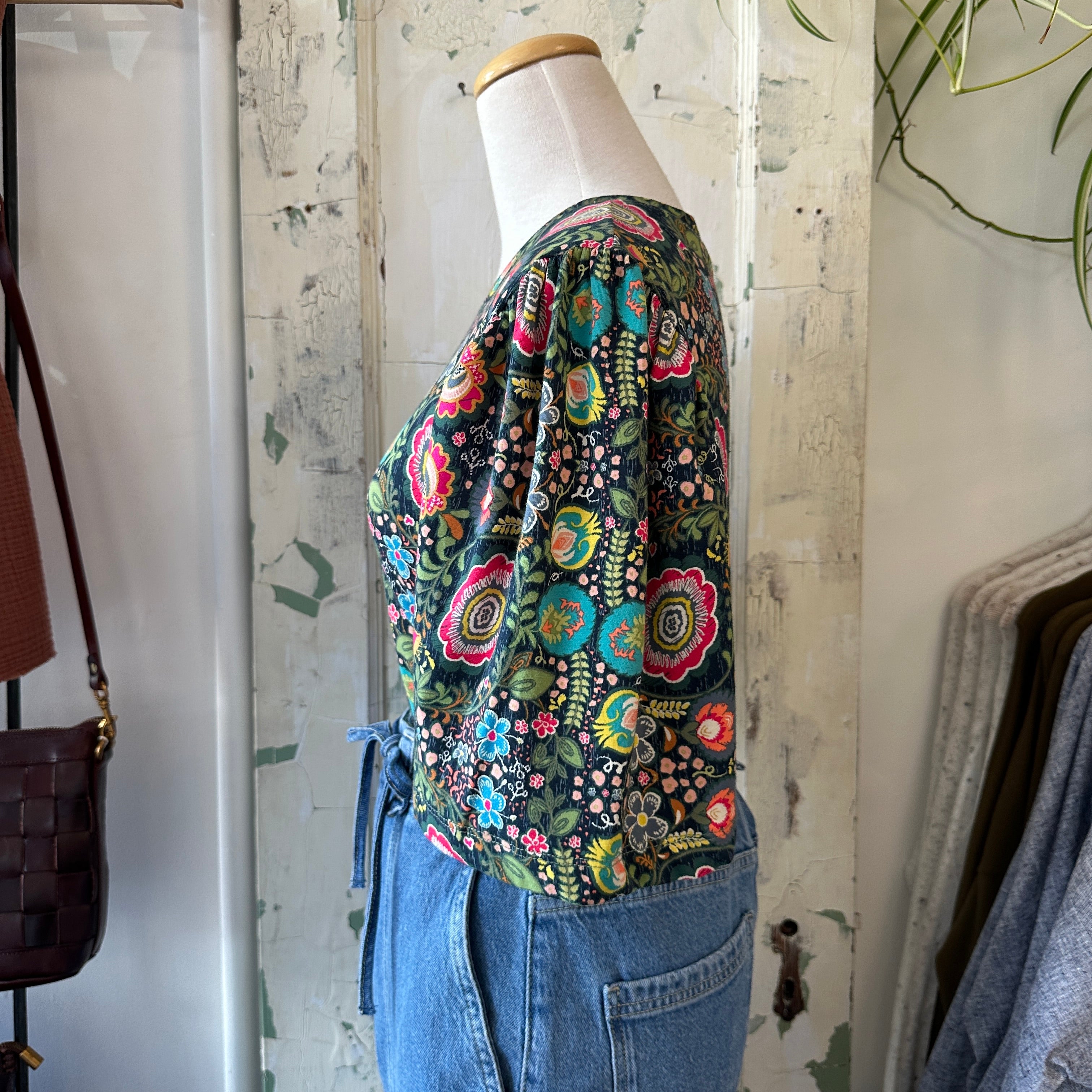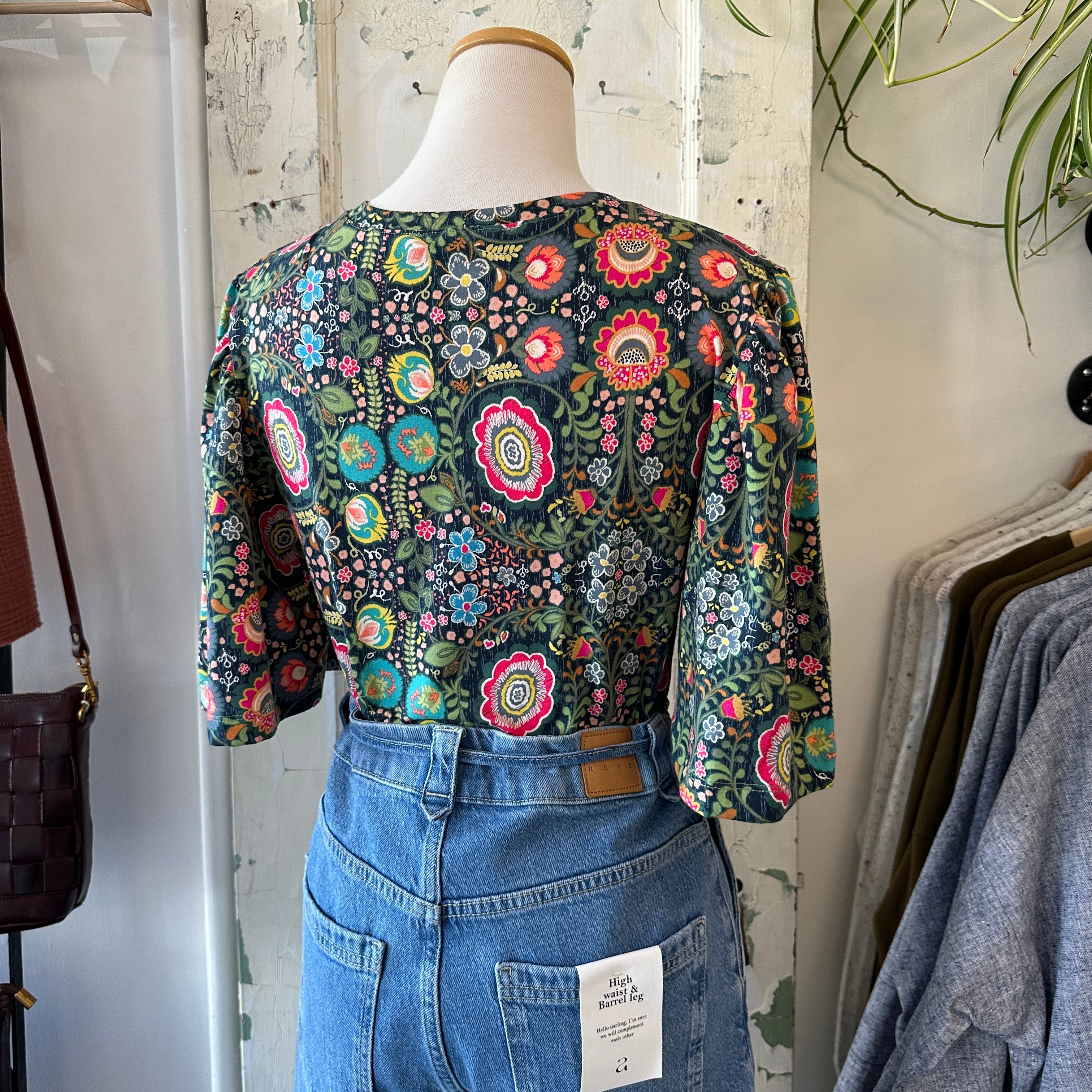 Maud has a dark green background with a richly hued palette of abstract flowers and foliage.