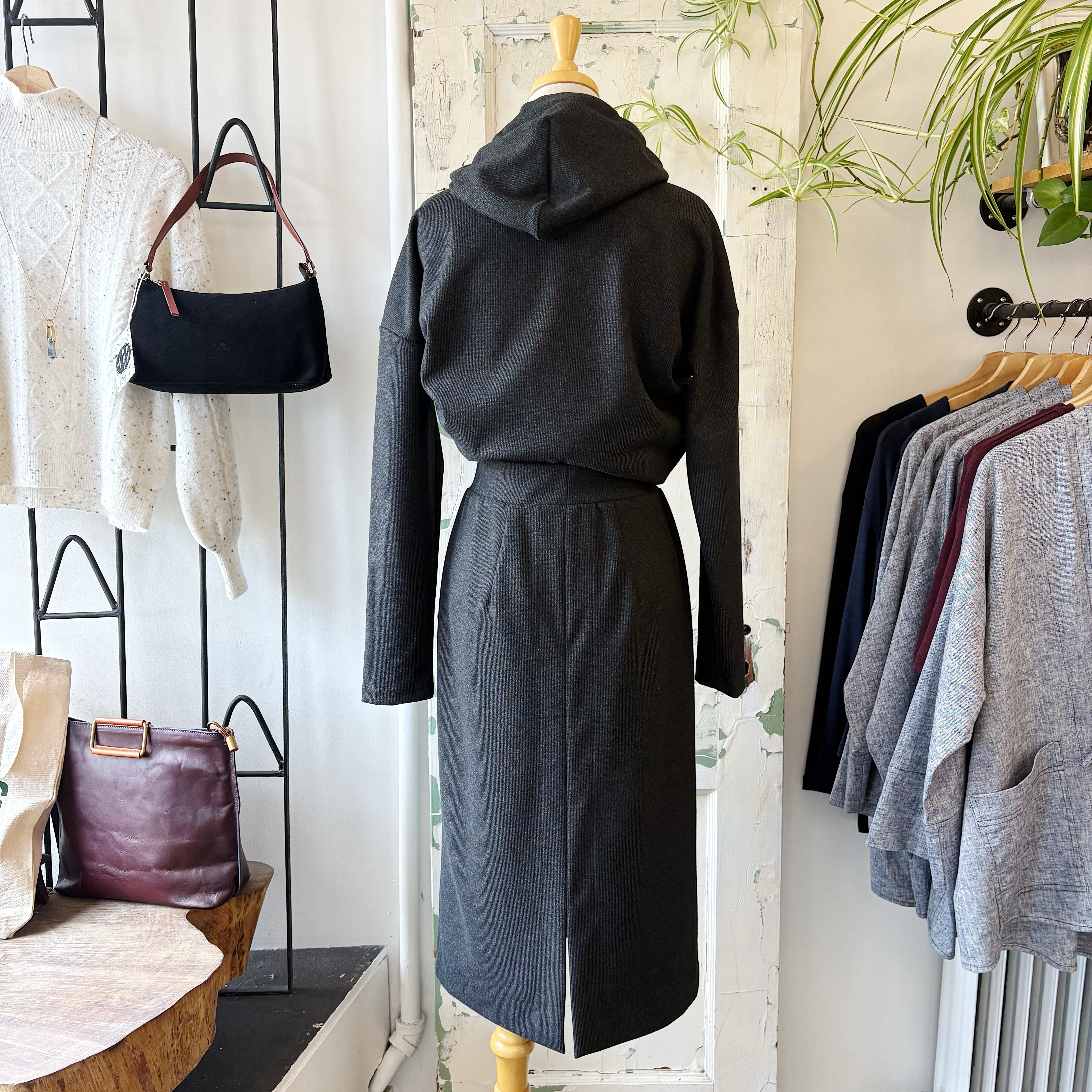 The covered waistband and clean lines create a polished finish, while a back slit adds movement and ease. Wear it with the Skye hoodie for relaxed balance or pair with a simple top for an office-ready look.