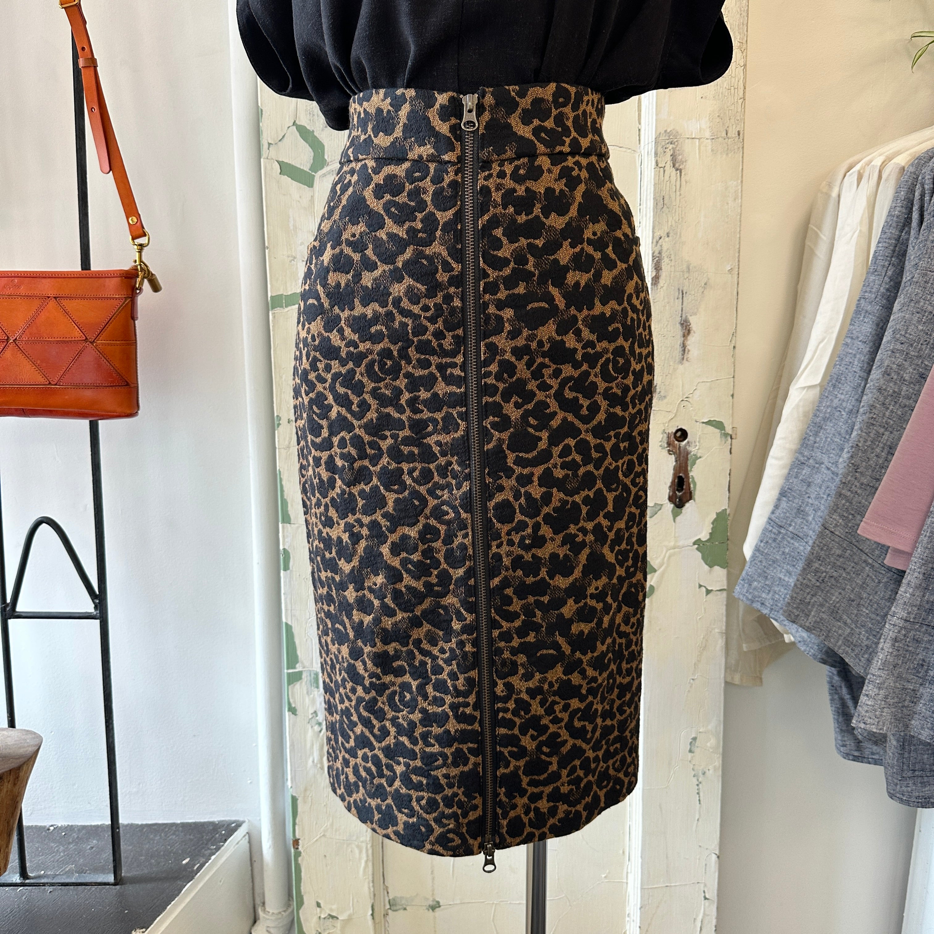 High waisted, fitted skirt, made in a beautiful mid-weight leopard print fabric. We love the zip detail at the front that opens at the top and bottom, creating an opening for more freedom of movement if needed, and to add another little original detail!