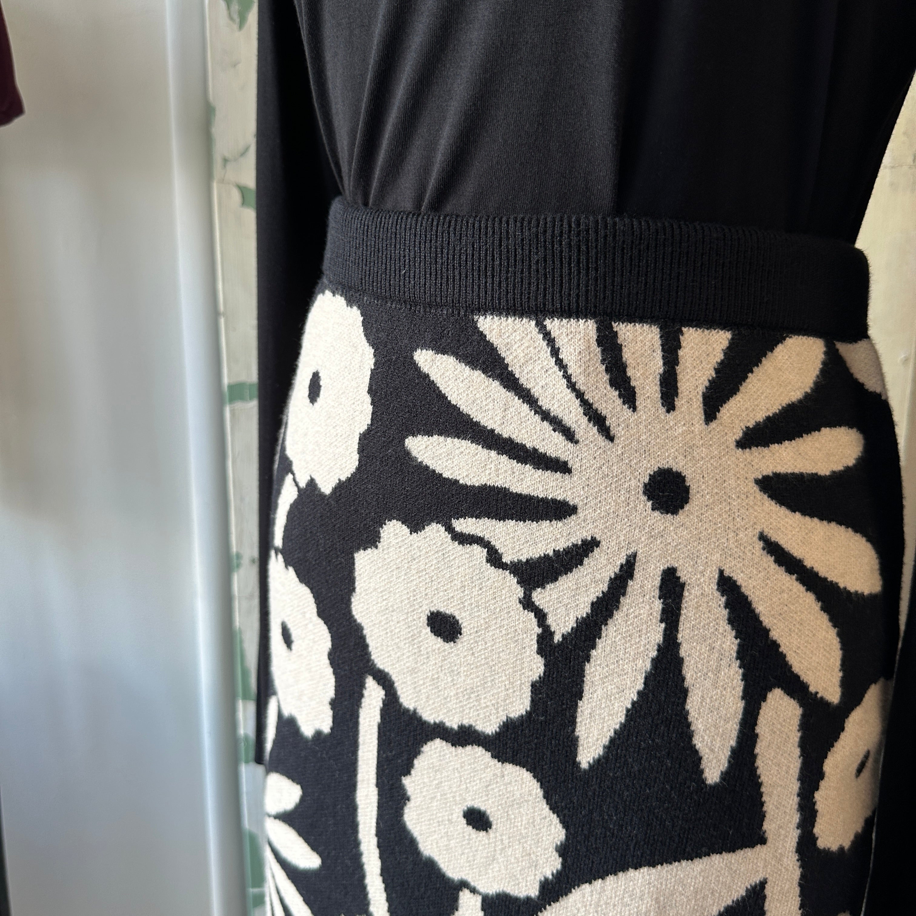 As cute as it is comfortable, this pull-on stretch knit skirt looks great with oversized knits and tops, especially the matching cardigan! Ribbed waist band and slit at back.