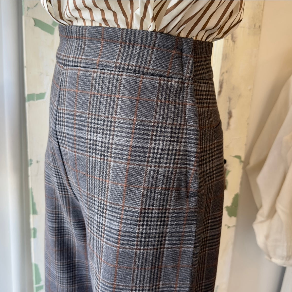Wide-legged cropped pant in a super soft mid-weight plaid fabric. Flat front with a side zip closure and welt pockets at back. The Nadias are a best-seller year after year! A great work pant.