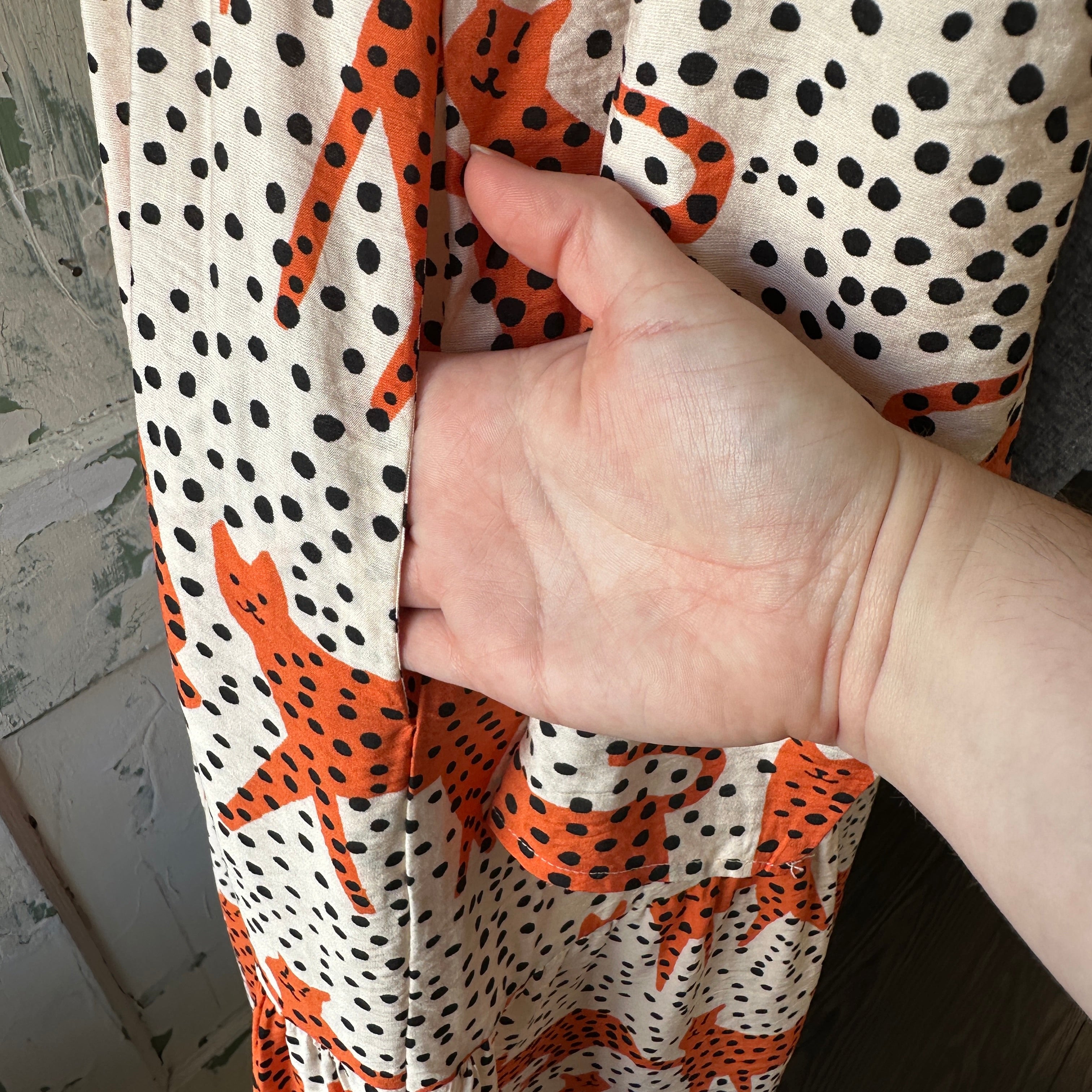 Sweet and flowy dress in a relaxed, tiered silhouette. Features keyhole button closure at the back, side pockets and long sleeves. Meow meow meow.