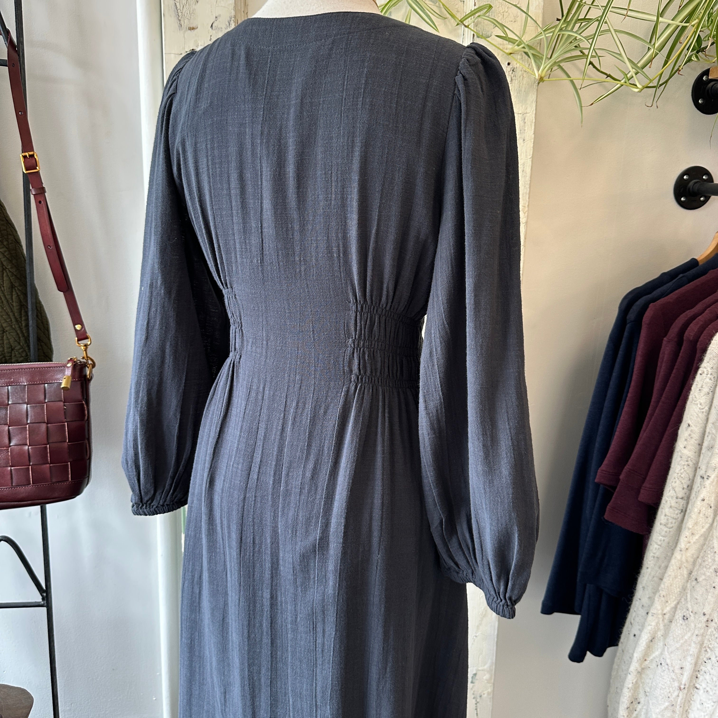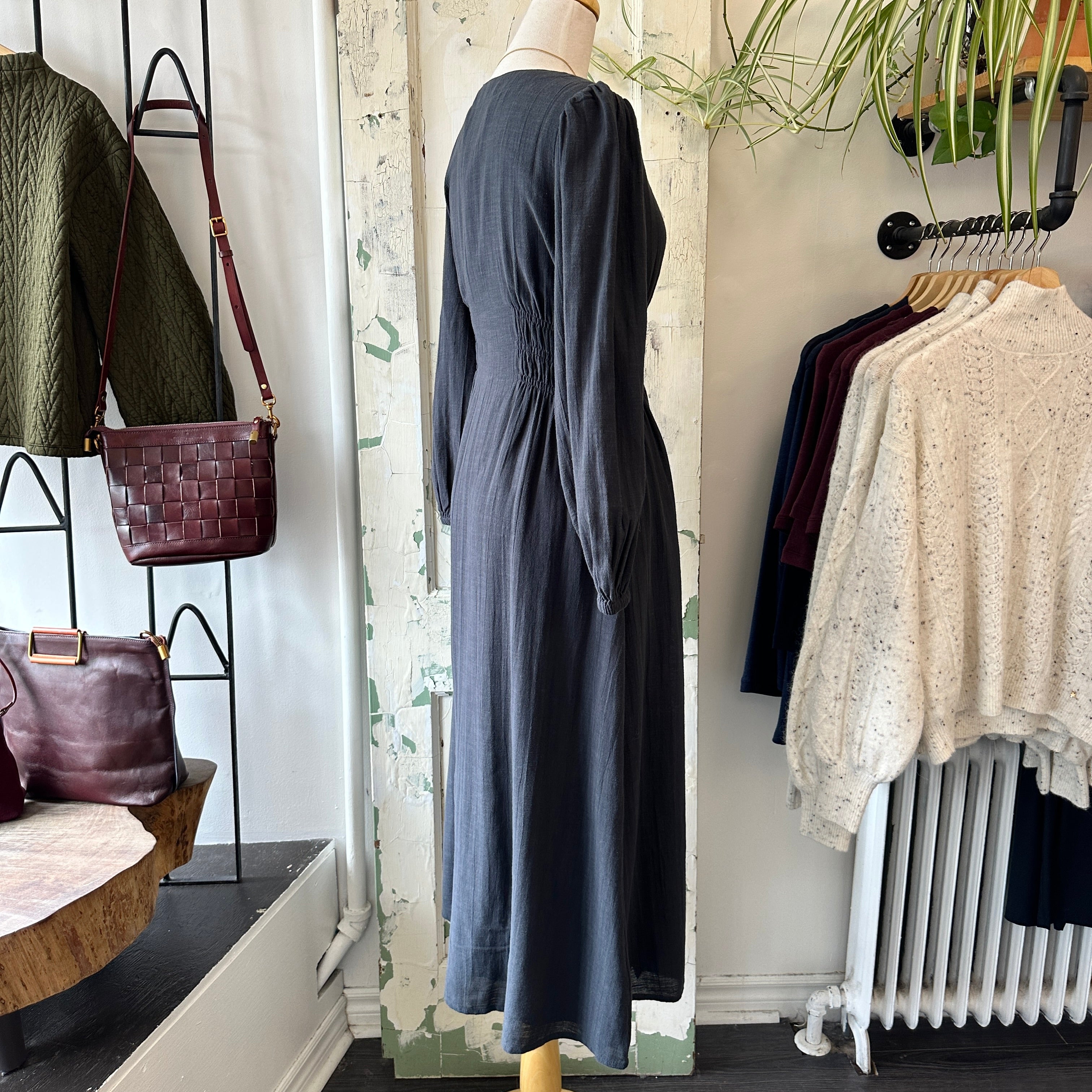 Dress in crepe cotton gauze, voluminous sleeves and waist defining elastic smocking for a comfortable cinched silhouette. Pair with some tall boots and a blazer for a beautiful fall look.
