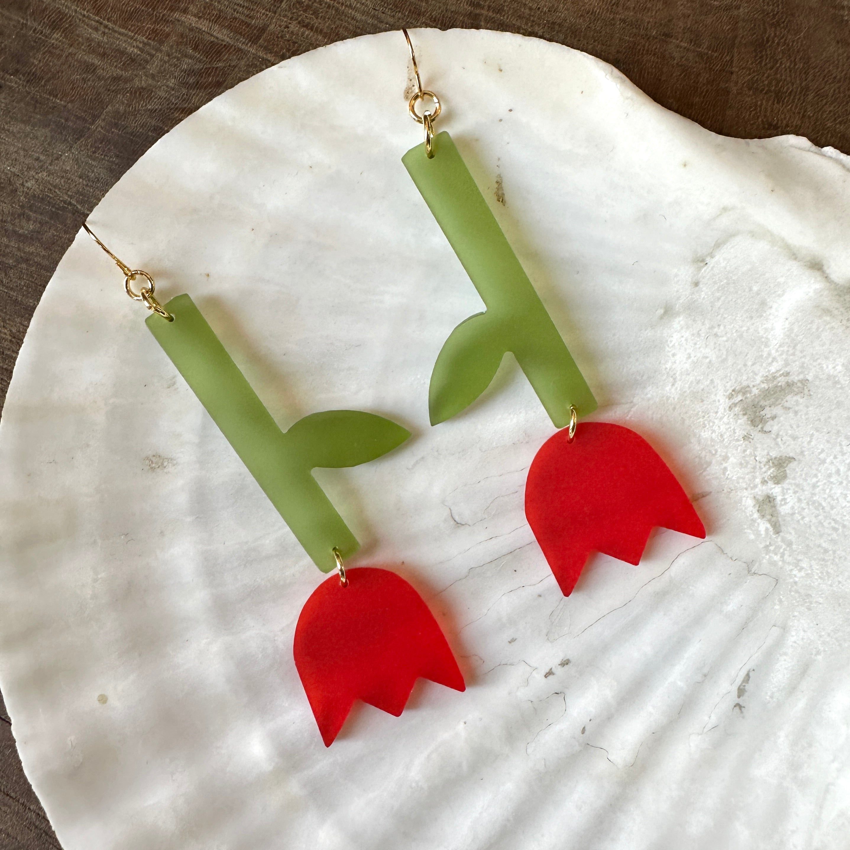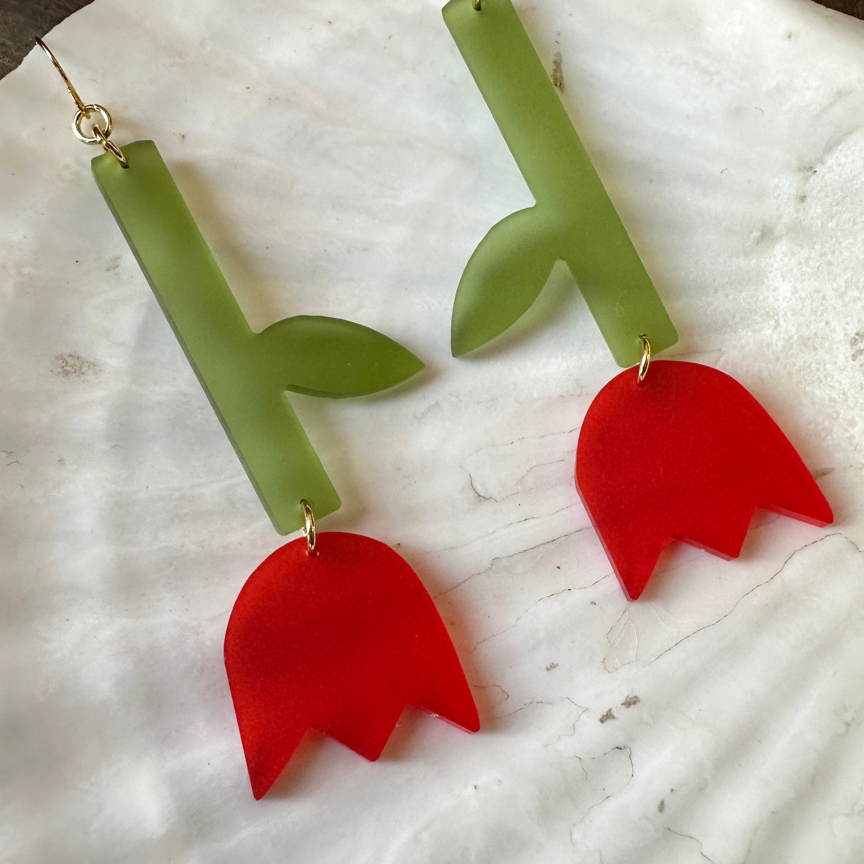 Elevate your look with our Large Tulip Earrings in red. Handcrafted from lucite, these earrings feature a bold and vibrant red tulip design. Add a touch of elegance to any outfit with these lightweight statement earrings.