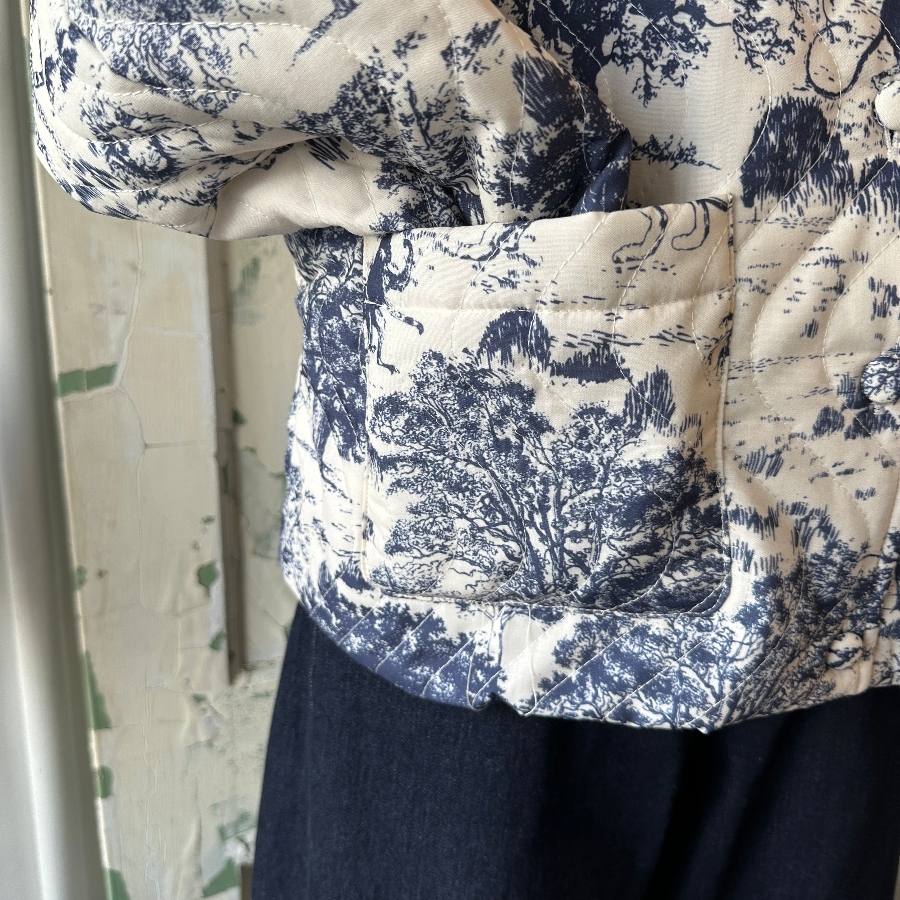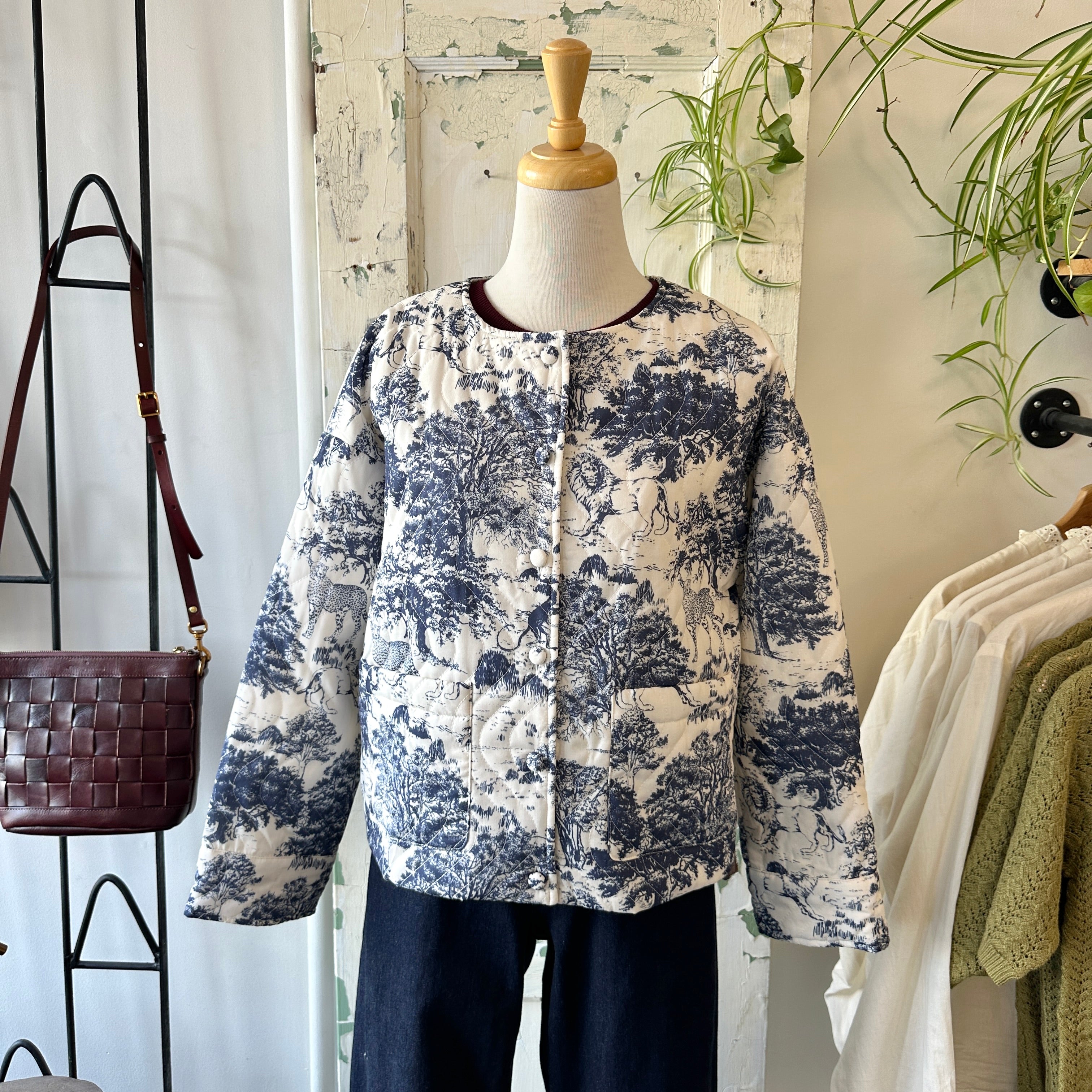 The Toulon Jacket is a quilted jacket featuring an elegant toile de Jouy print with a modern twist. Designed with wave topstitching, patch pockets, and a front covered button closure, this lightweight-fill jacket blends timeless charm with everyday style. Layer it over a basic top and pair with a skirt or pants for an effortlessly chic statement look.