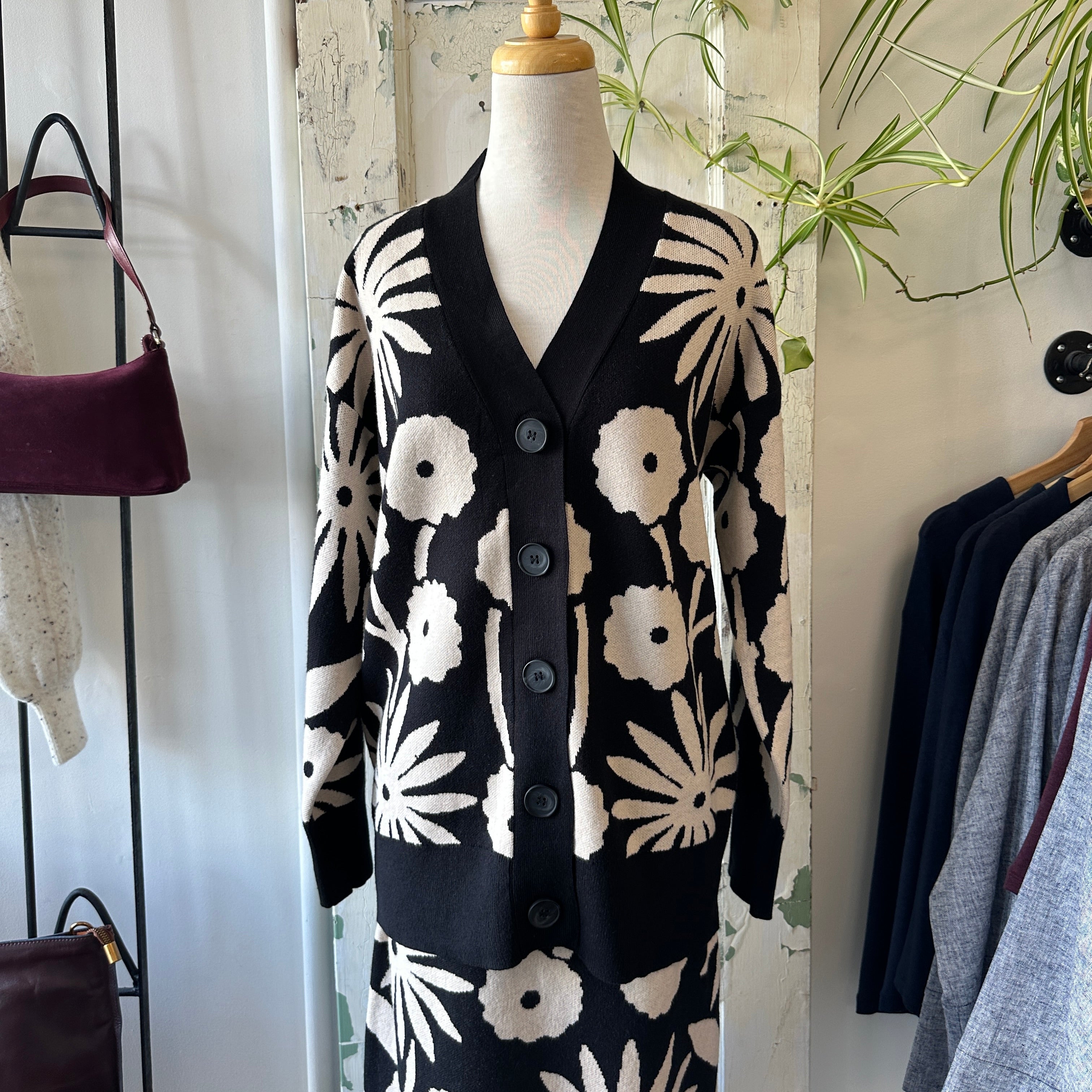 We love this sweet patterned cardigan from Spain's Compania Fantastica. Oversized fit with large buttons and ribbed hem and cuffs. Looks great with the matching skirt, or with your favourite jeans.