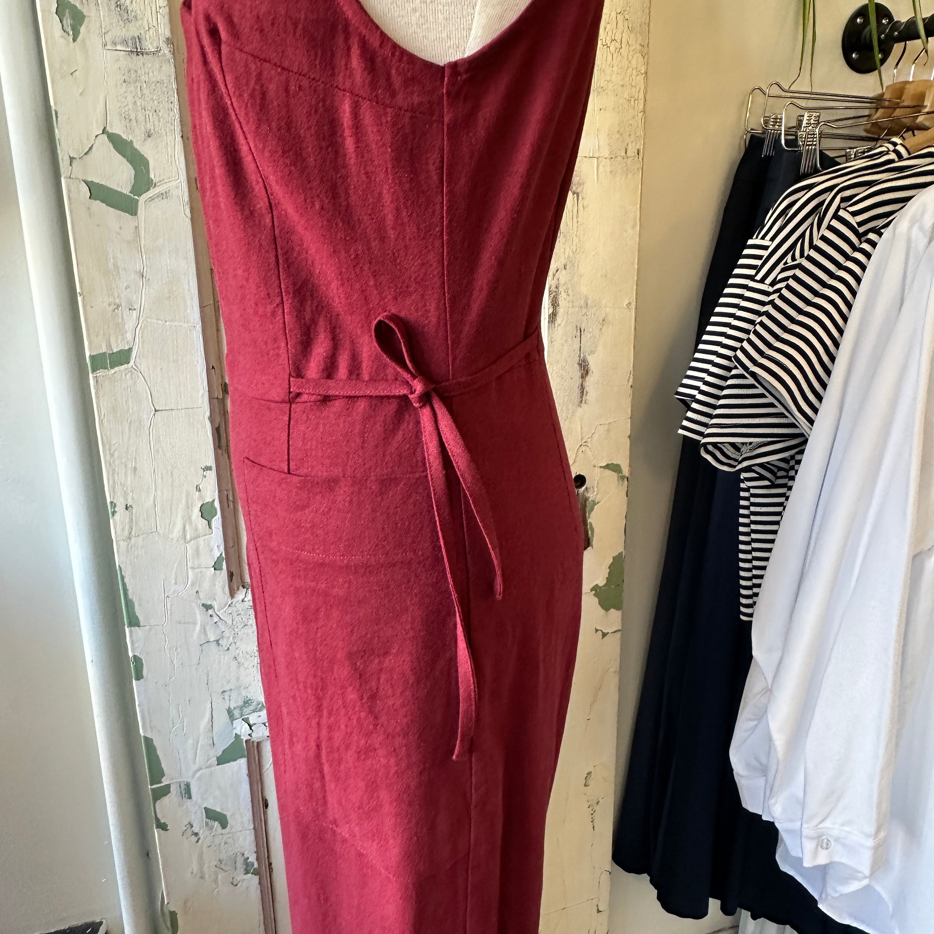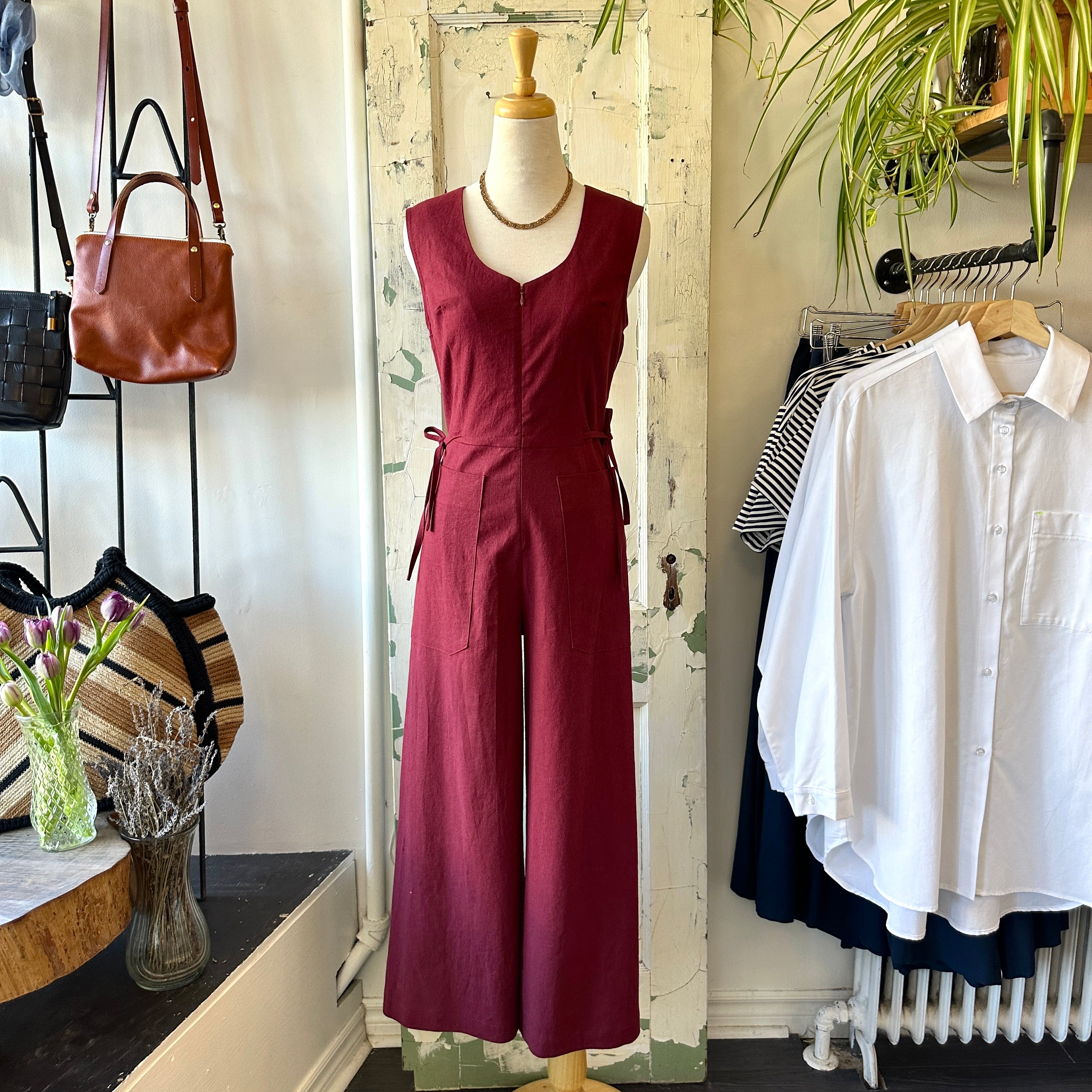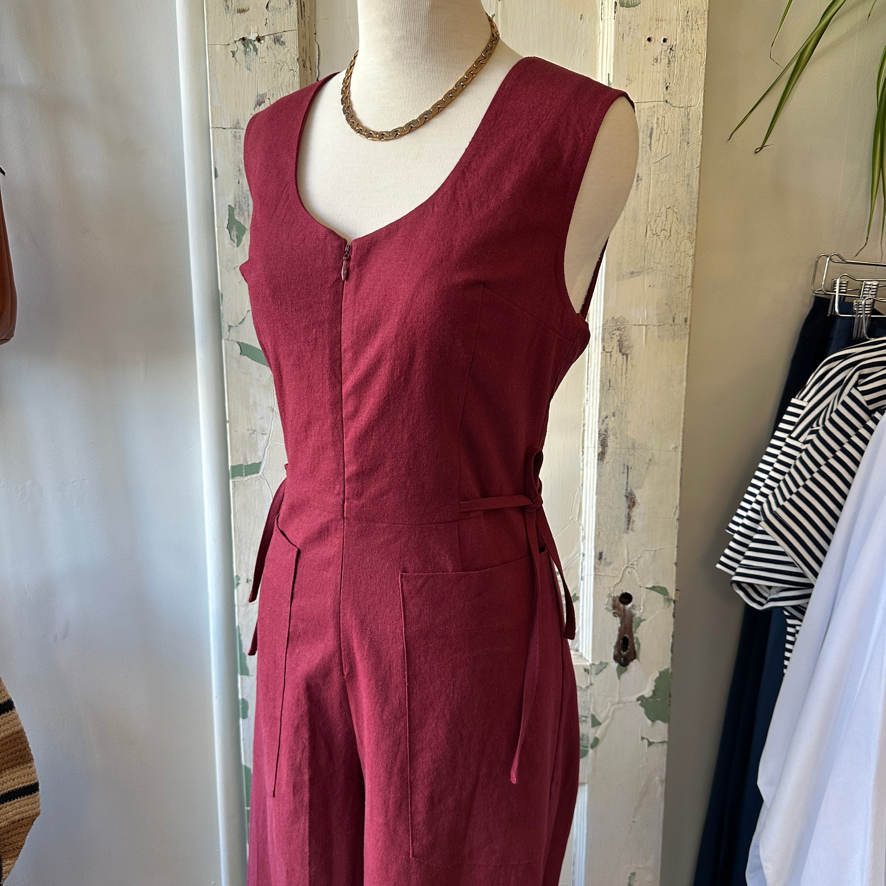 Sleeveless wide leg jumpsuit in stretch linen. Ties cinch in the waist. Scooped neckline. Front patch pockets. Centre front invisible zipper closure. Inseam measures 26". Fabric is pre-washed creating a lovely hand.