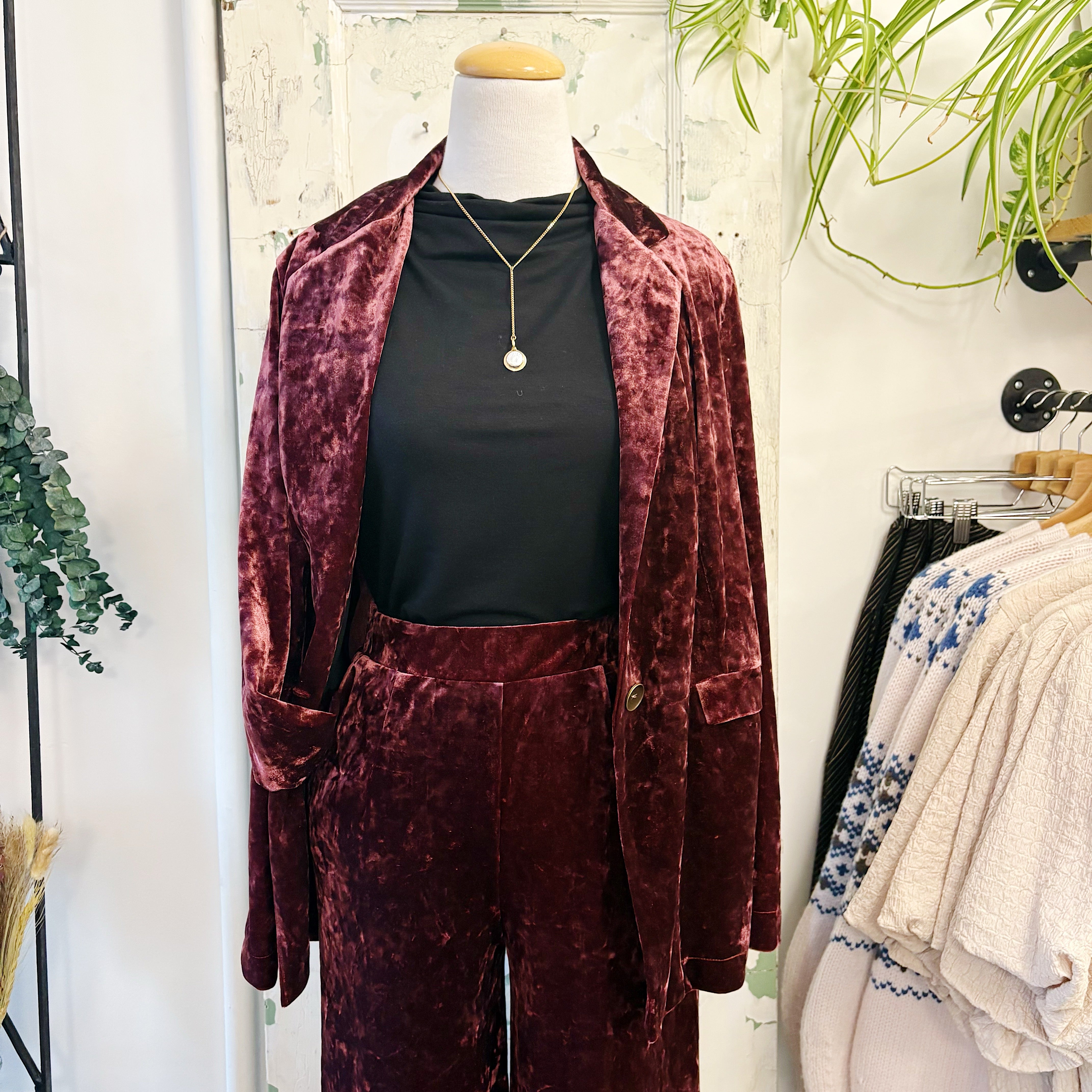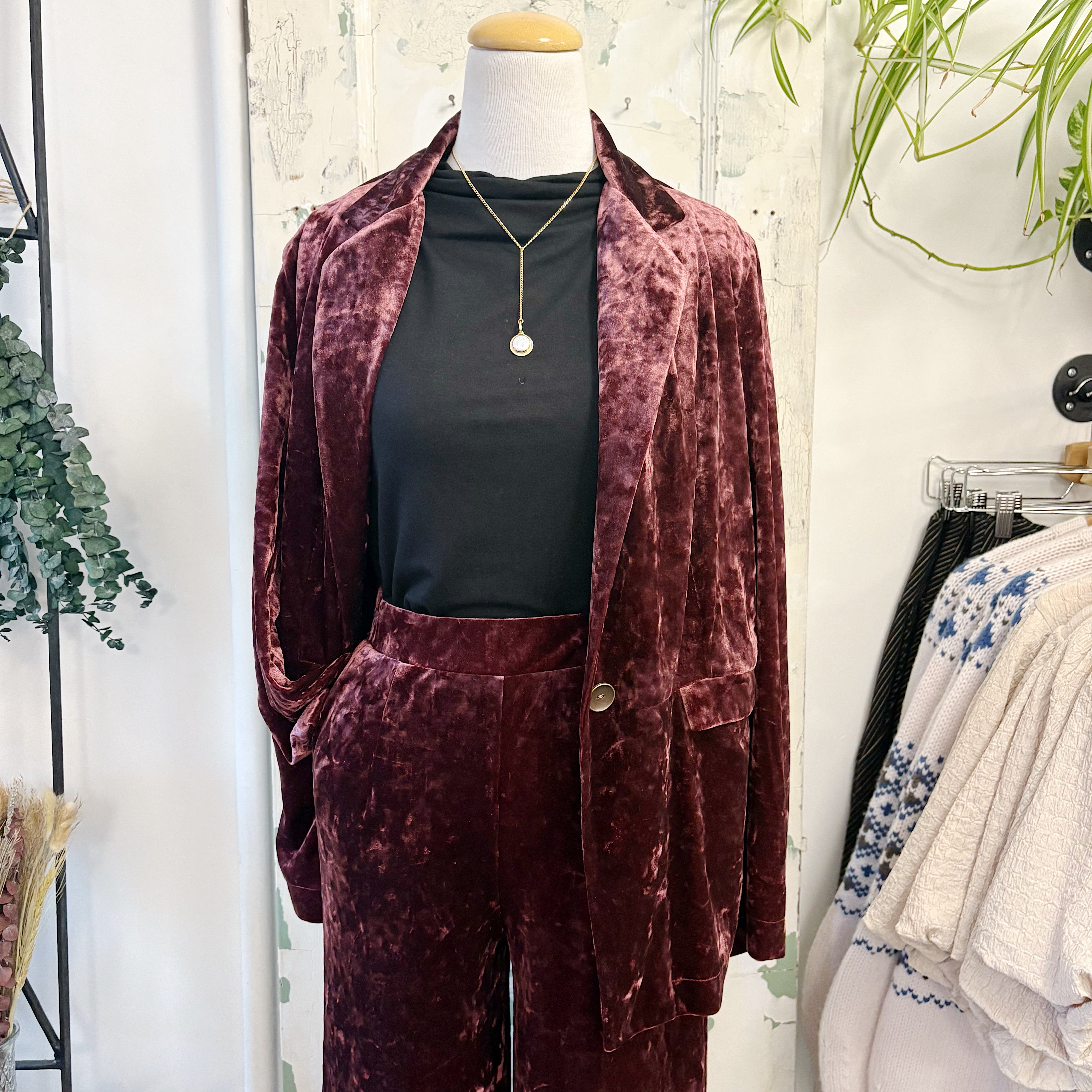 Looking for a way to dress up an outfit? Look no further than the Avaline Blazer. Crafted from soft and fluid crushed velvet, with a notched lapel and flap pockets. A great standalone piece, and even better with the matching Thomas Pants.