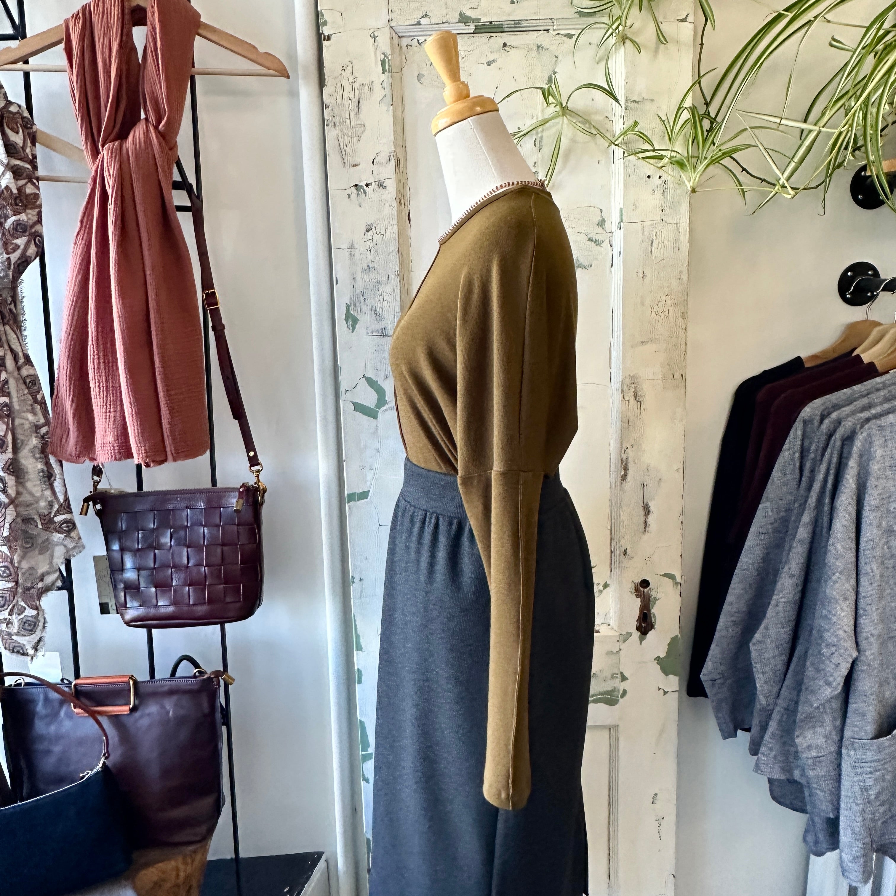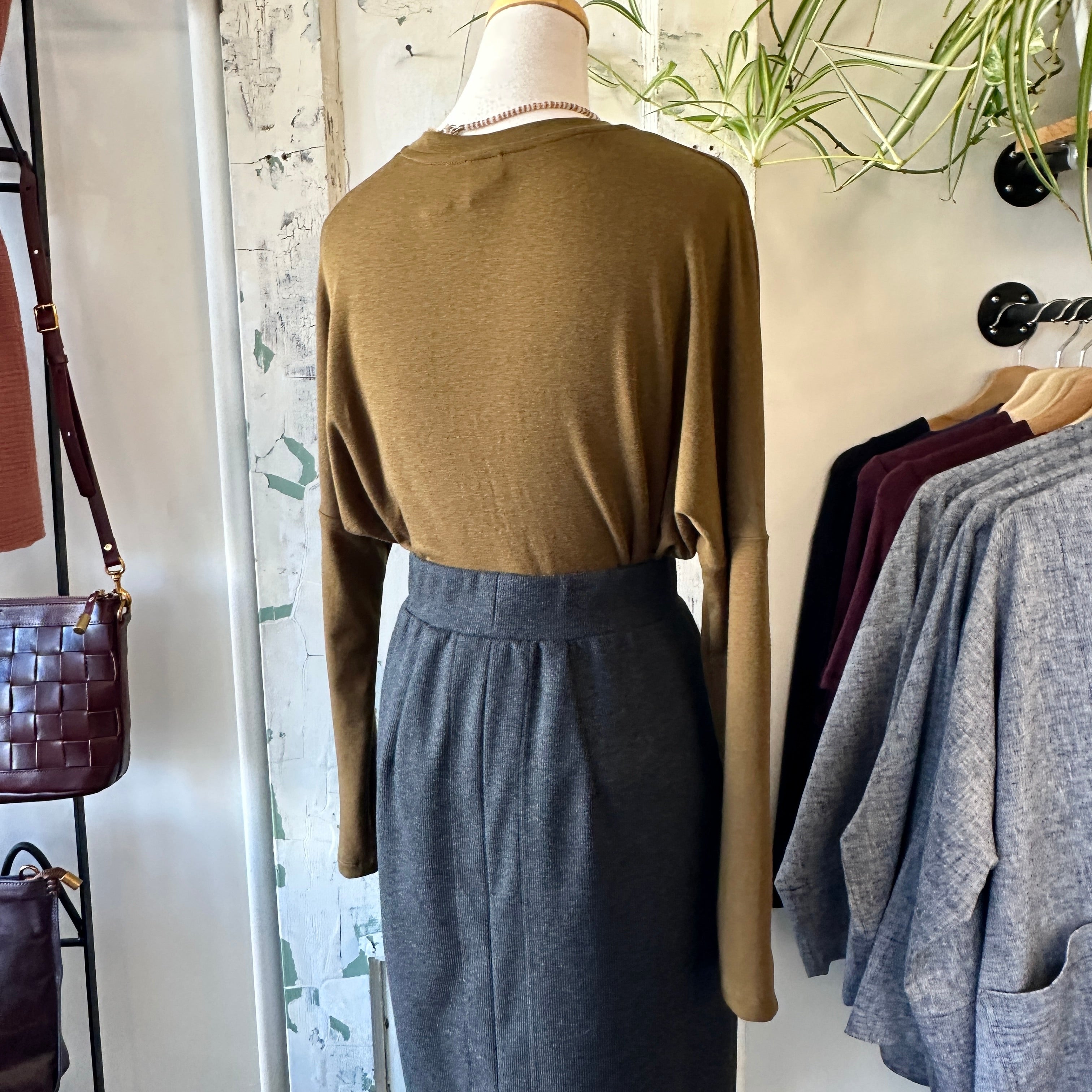 This top is part of Eve Gravel's "basics" collection with a round neck, long sleeves, and a slightly loose fit for optimal comfort. Its ribbed details at the center front and on the top of the sleeves add a subtle and refined touch. Made from a wool and lyocell blend, the fabric is incredibly soft, combining comfort and exceptional quality.