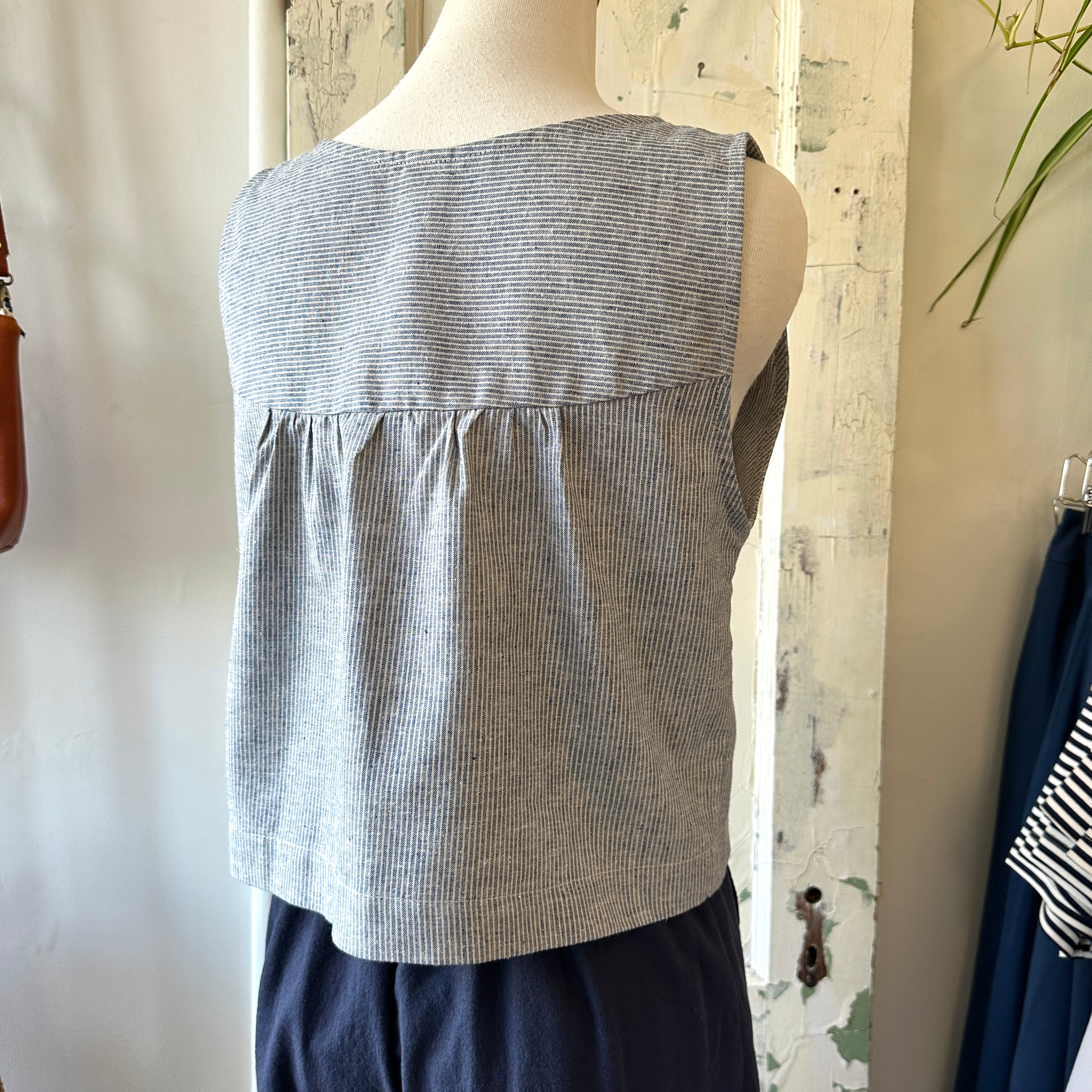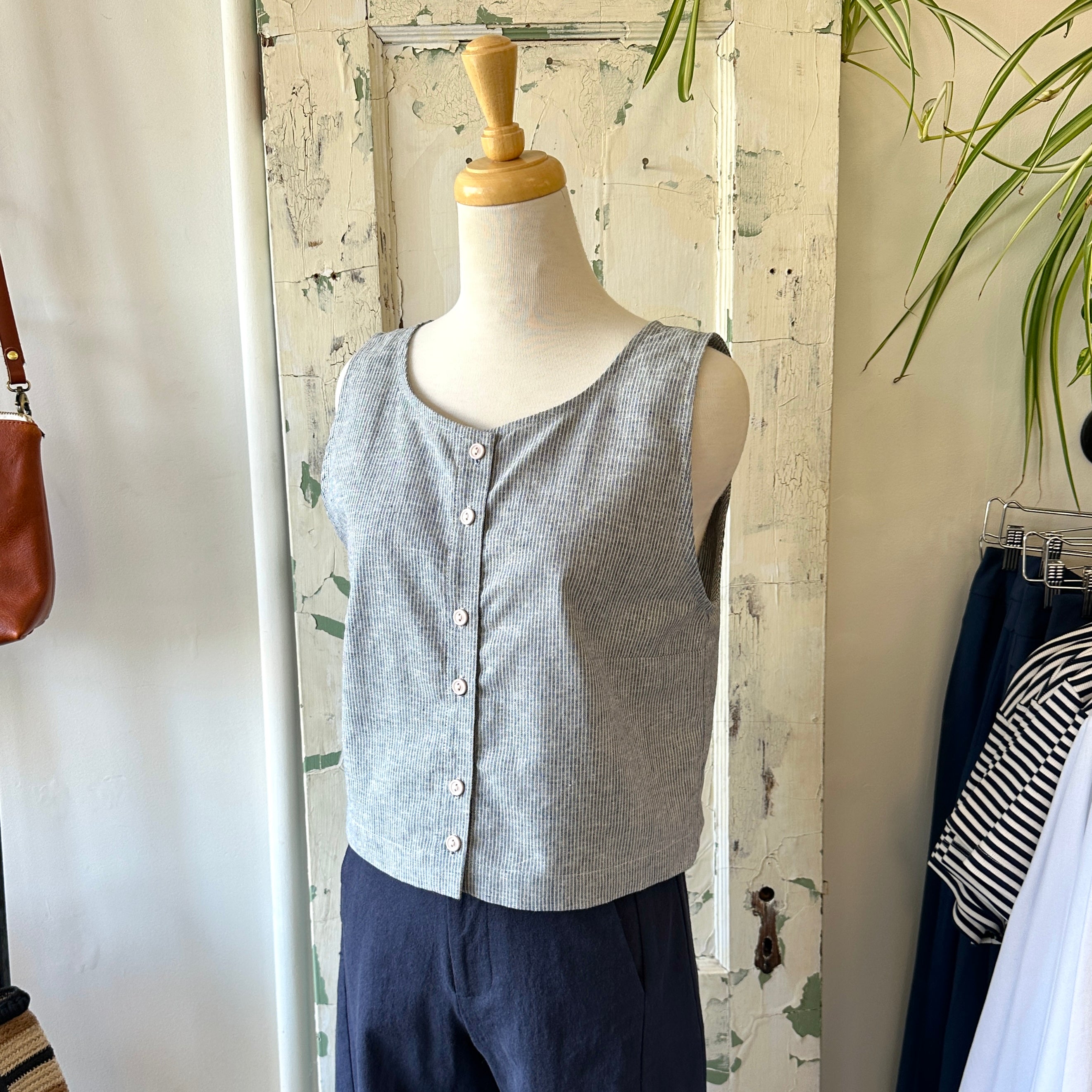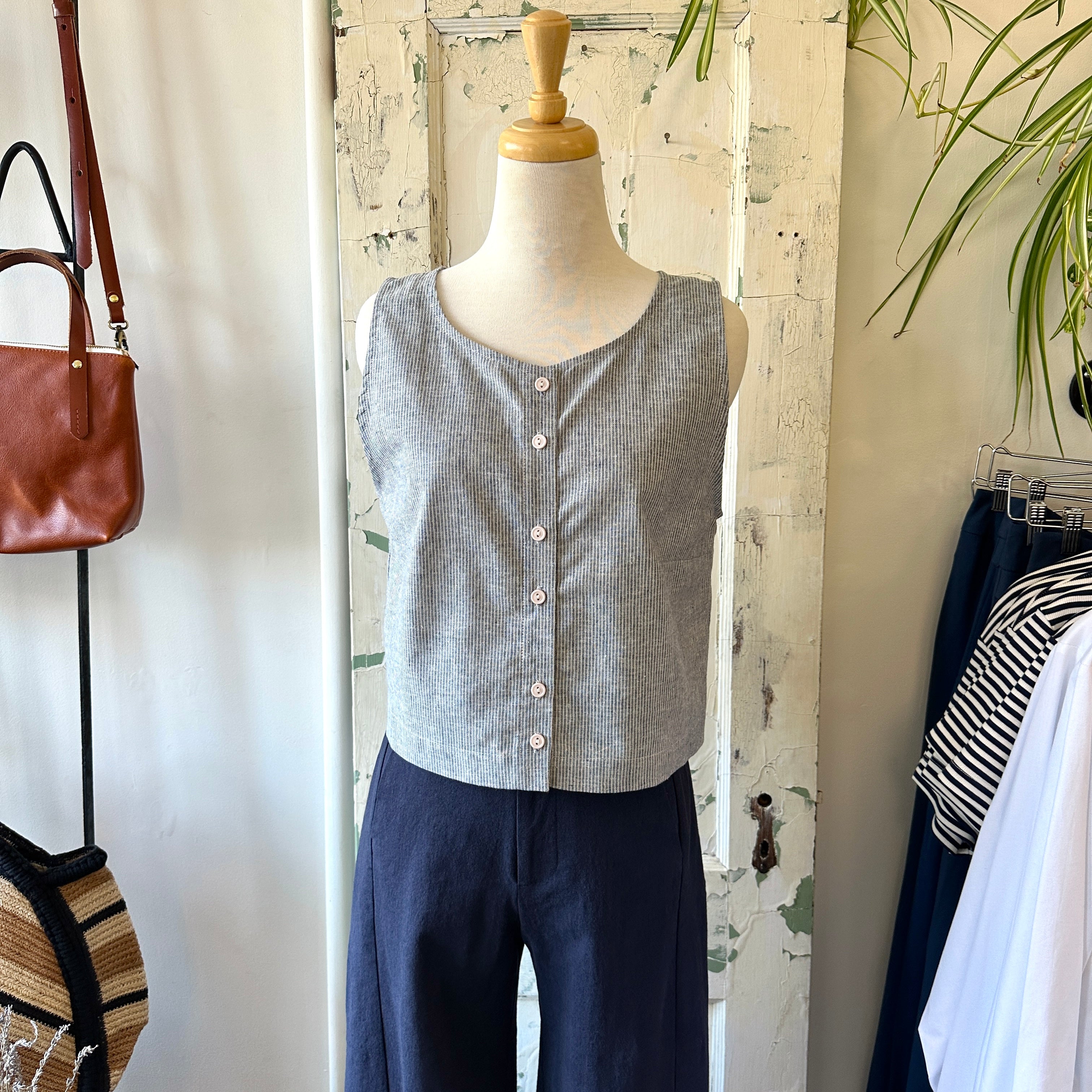 Choose this striped tank top with a stylish button placket. Its timeless cut, structured by front darts and back pleats, flatters the figure while ensuring a perfect drape. An easy-to-match basic, perfect for any occasion.