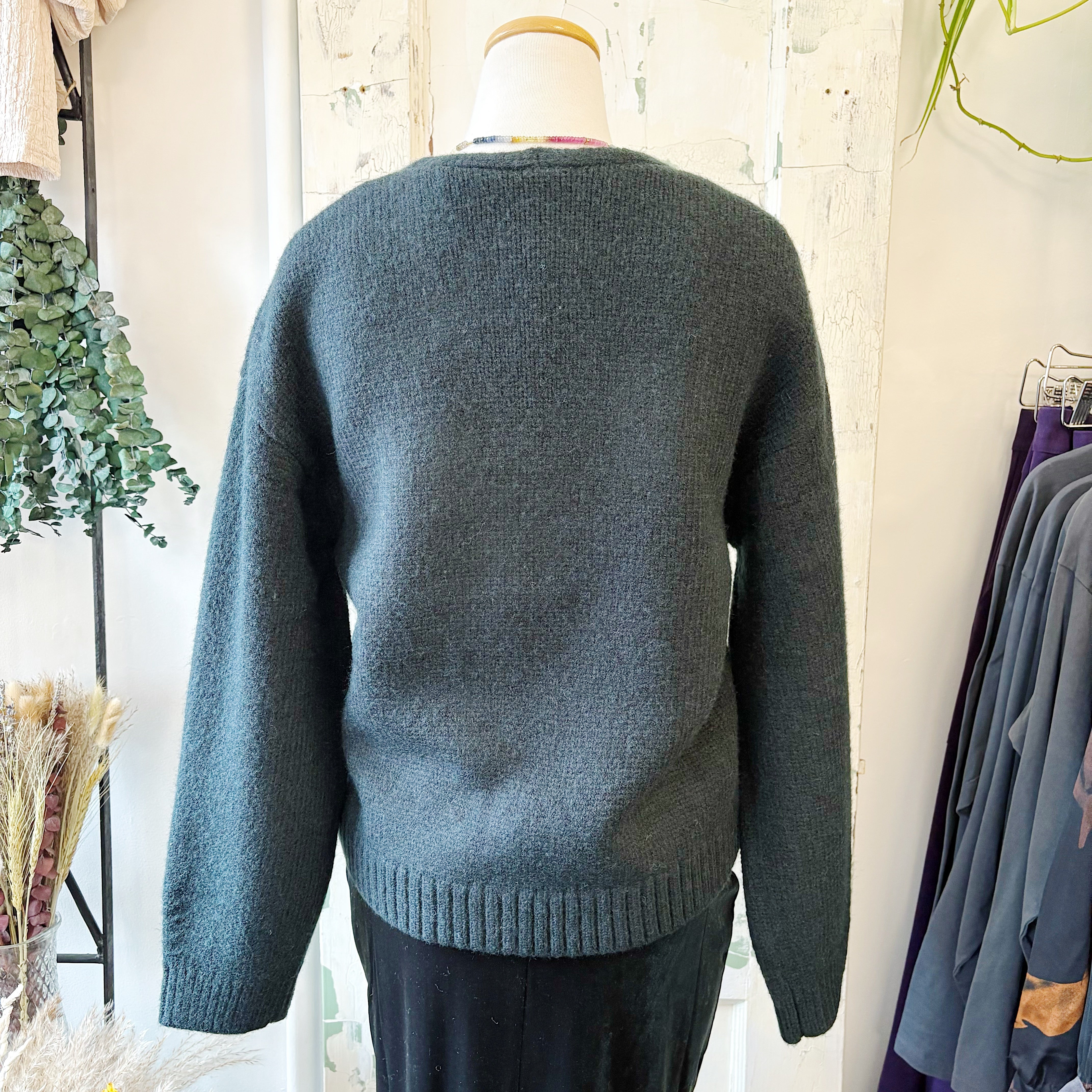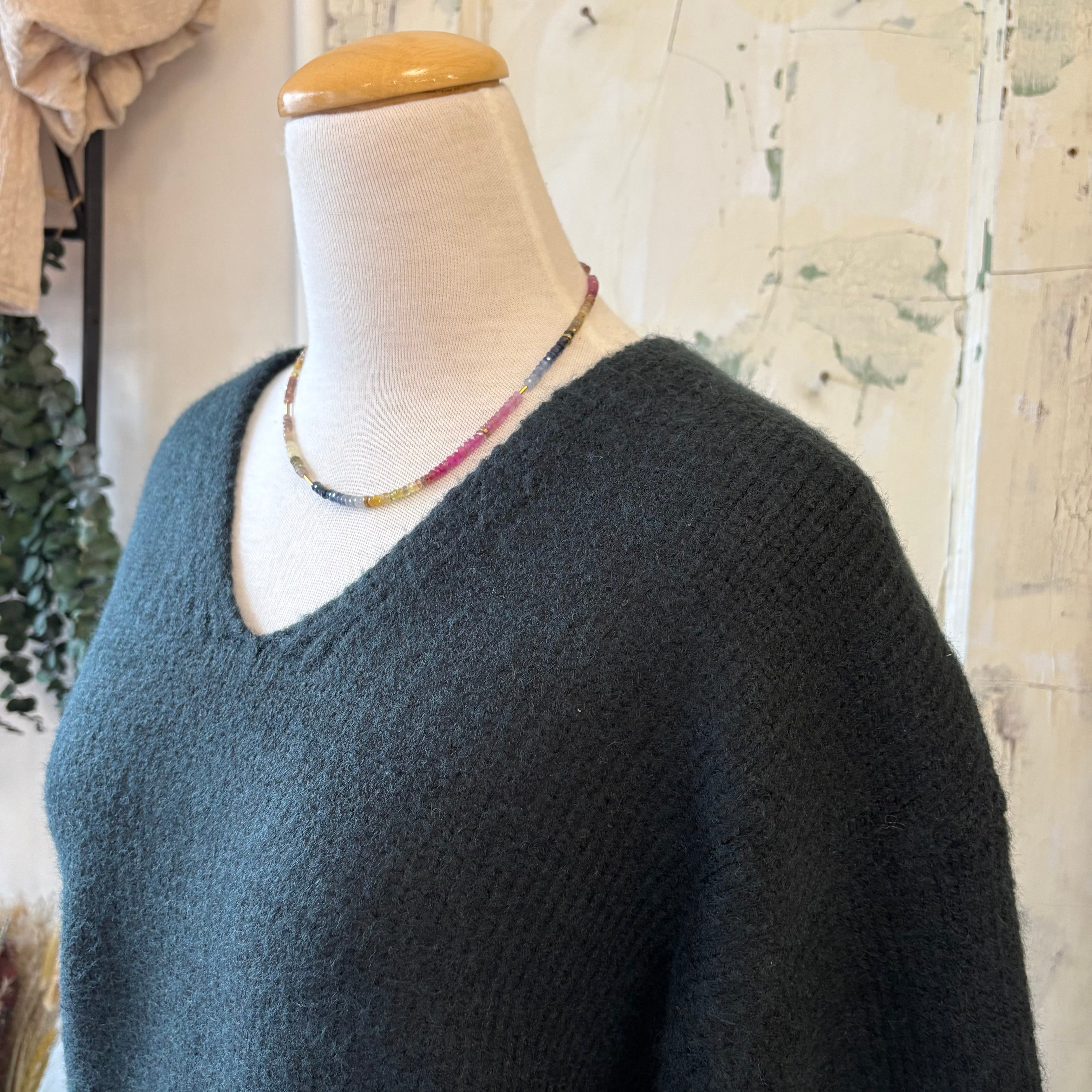 The Angelica sweater is made of a soft yarn in a jersey stitch pattern. Features include a v-neckline and rib along the sleeve and body hem