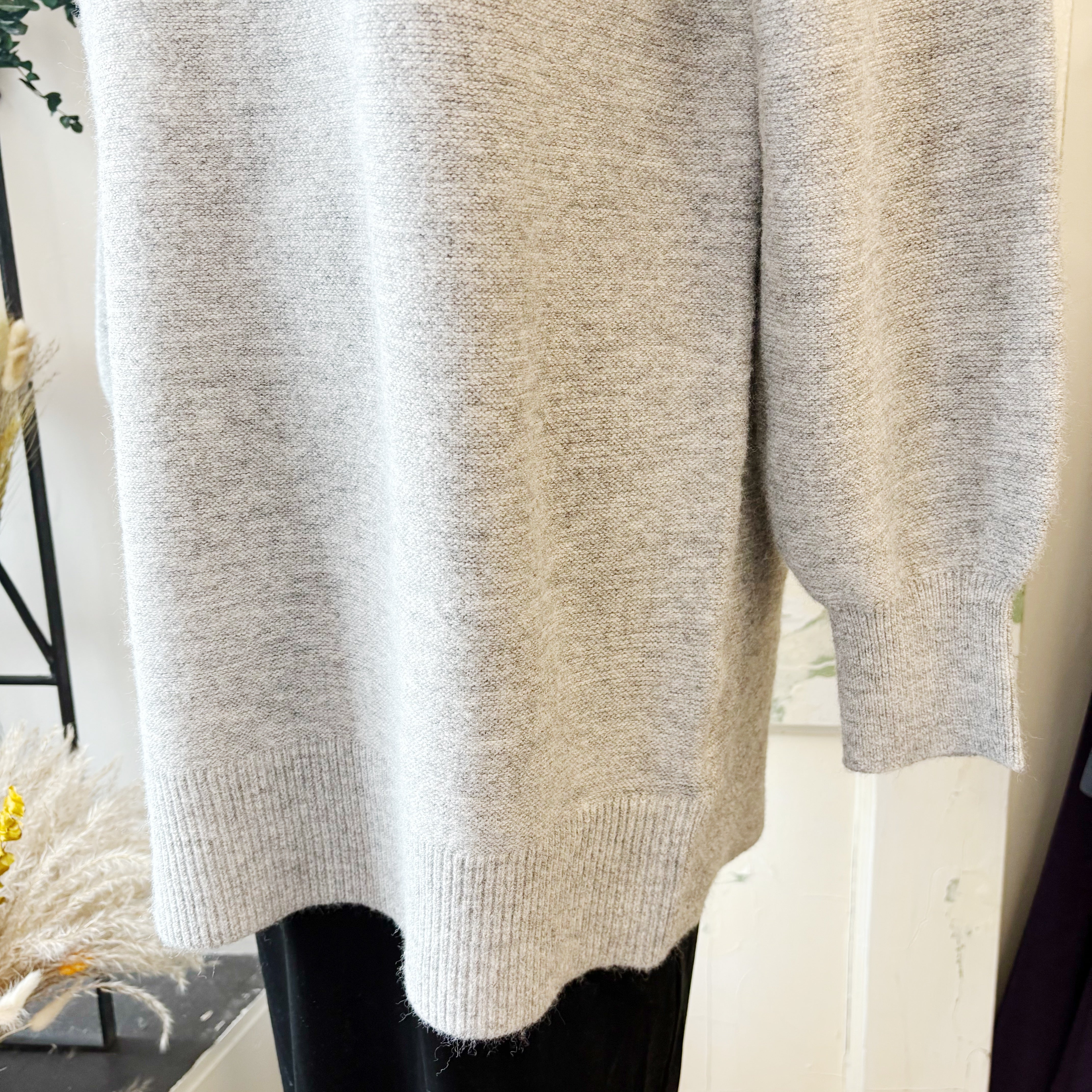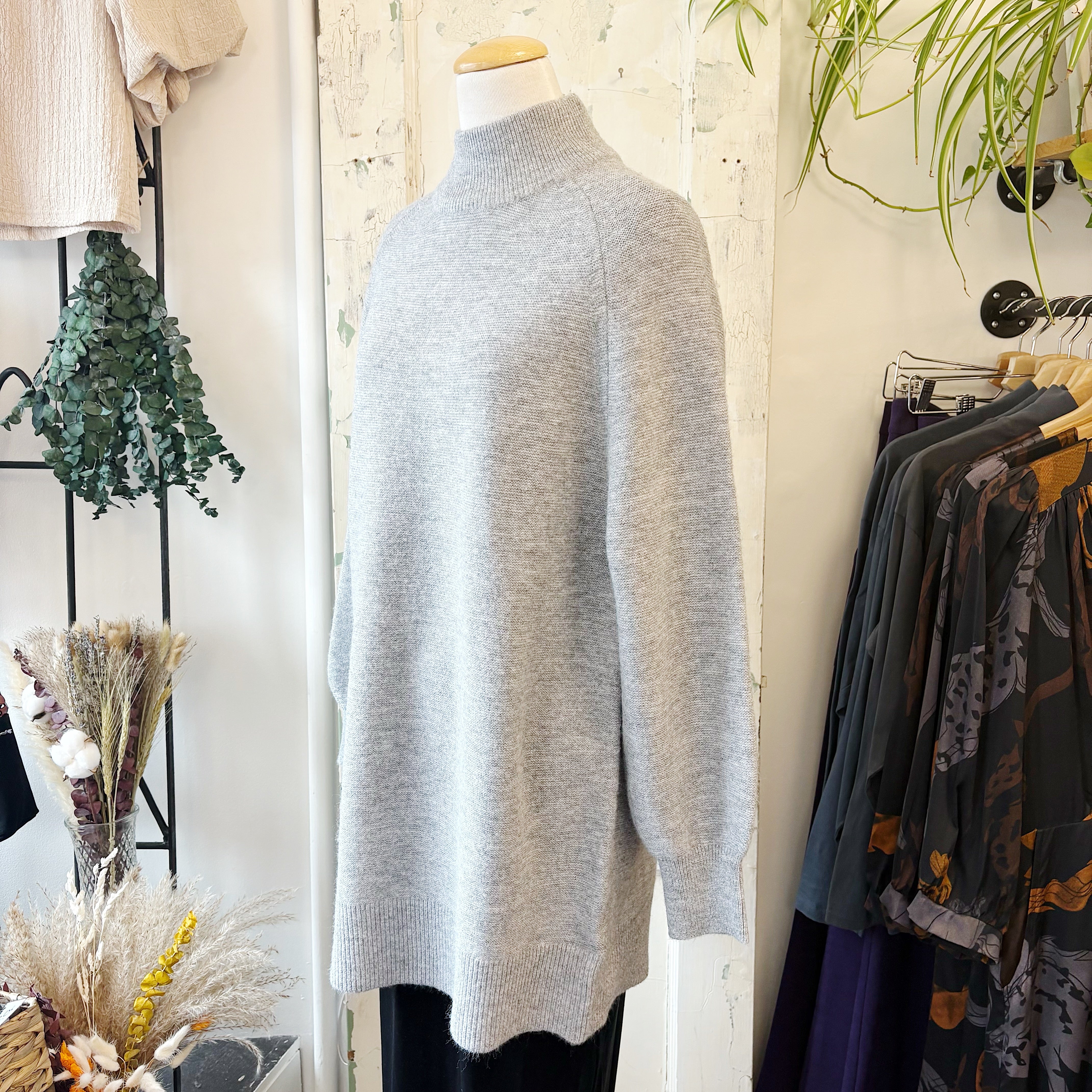 The Lena sweater is made of a soft yarn in a textured horizontal stitch pattern. Features include a mock neckline and exposed center back seam detail.