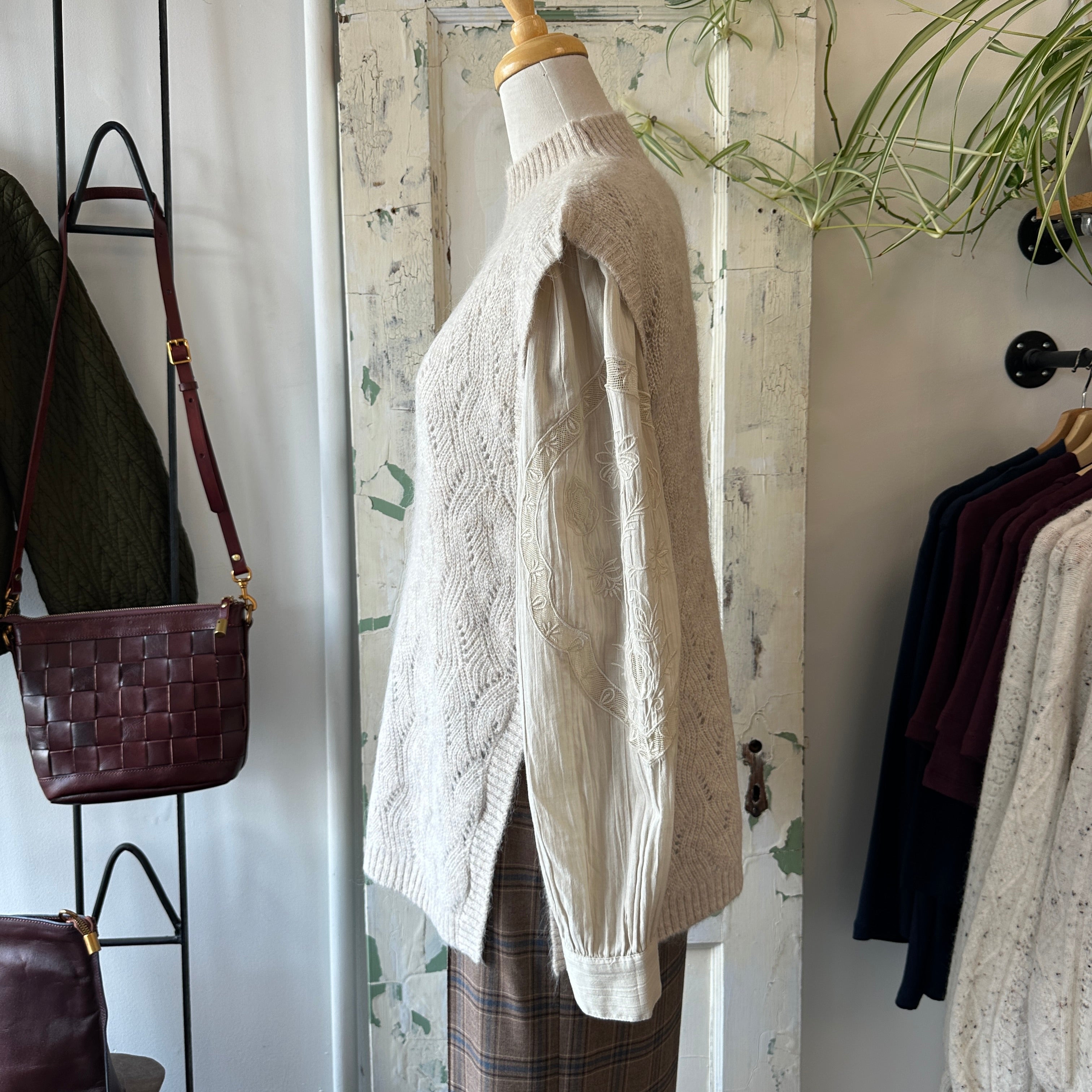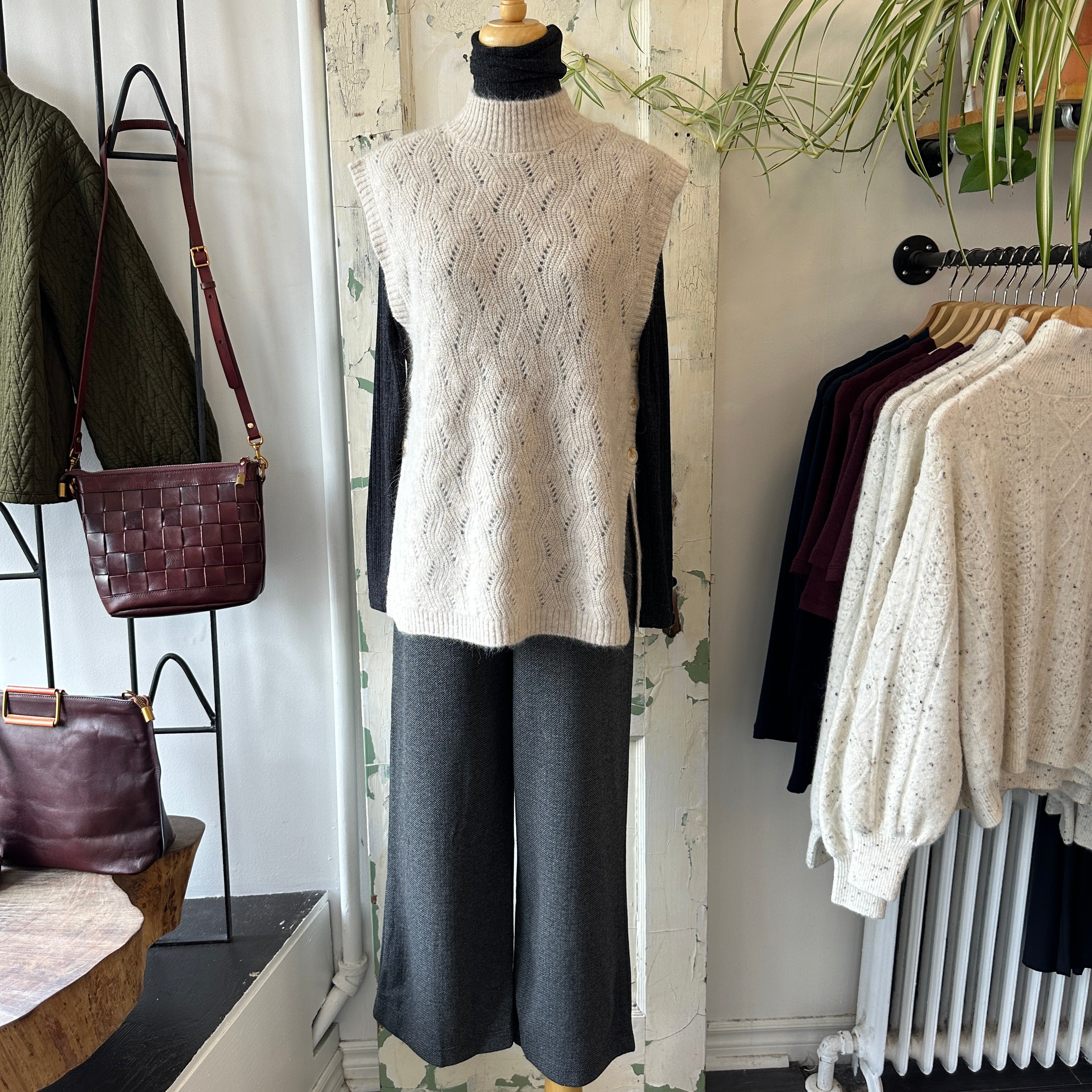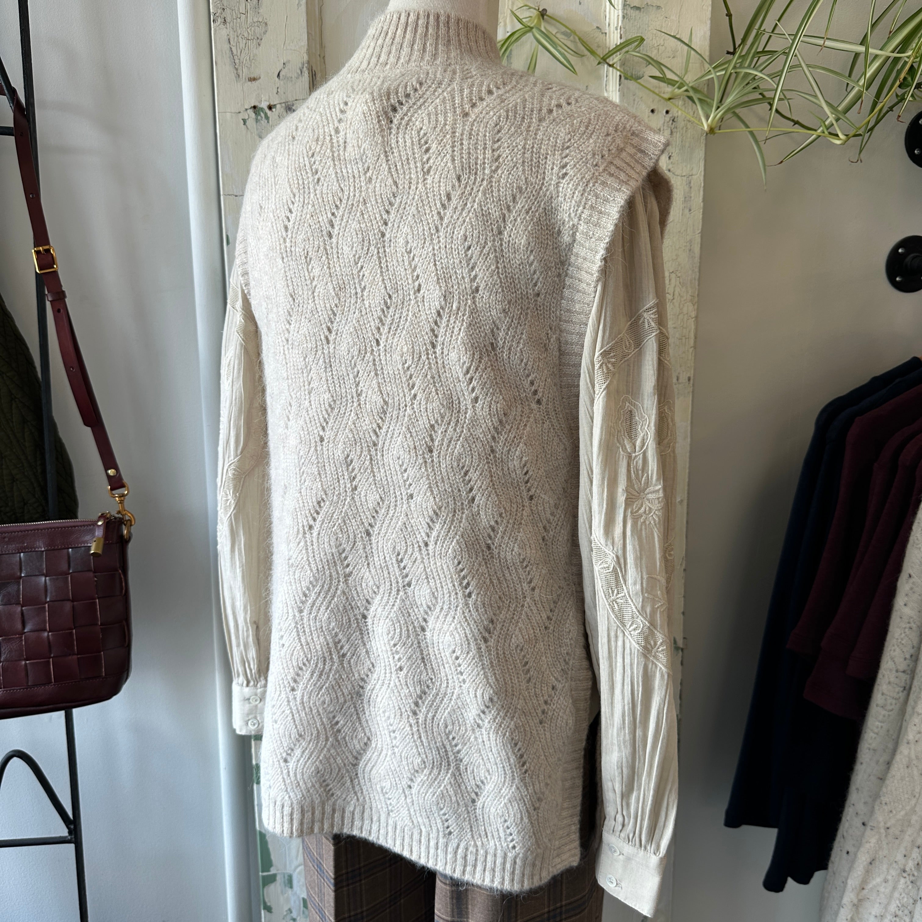 Crochet knitted vest with alpaca, featuring a stand-up collar and button closure on the sides. It also has slits and is perfect to wear over a romantic shirt.