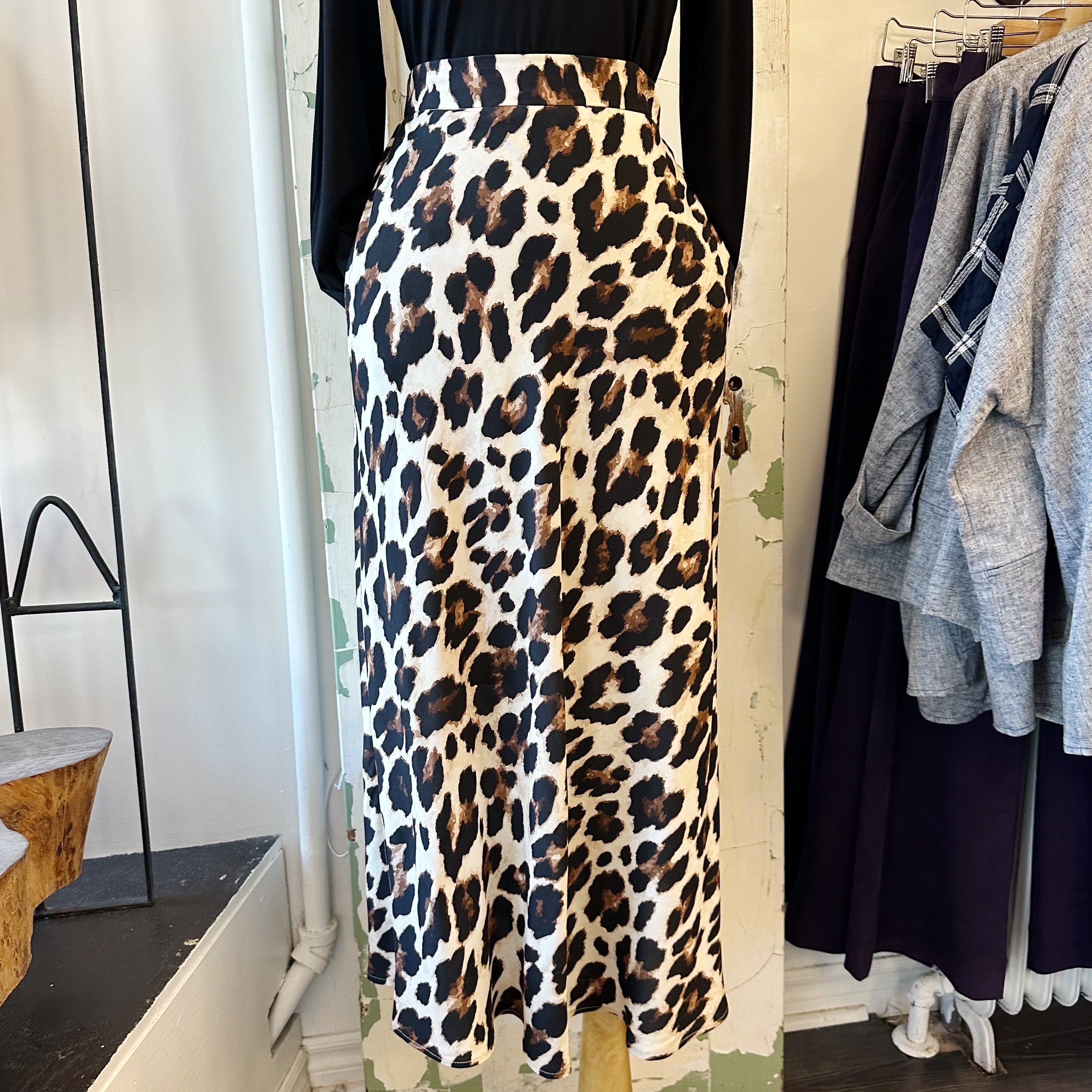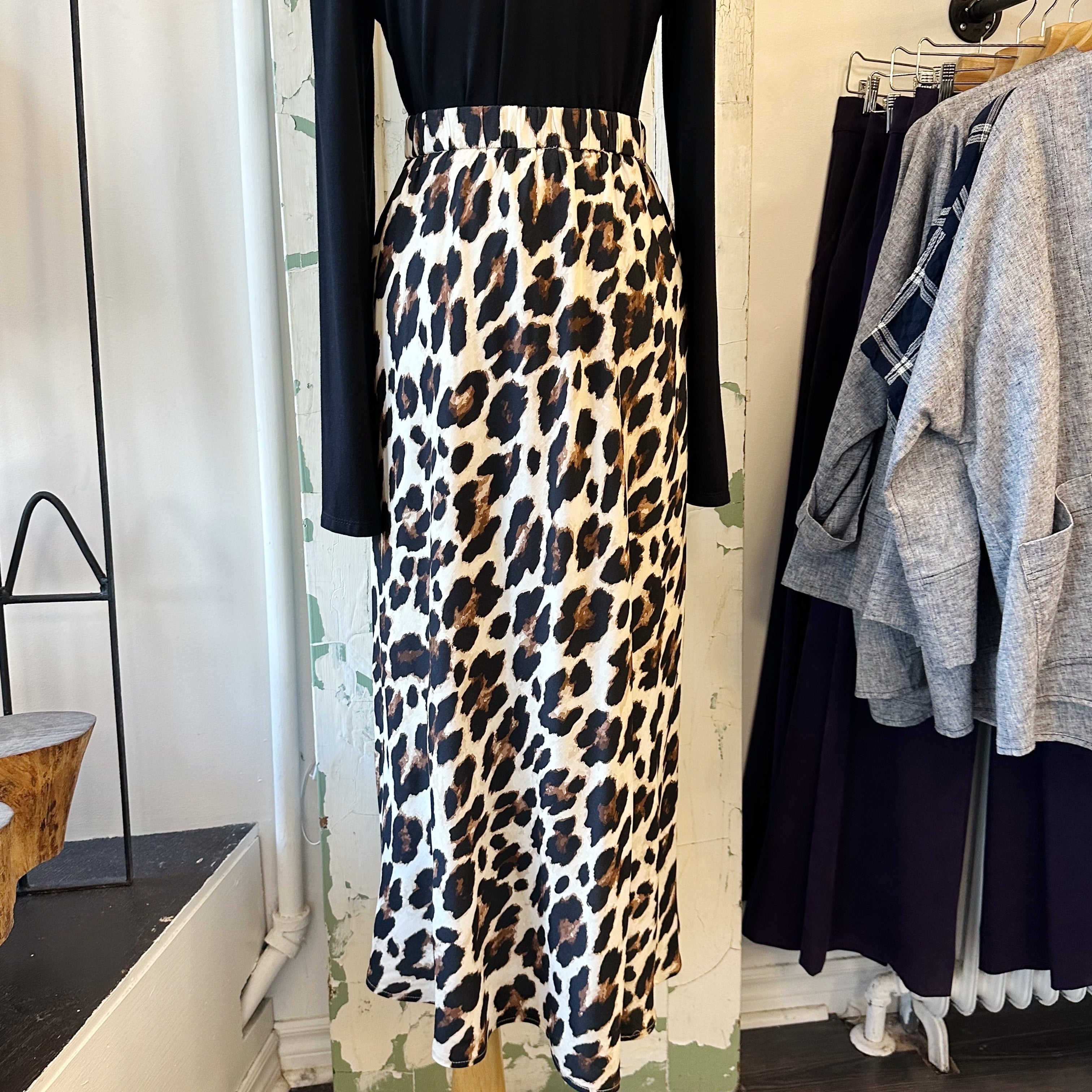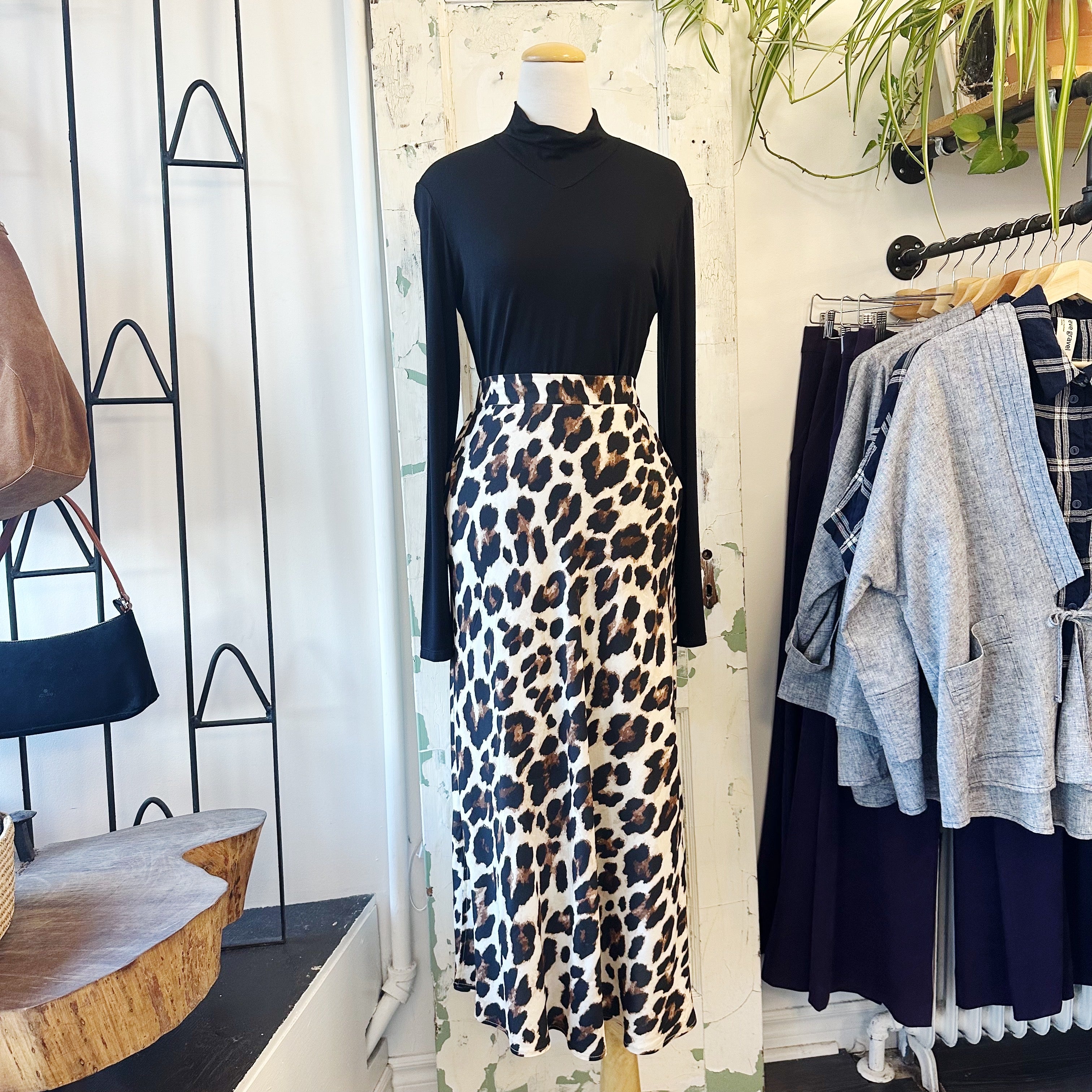 The Fran Skirt is a flowy leopard print midi skirt designed with a side slit and gartered waist for a relaxed yet flattering fit. Complete with side pockets, it's the perfect piece for staying stylish and comfortable through the party season. Style it with a silk blouse and your favorite heels for an effortlessly sleek look, or an oversized sweater and boots.
