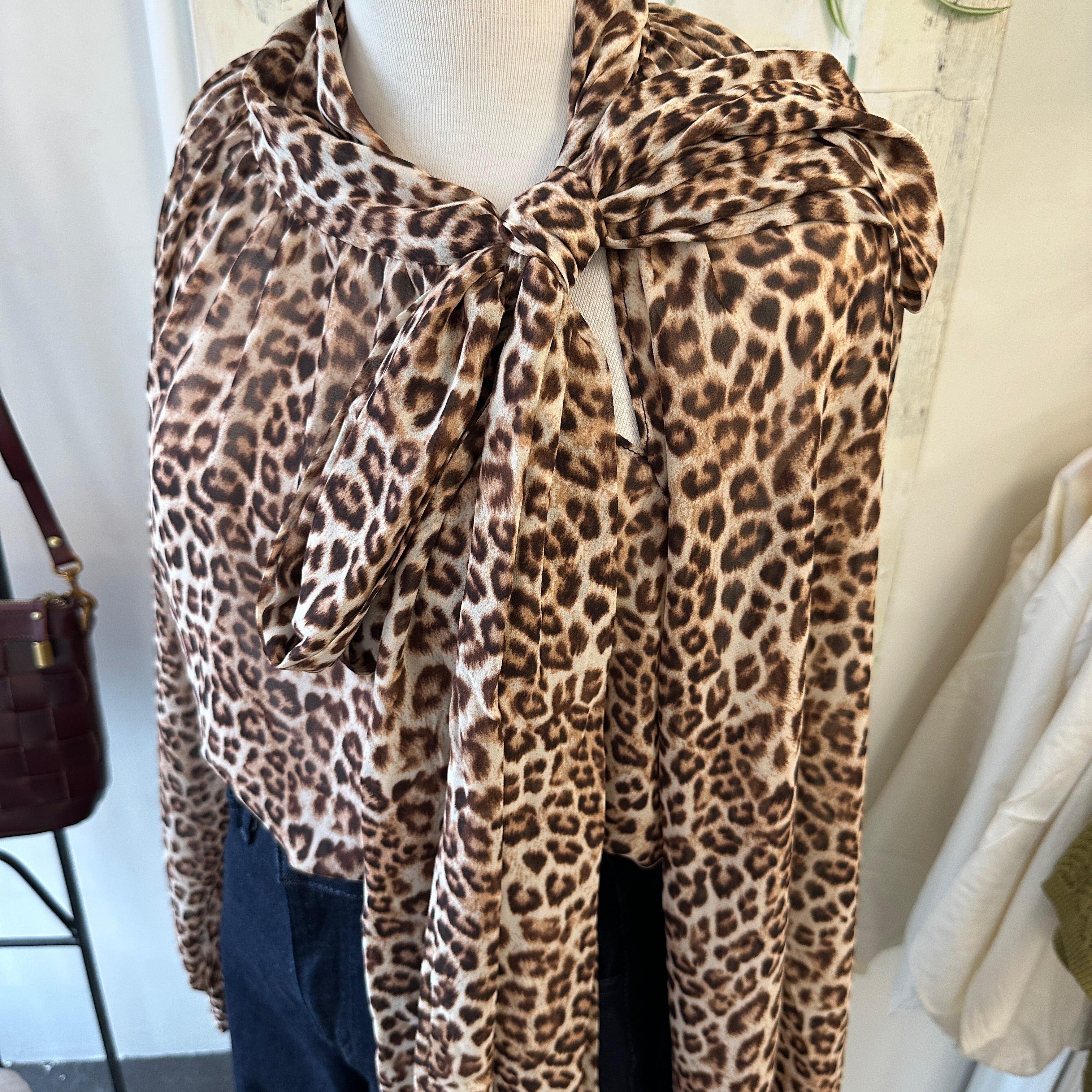 The Globe in Leopard Blouse features sheer leopard print fabric and voluminous sleeves for a bold look. Its neckline is finished with a pussybow, giving you options to style it in different ways. This blouse is made for confident women who like classic fashion with a distinctive twist.