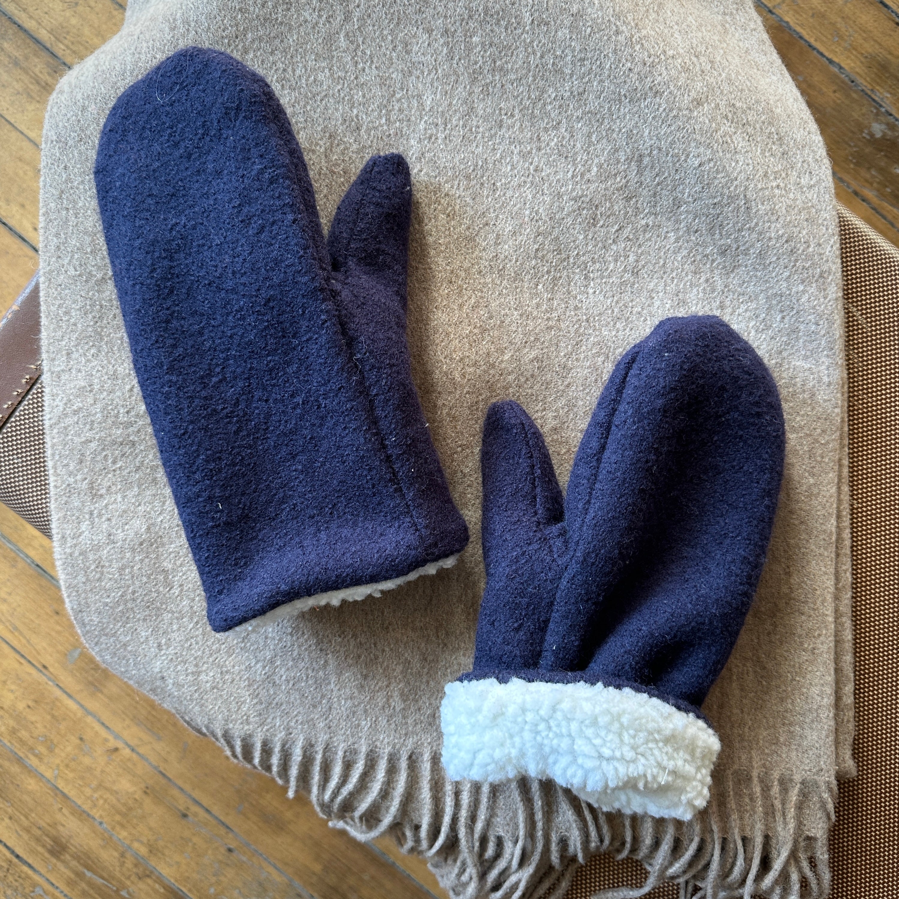 These classic boiled wool mittens have an all natural sherpa lining and an invisible elastic for a comfortable and a refined look. The wool used is 100% merino wool.