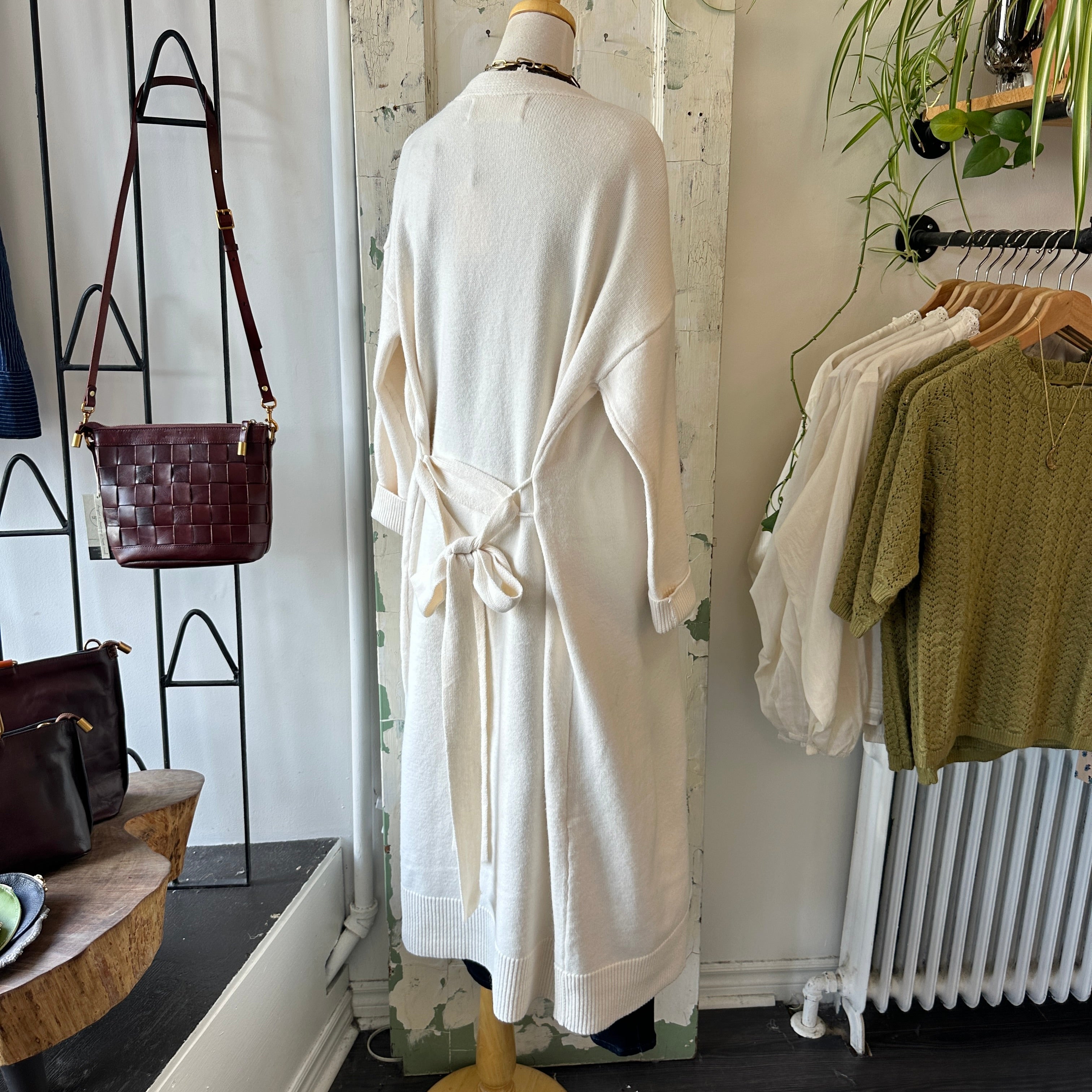 Wrap yourself up in this cozy maxi-length cardigan. The Kiki sweater features a robe-like cut, with a drop shoulder and attached belt. Ribbed hem and cuffs.