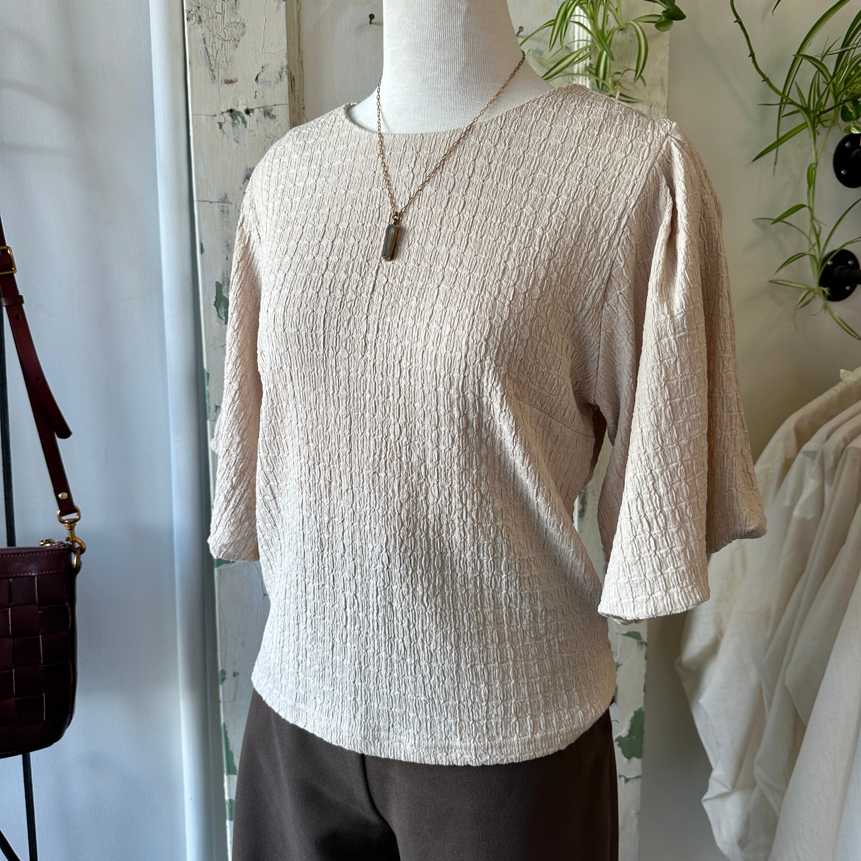 Puffed sleeves and a textured fabric with a relaxed fit, makes this top a stand-out that's easy to wear. Pair with denim or some high waisted trousers for a great work outfit.