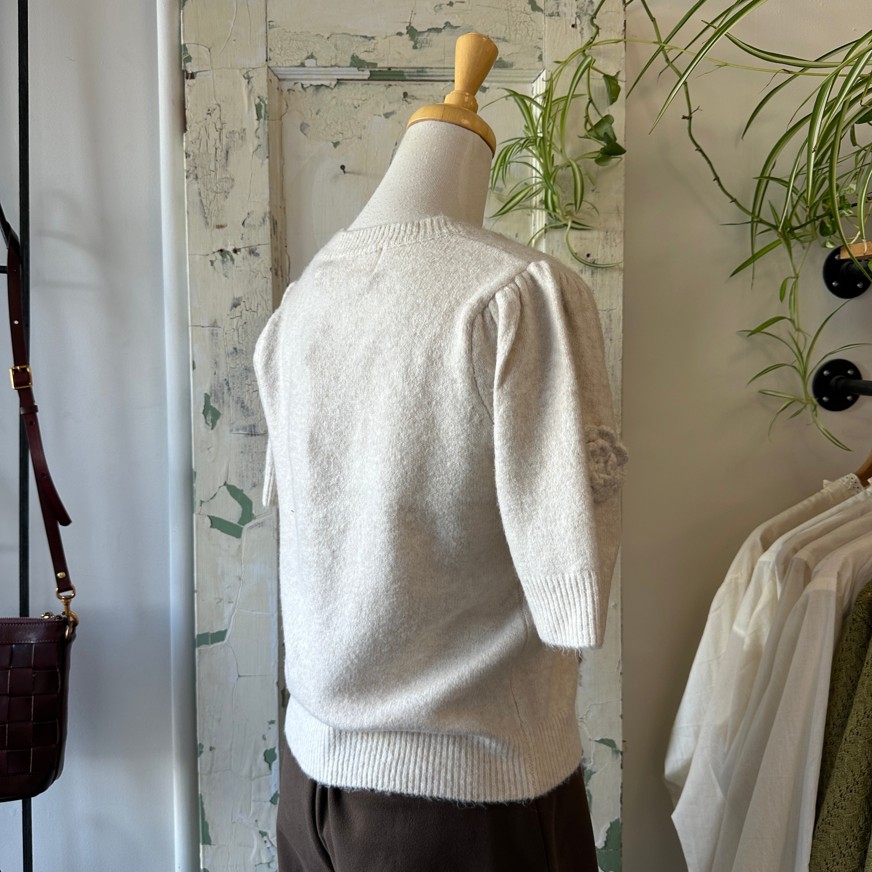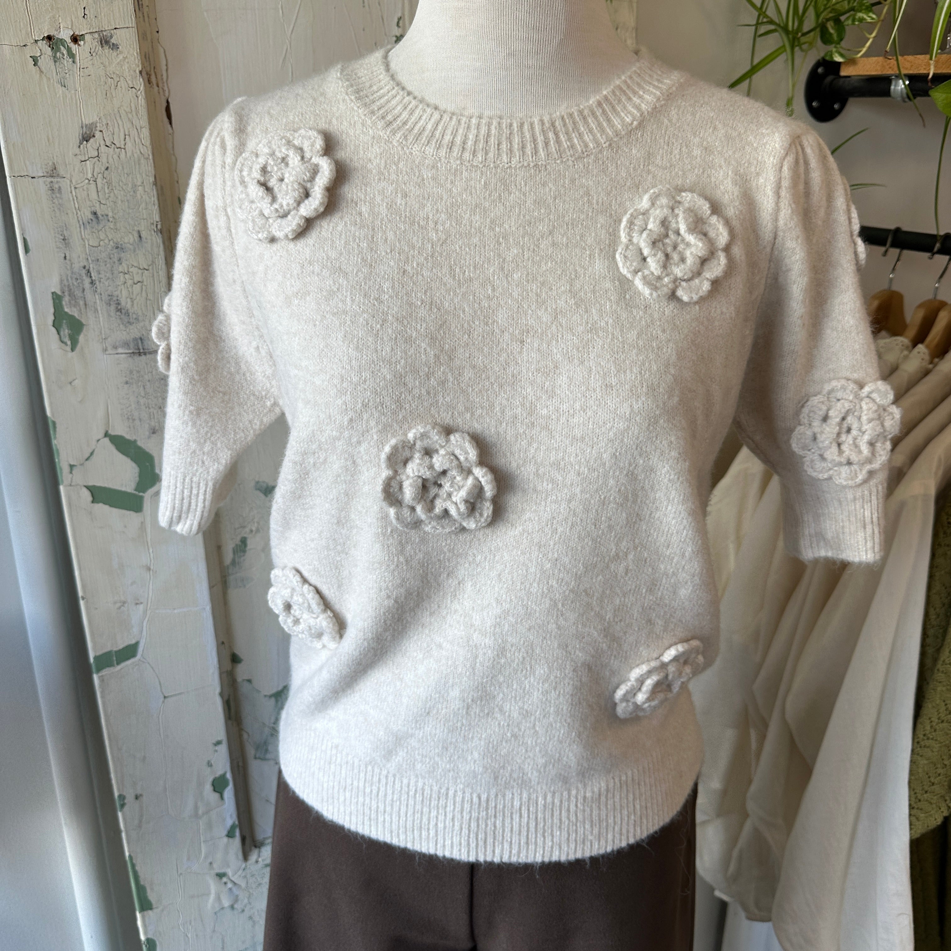 The Roslyn Sweater is a cozy, timeless piece with rosette details that make it a standout statement. It combines classic comfort with unique, eye-catching design.