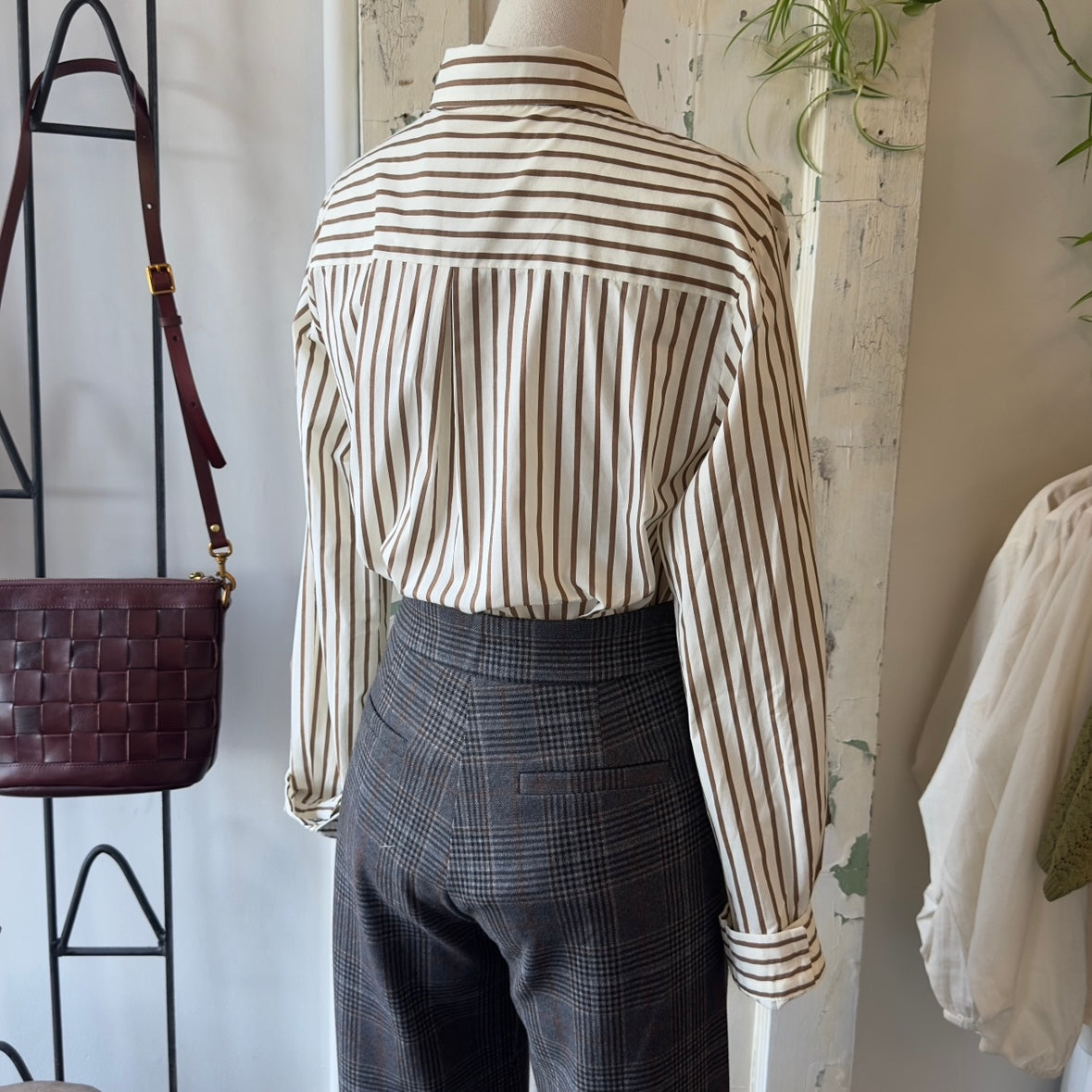 The Sapphire Top is a striped button-up shirt with pearlized buttons. Designed with a classic collar, buttoned cuffs, it's a versatile staple that can be layered under a sweater for a preppy look or worn on its own with jeans for effortless everyday style. Relaxed fit.