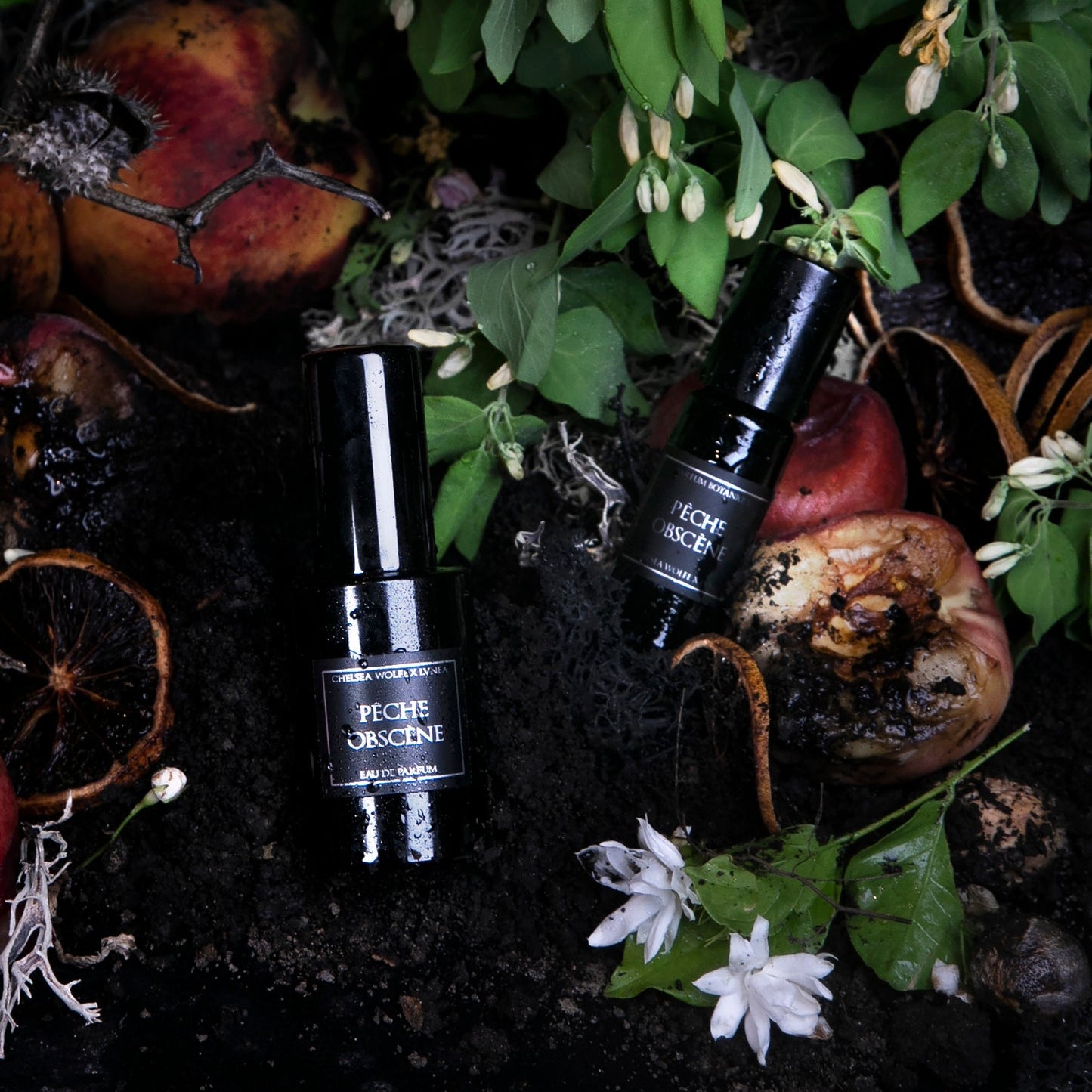 Fleshy, unctuous peach blends with silken jasmine into a deeply enticing and heady scent, overlaid atop a lush, earthy base of aged patchouli, vetiver, moss, and wood. Fall deep under the spell of ripe fruit and the damp, velvet soil below.