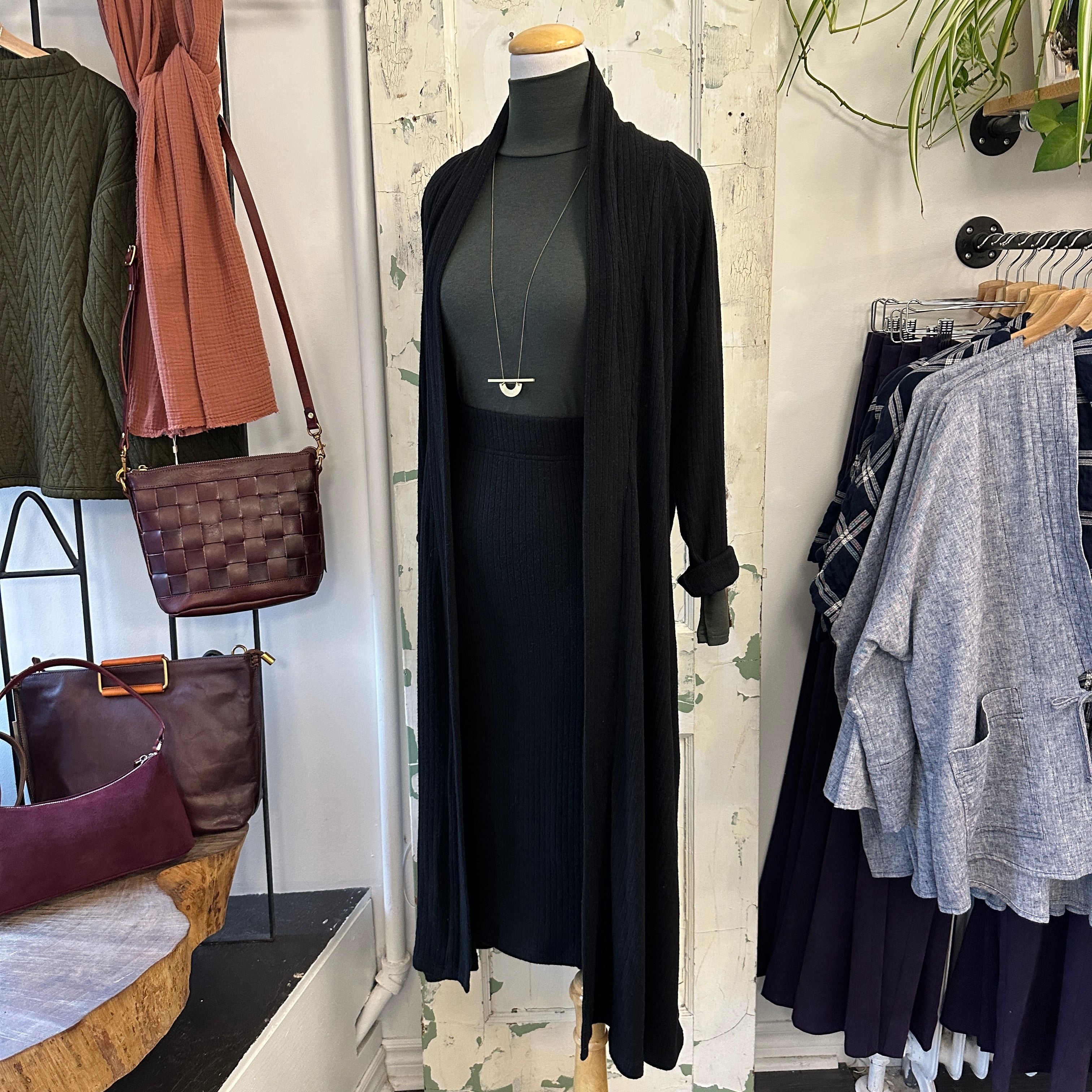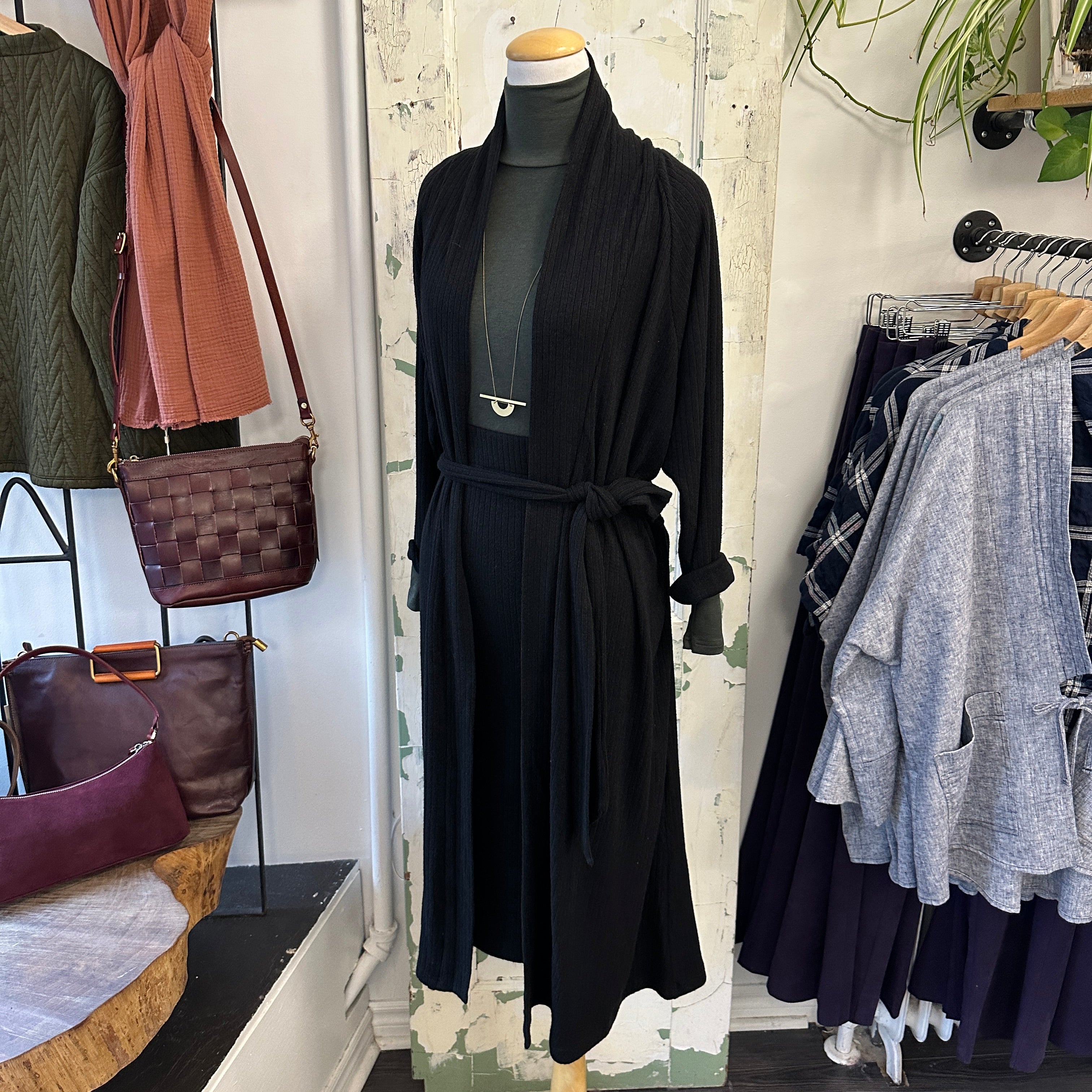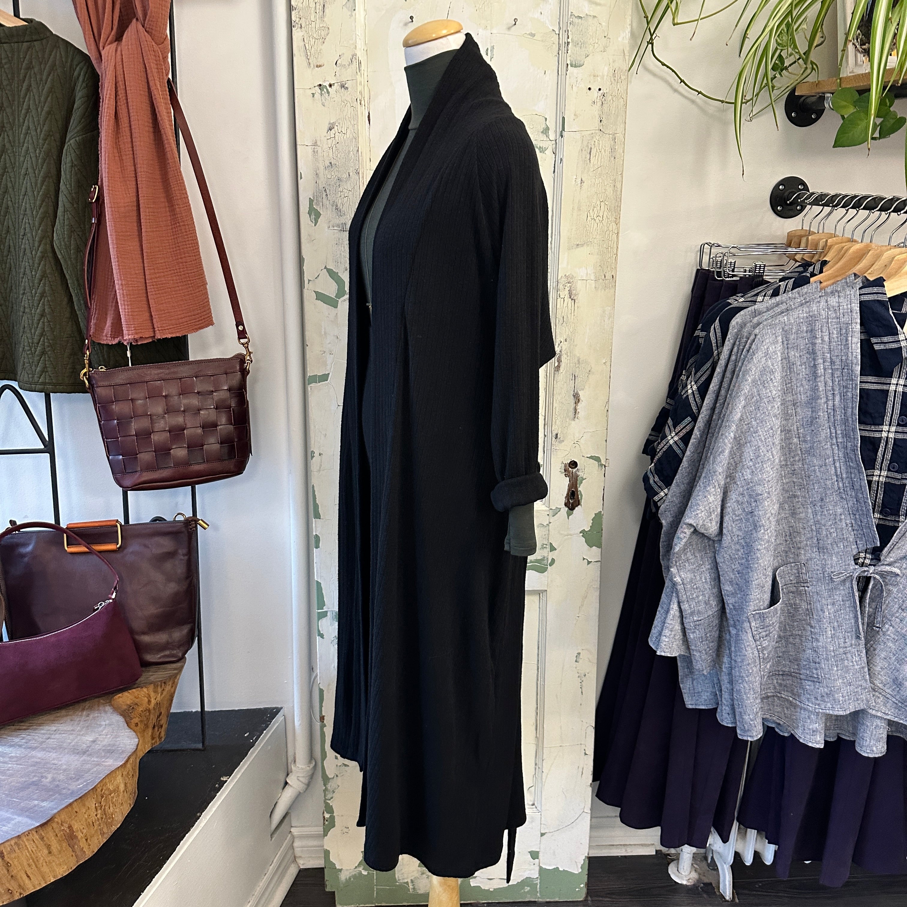 A long duster cardigan with a shawl collar. A first for us! I’ve always loved long cardis and finally found the right fabric. The fabric has a thick rib fuzzy texture. It looks cute open with the belt tied at the back over jeans. Wear it with the matching Fog Skirt.