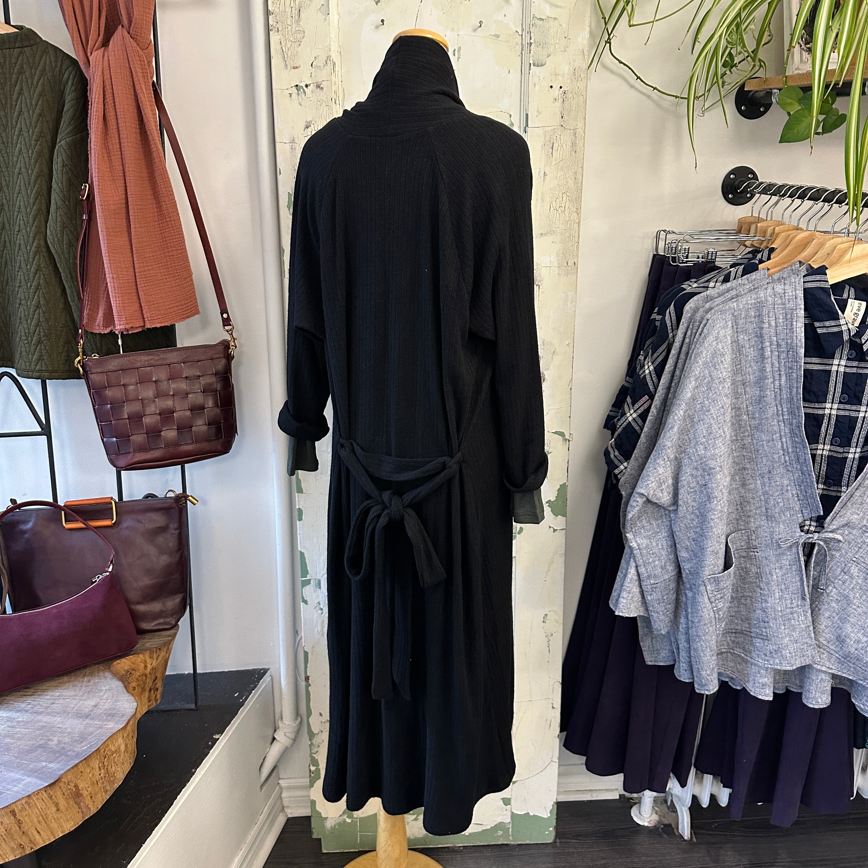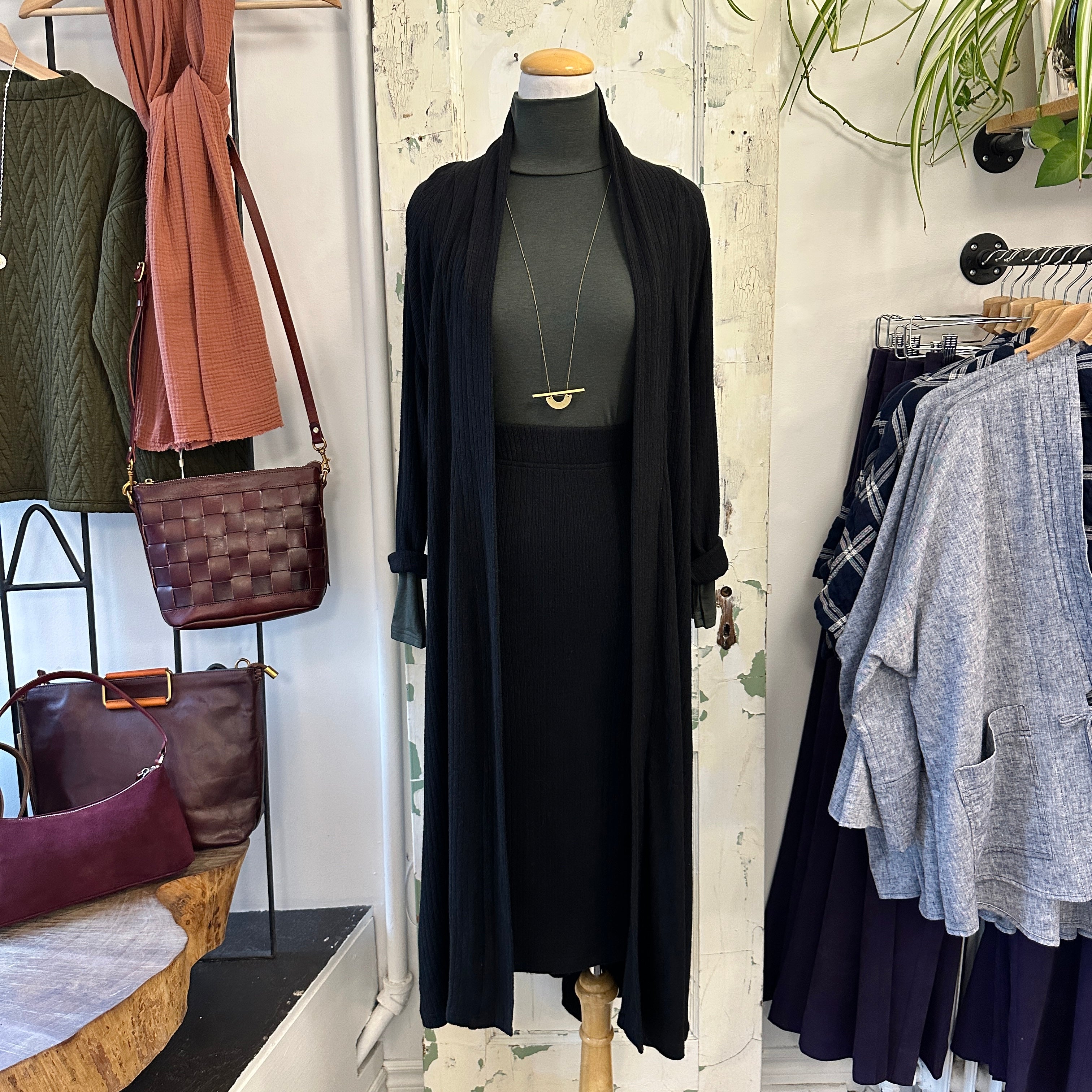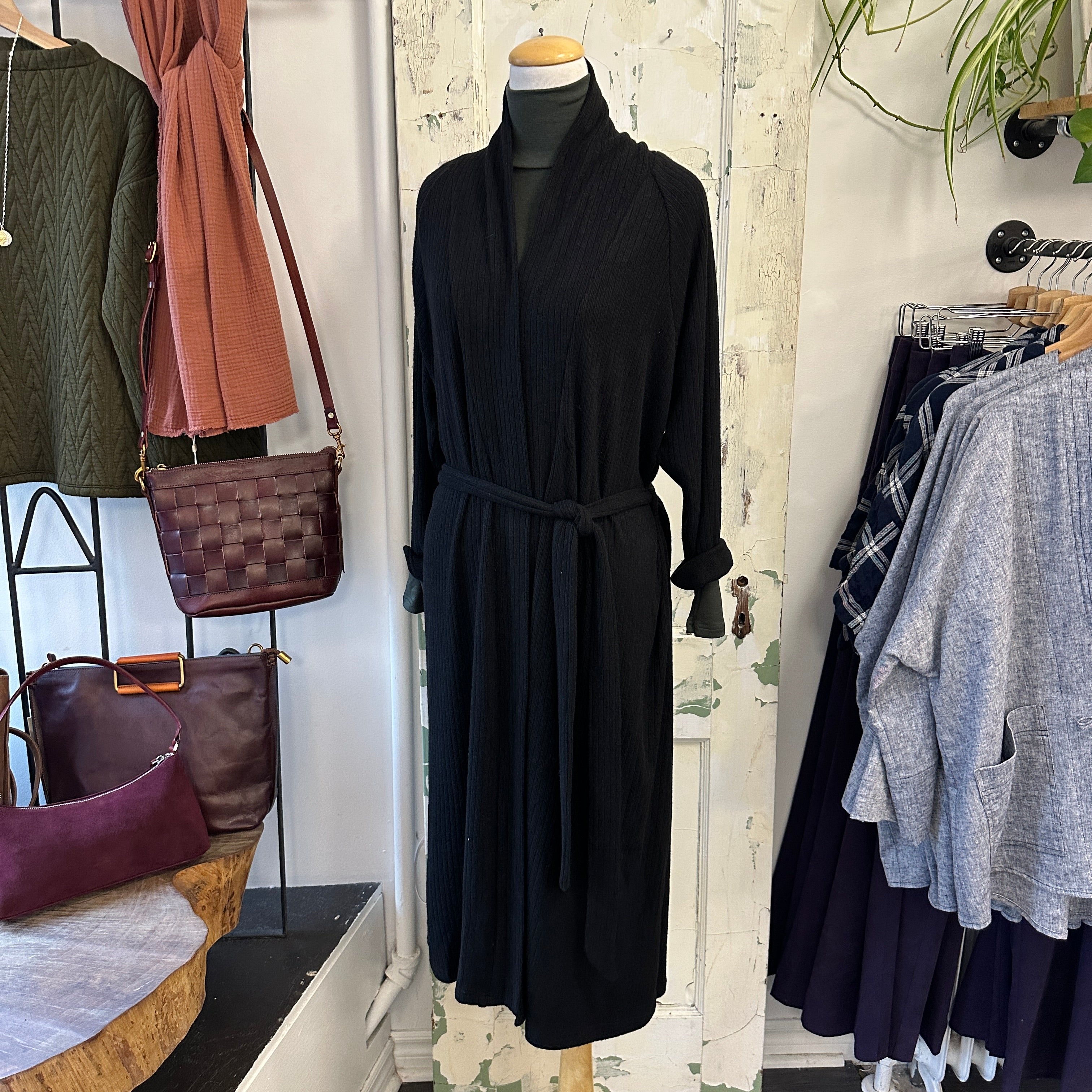 A long duster cardigan with a shawl collar. A first for us! I’ve always loved long cardis and finally found the right fabric. The fabric has a thick rib fuzzy texture. It looks cute open with the belt tied at the back over jeans. Wear it with the matching Fog Skirt.