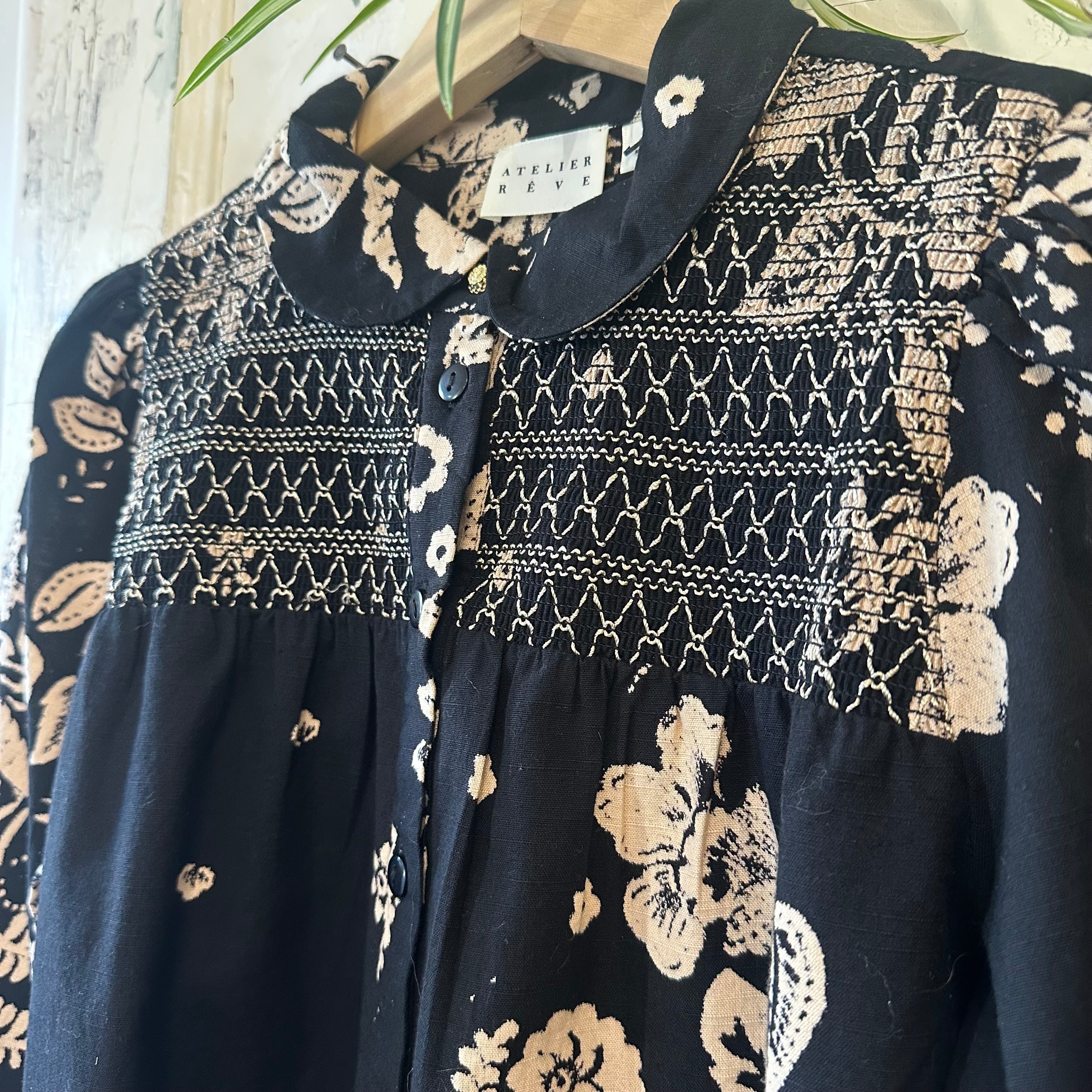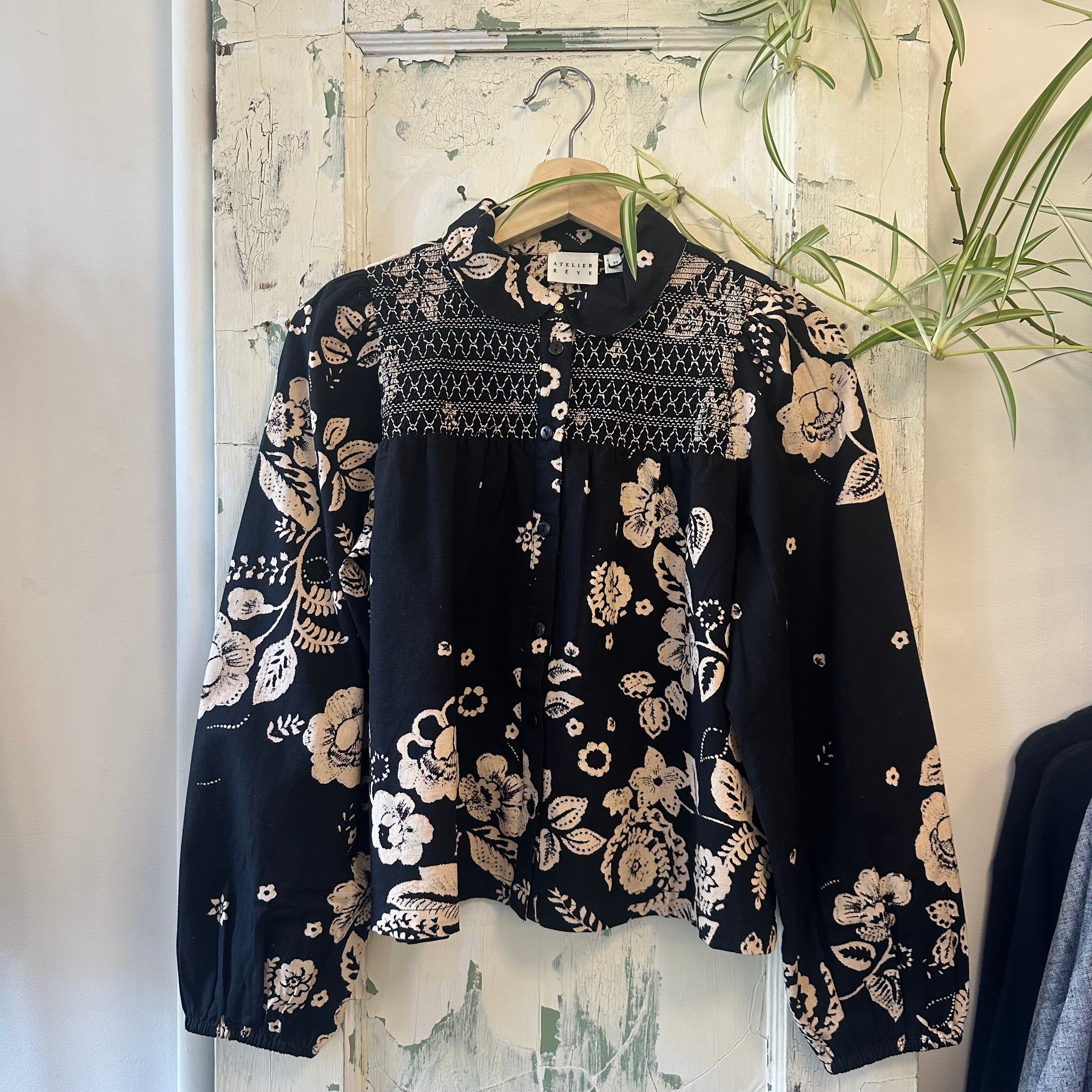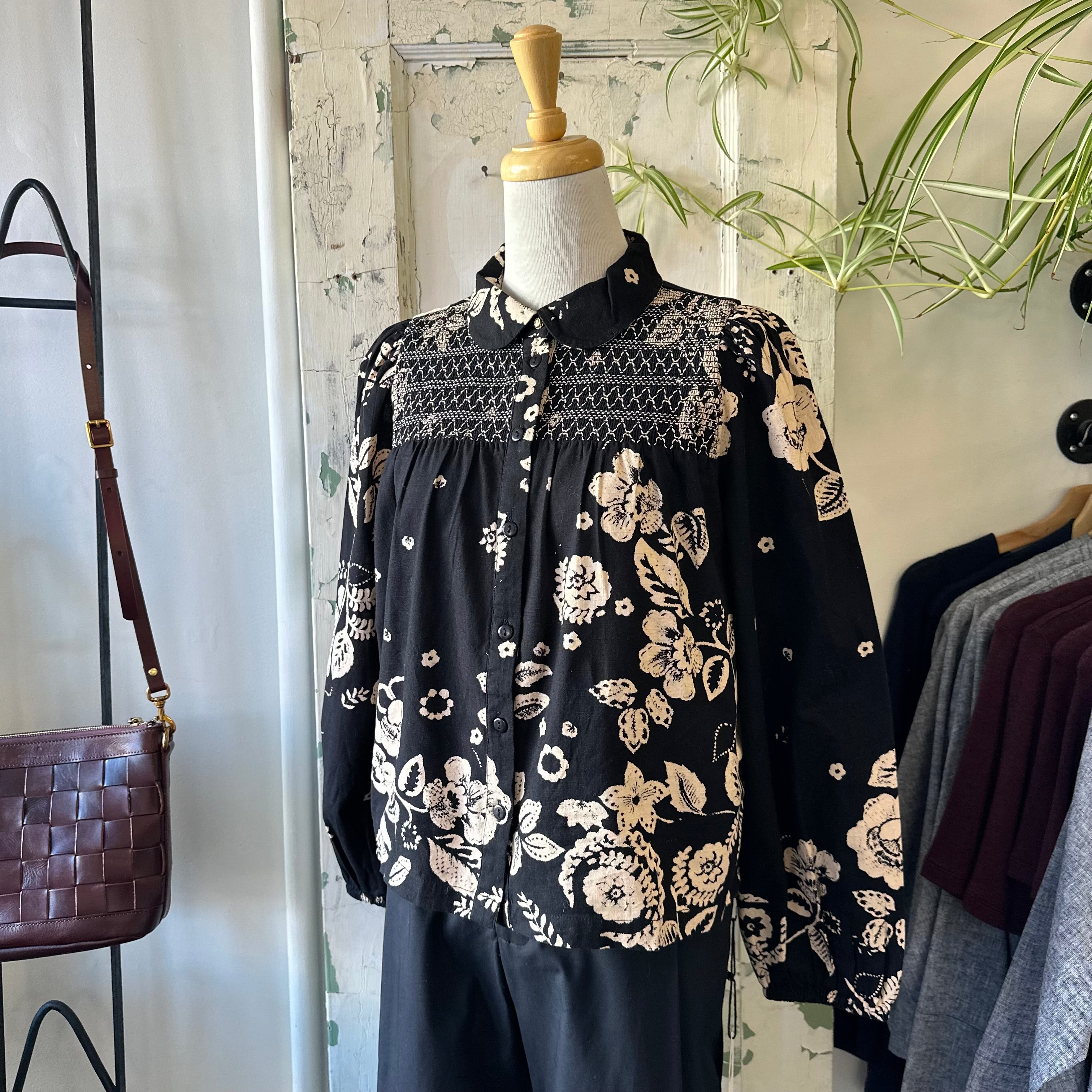 Ruched yoke blouse with a beige floral print on black. Slightly puffed sleeves and gathers along the back for a relaxed fit. A great work blouse that pairs well with pants and skirts alike!