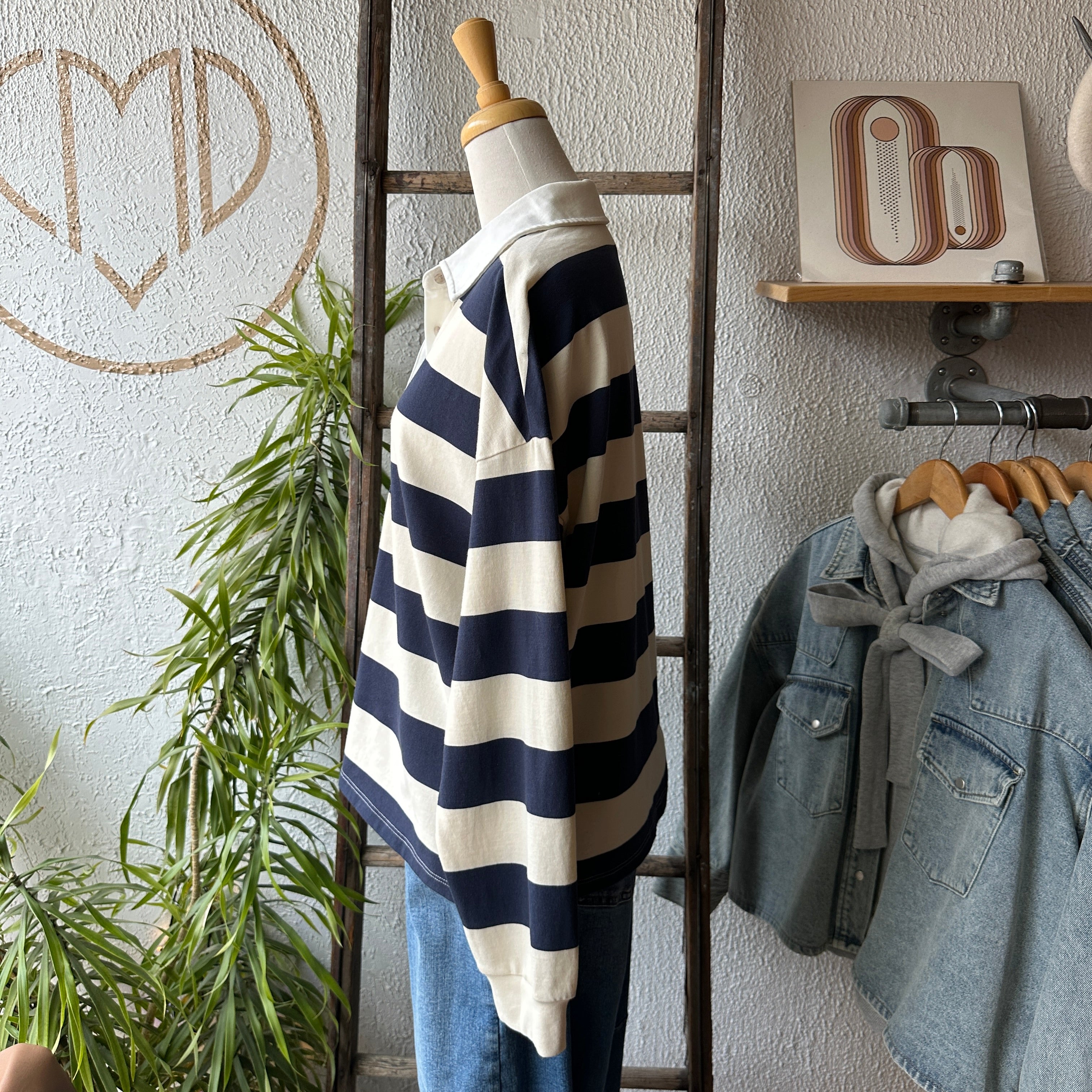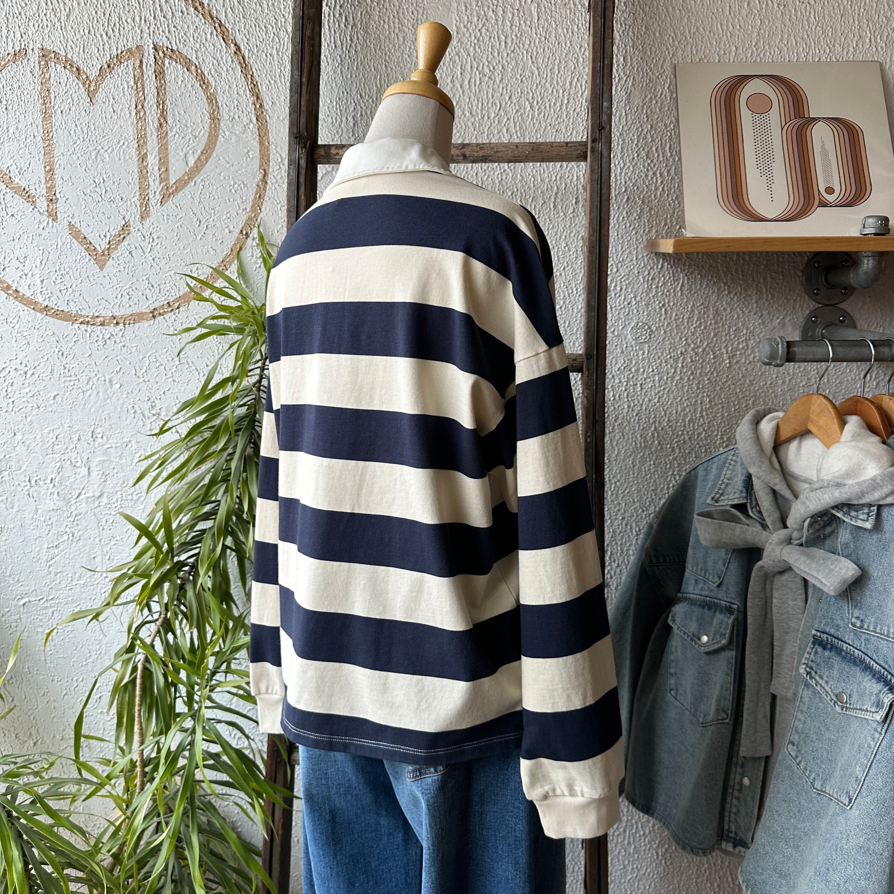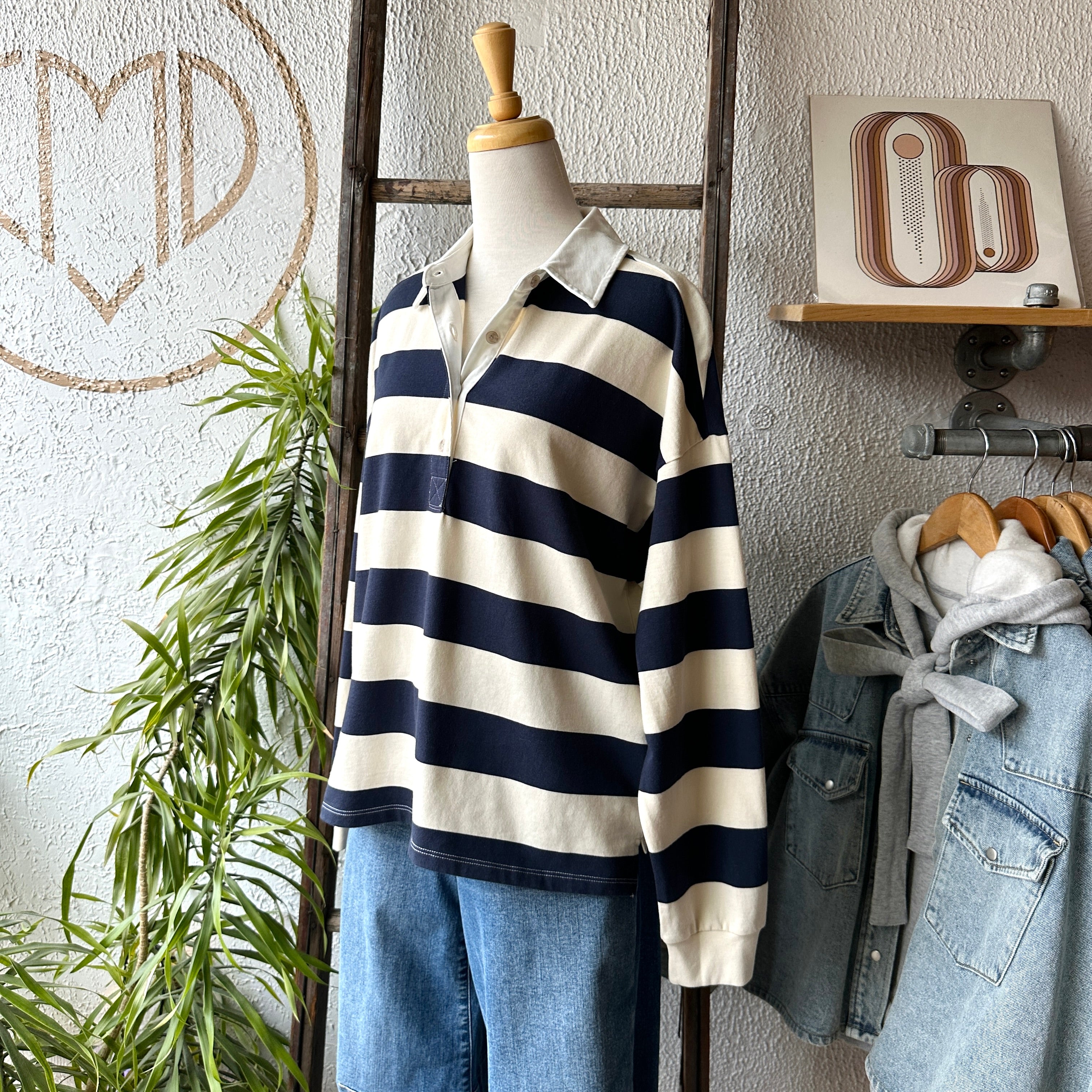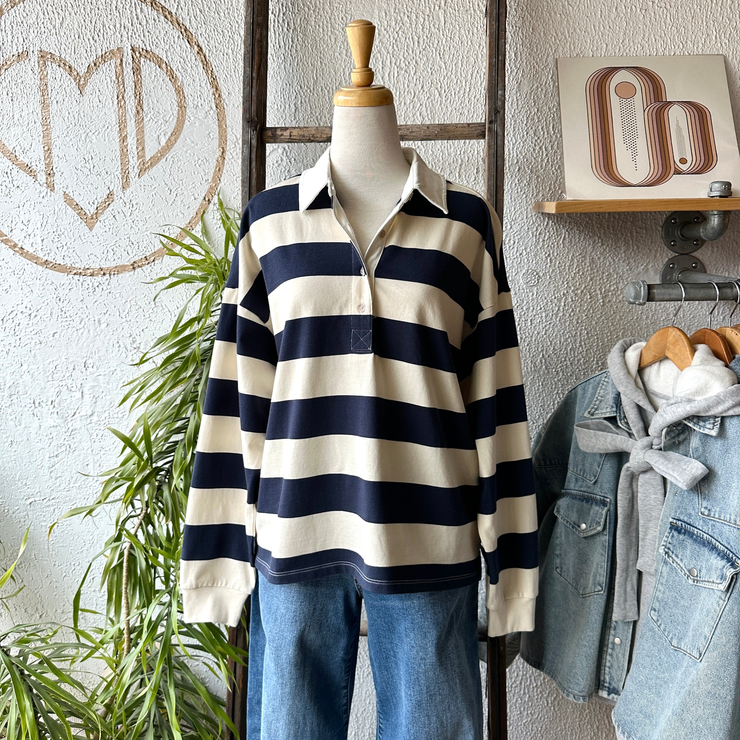 The Britt shirt is made of a cotton jersey with a classic rugby stripe. Features include a contrast collar, half placket button closure, and side slits.