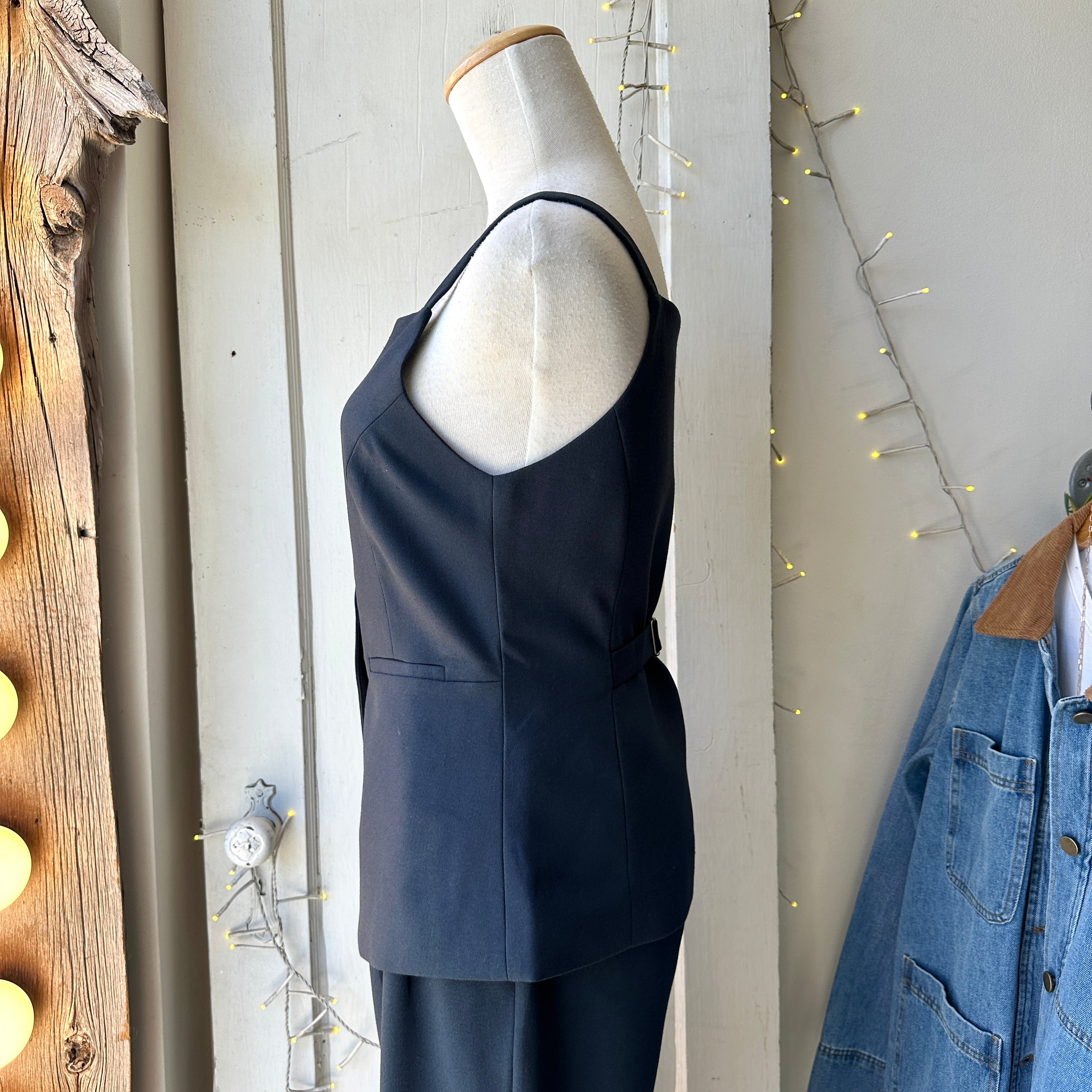 The Harper vest is made of a heathered suiting fabric and is fully lined. Features include matte gold shank buttons, welt pockets, and an adjustable back tie detail.