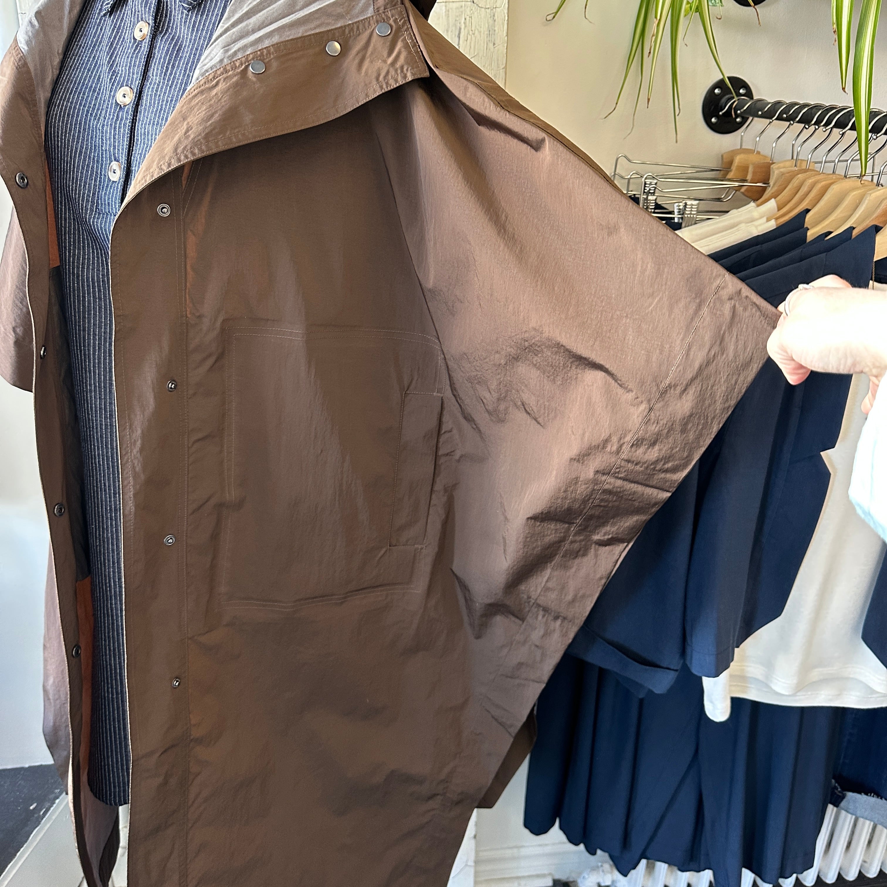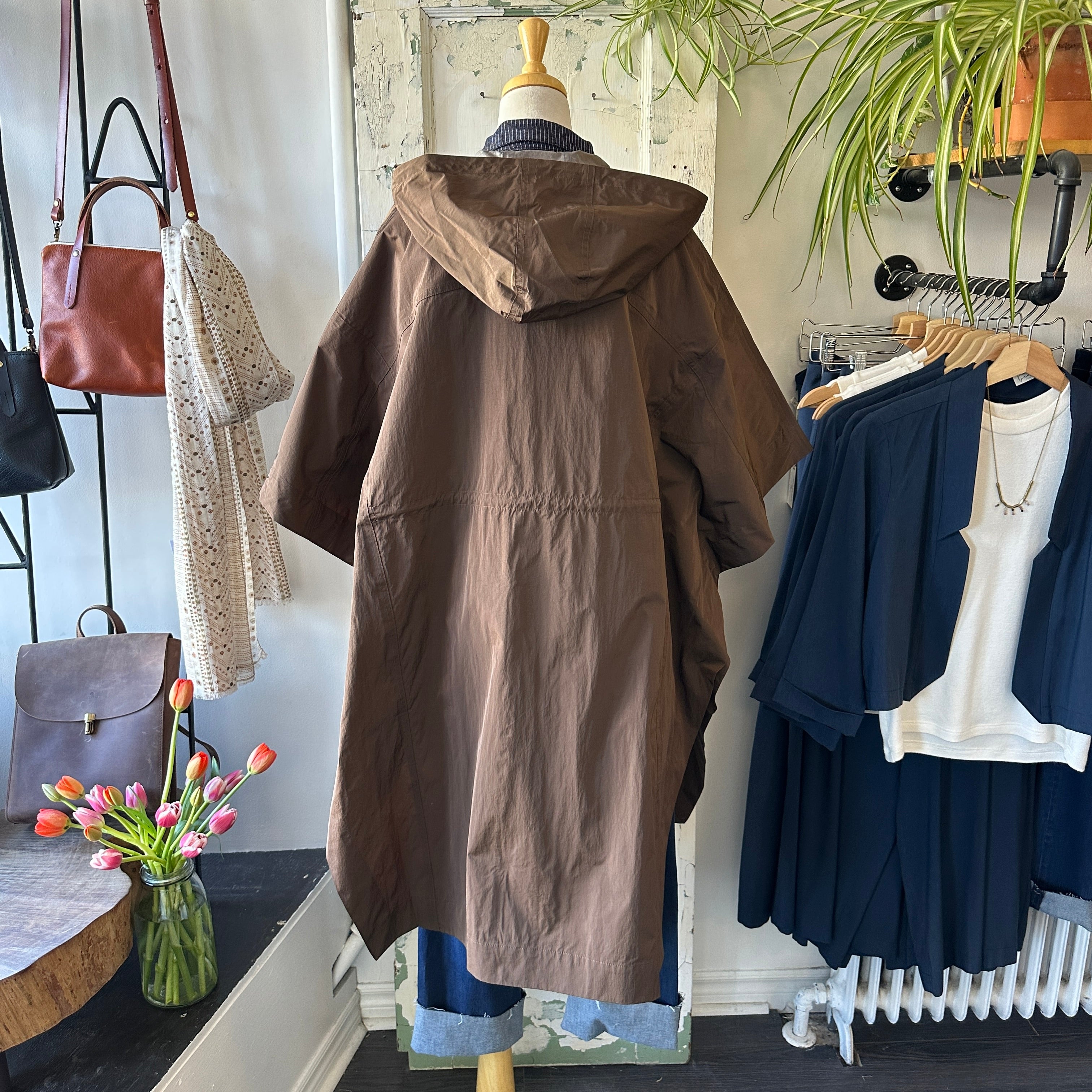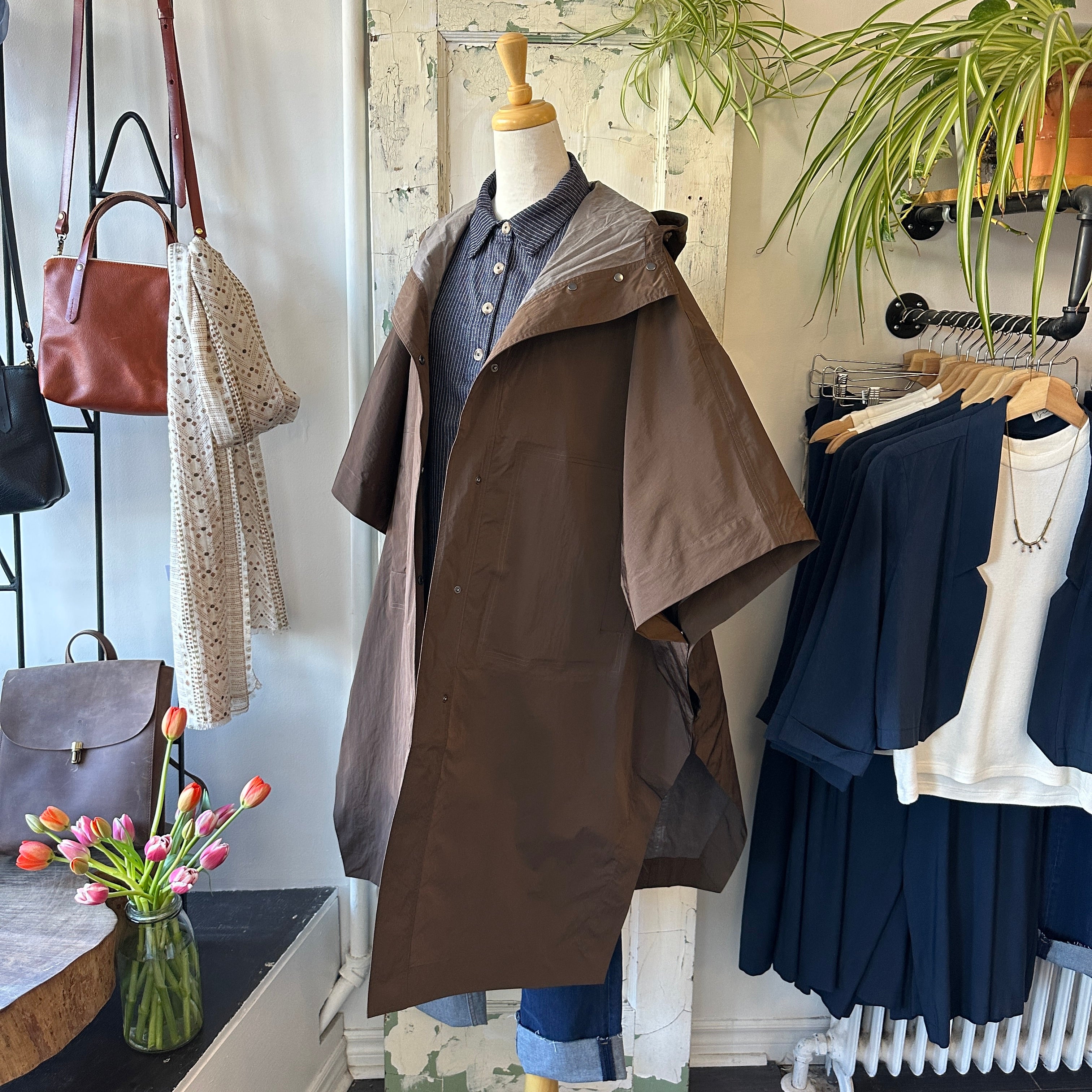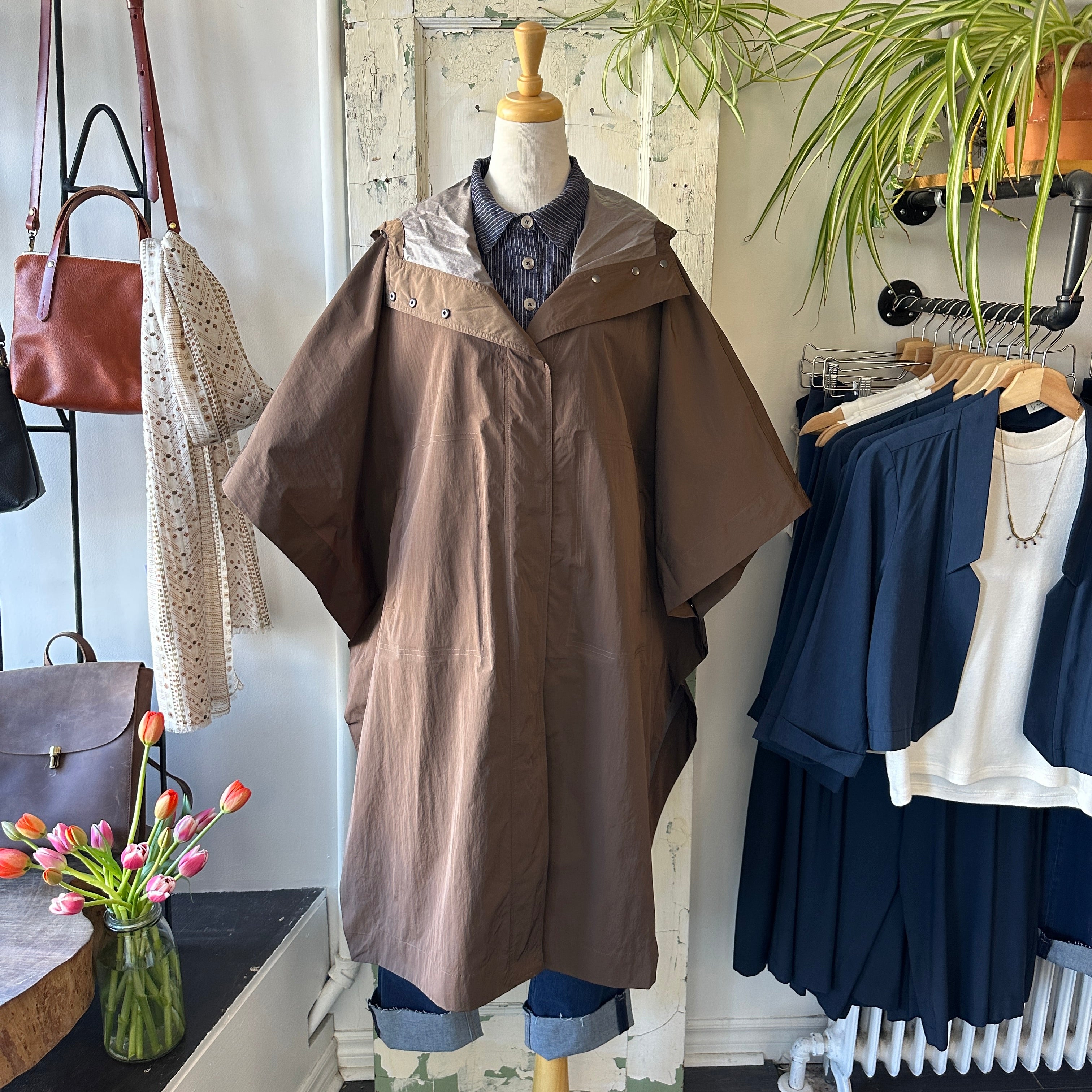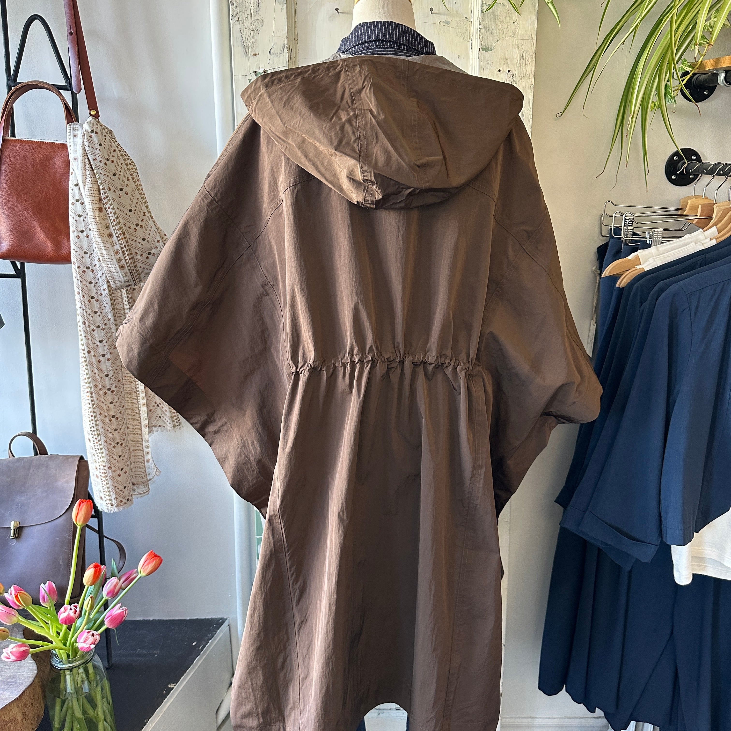 What's chicer than a cape (rain-edition)? Oversized cape with arm snaps at sides and inner toggles to adjust the waist. Snap buttons down the front, front pockets and a draw string hood. Rain protection that doesn't ruin your outfit! Rolls nice and small to fit in your tote, too.