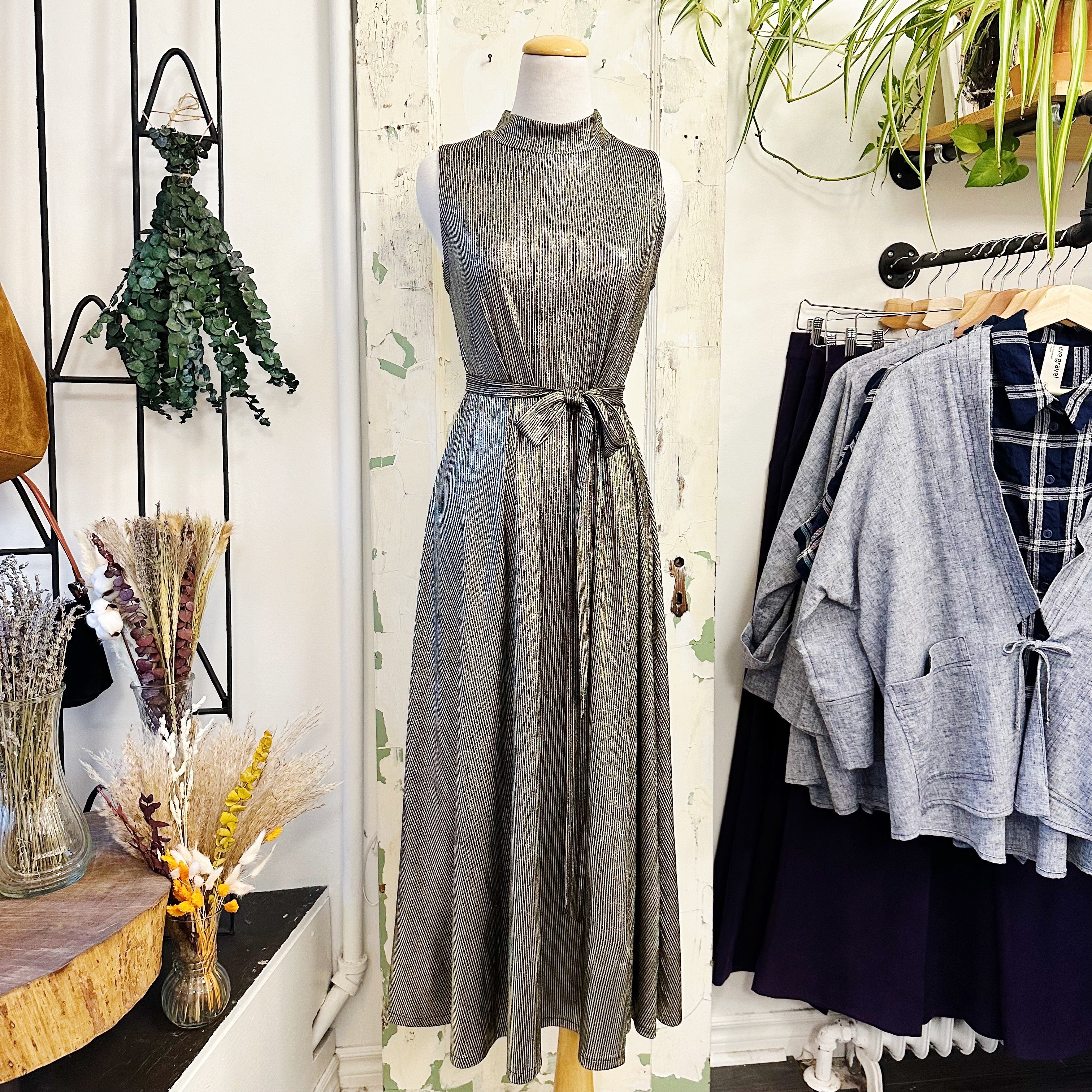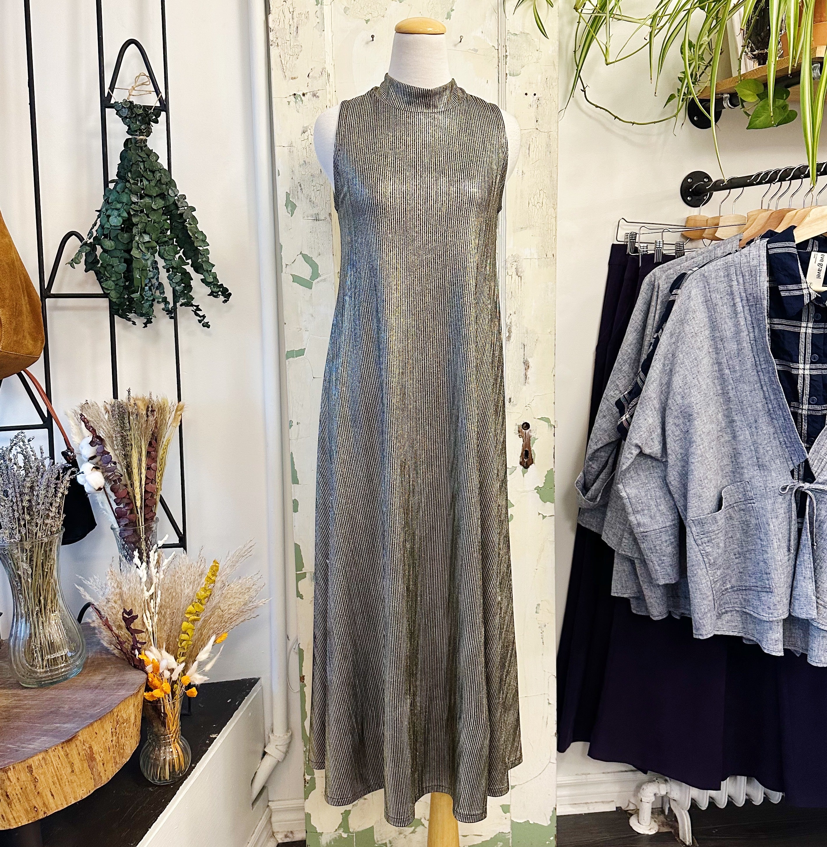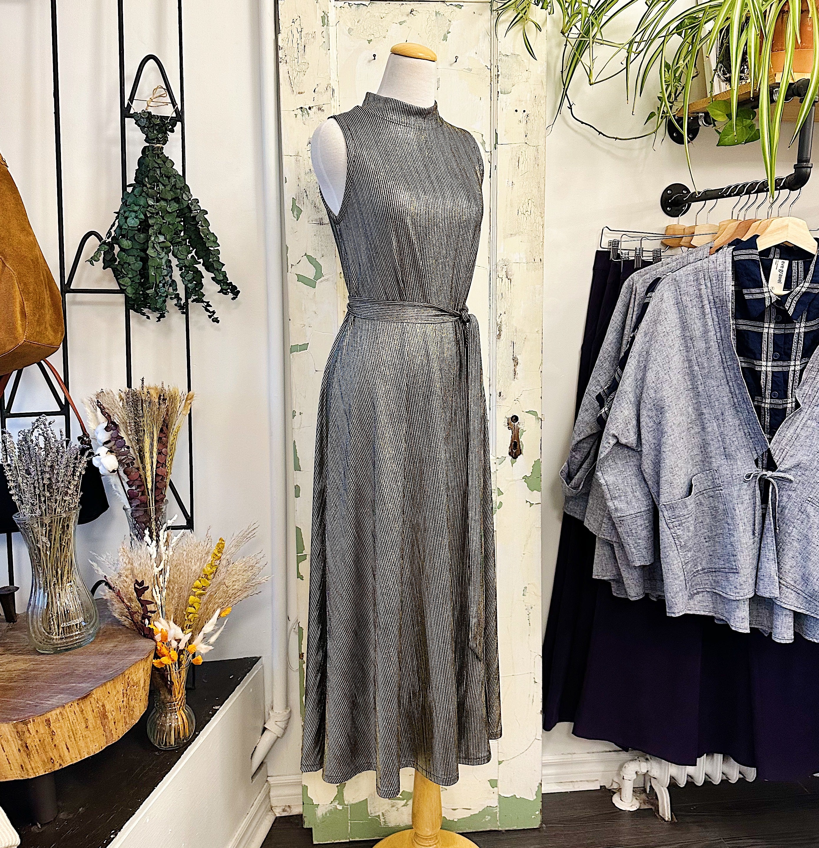 This style is available at our 744 Queen West location.     It is a really swingy dress. A mock neck sleeveless maxi dress. The top has shape on the body then becomes a full skirt. It comes with a...