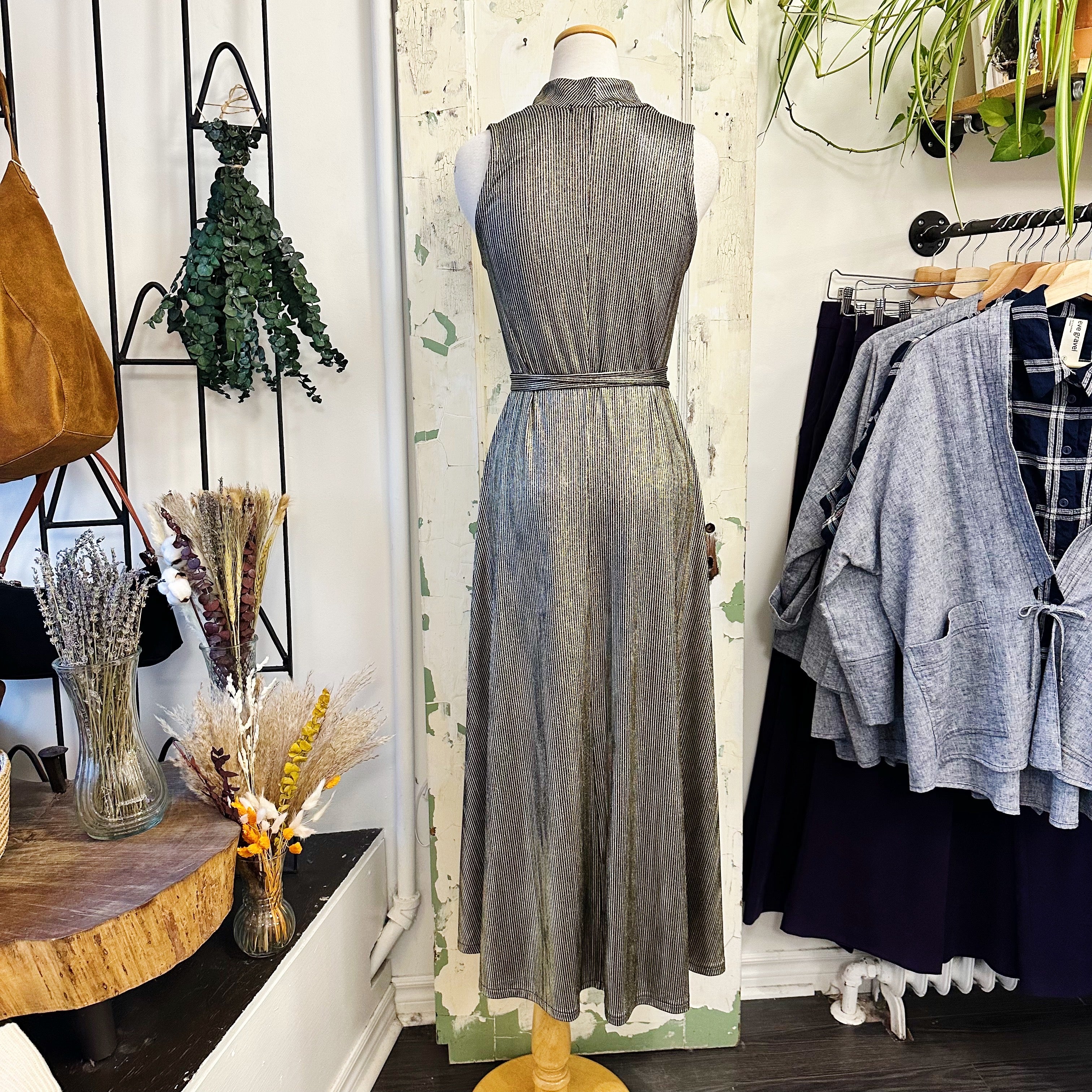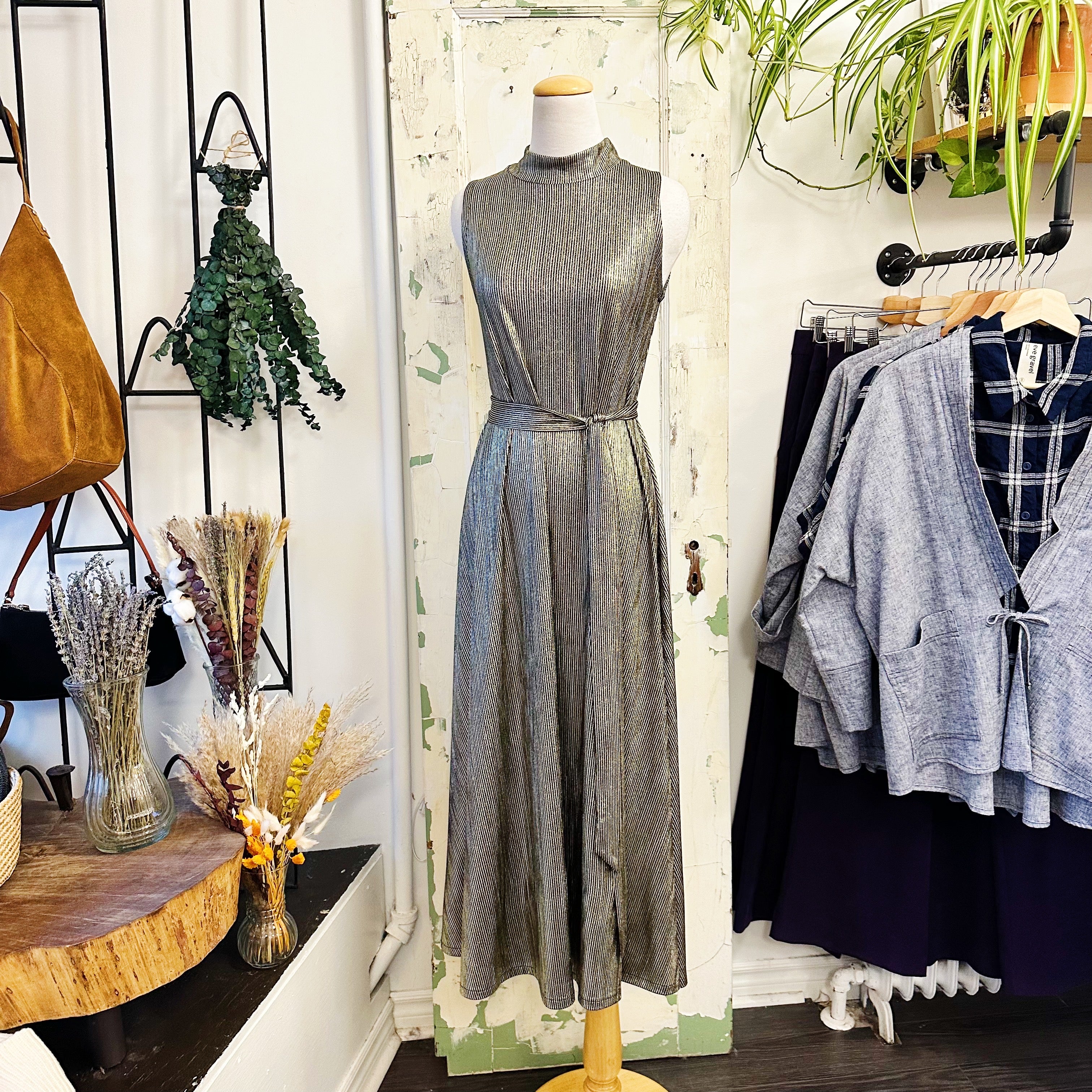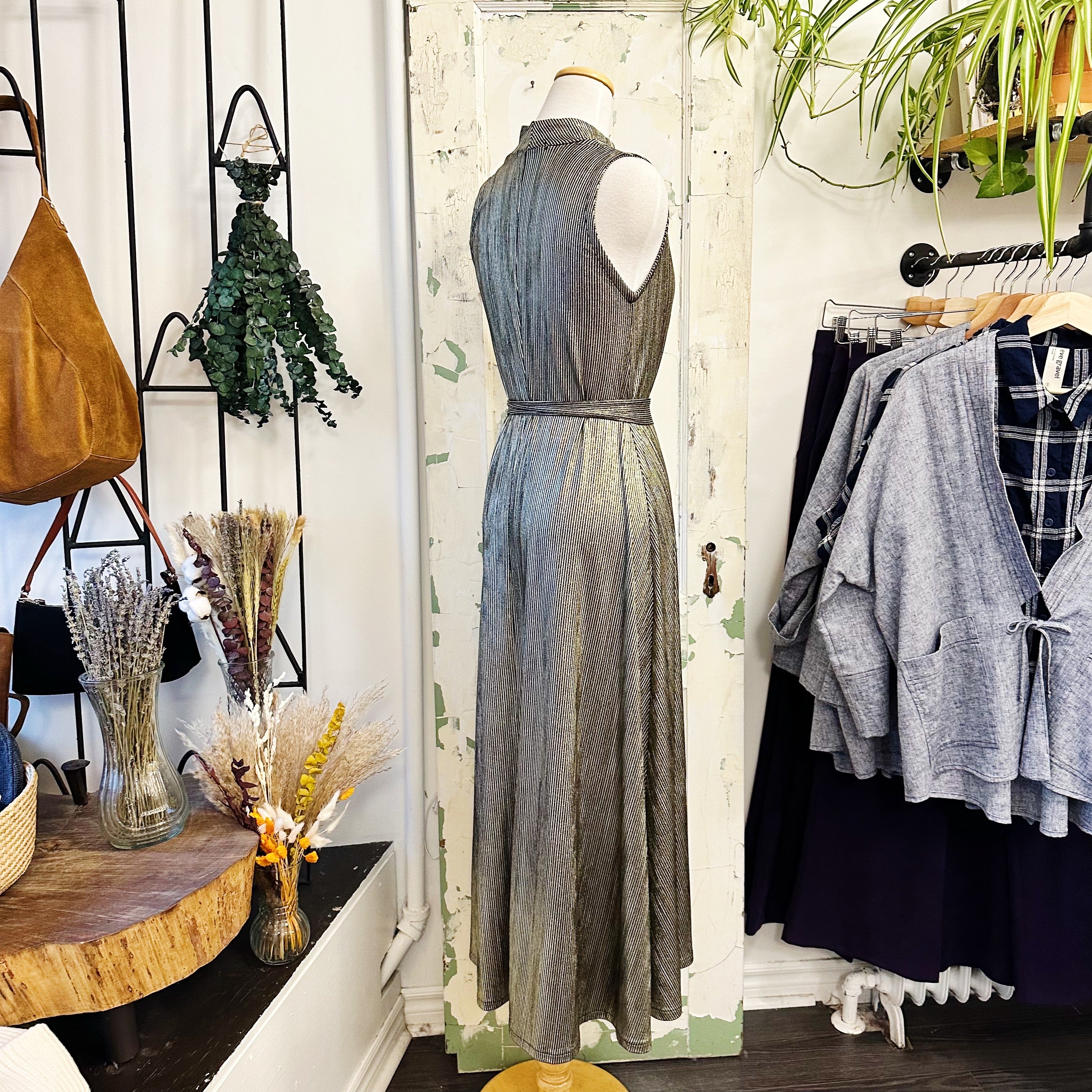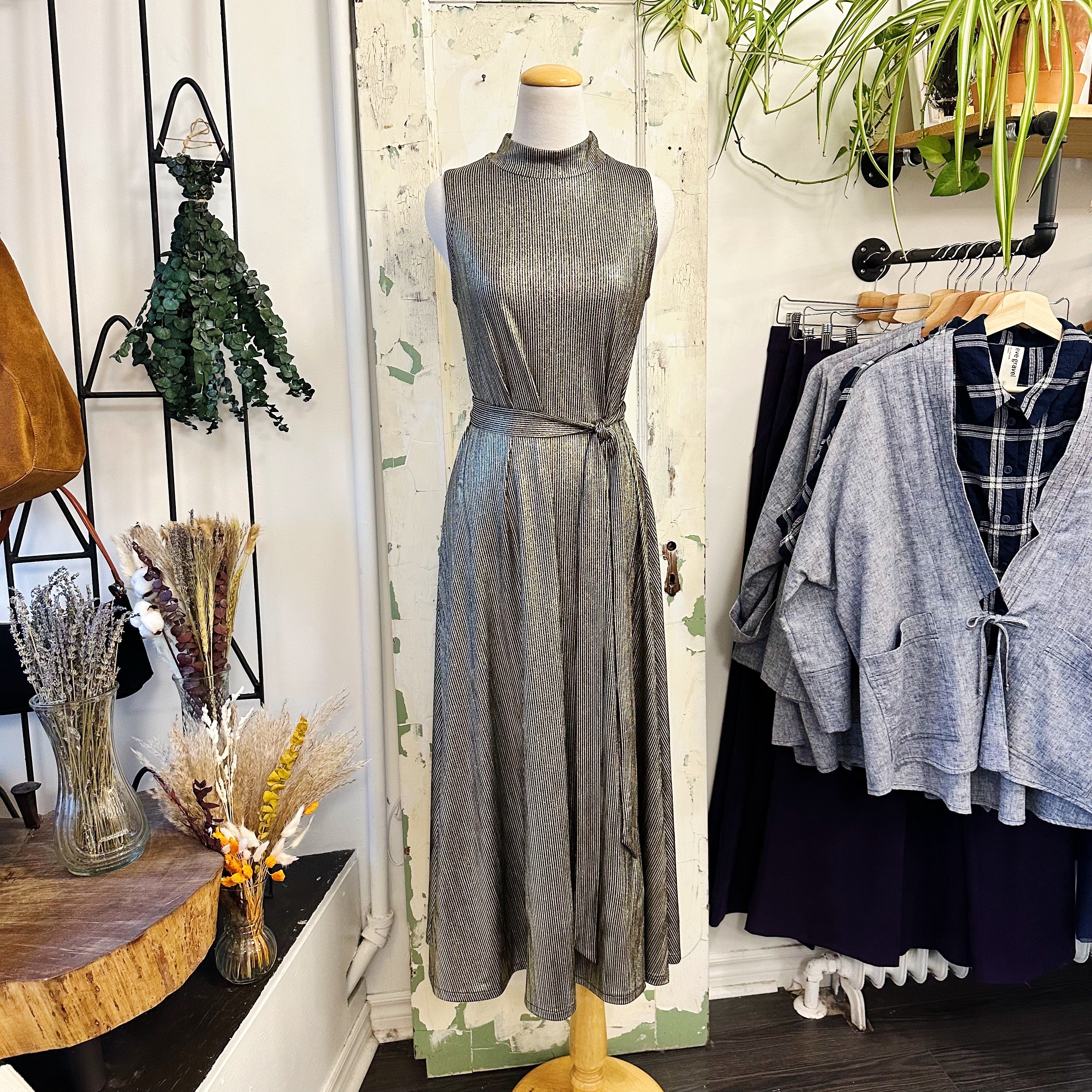 This style is available at our 744 Queen West location.     It is a really swingy dress. A mock neck sleeveless maxi dress. The top has shape on the body then becomes a full skirt. It comes with a...