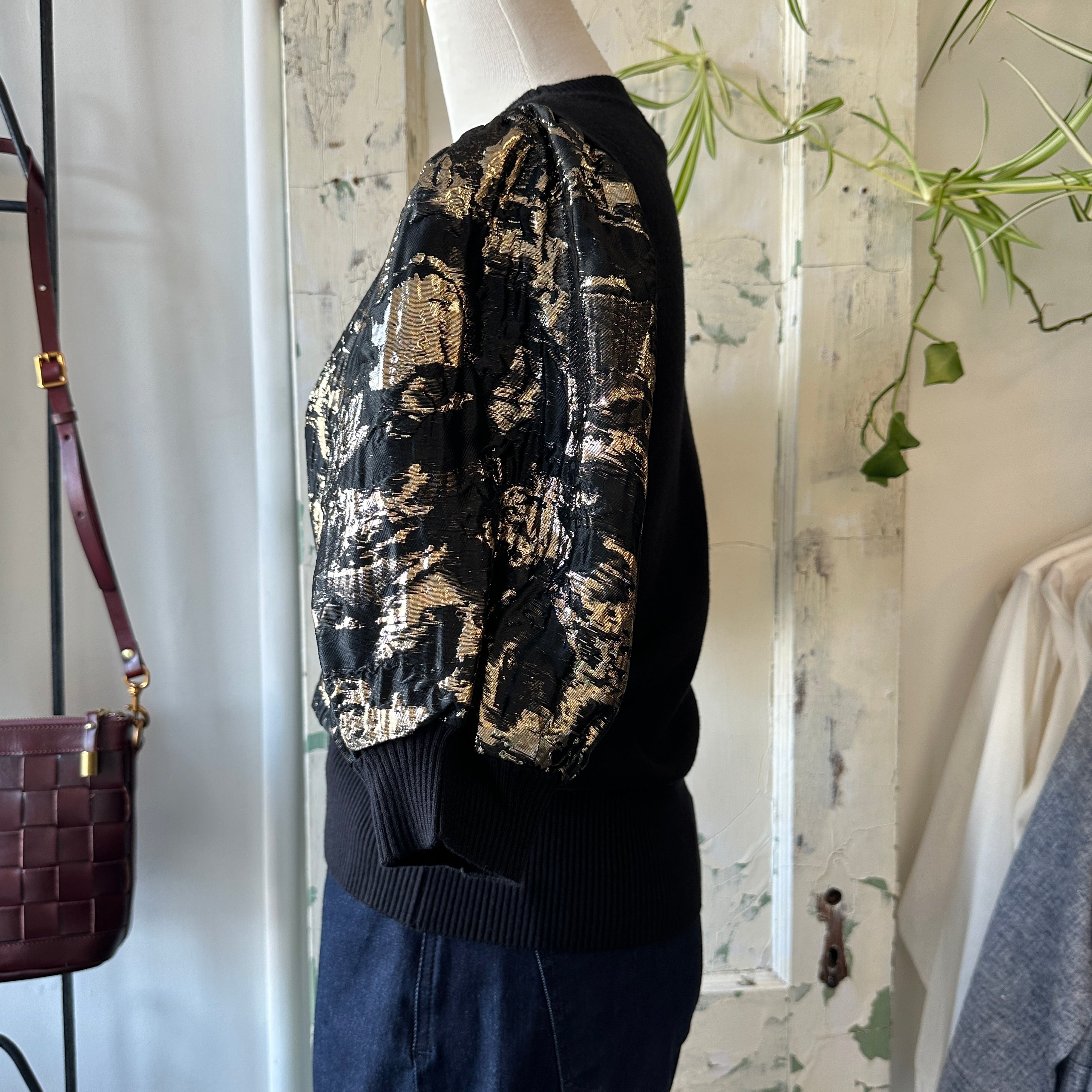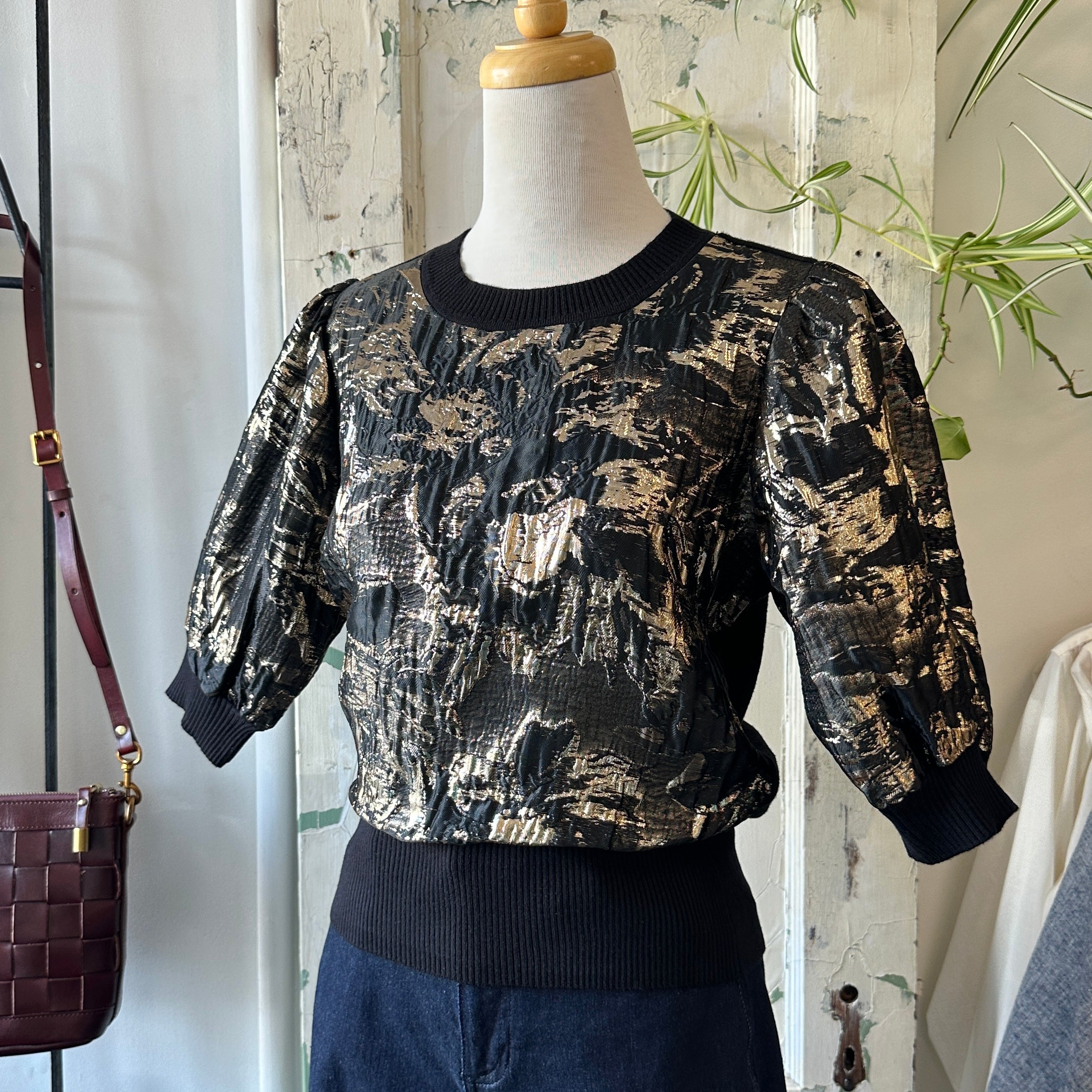 Stocked at our 744 Queen Street West location.Fun puff sleeved knit sweater in gold and black jacquard. Features a ribbed hem and cuffs. A great holiday top! Made in China    Materials 55% viscose, 35% polyamide, 10% elastane...