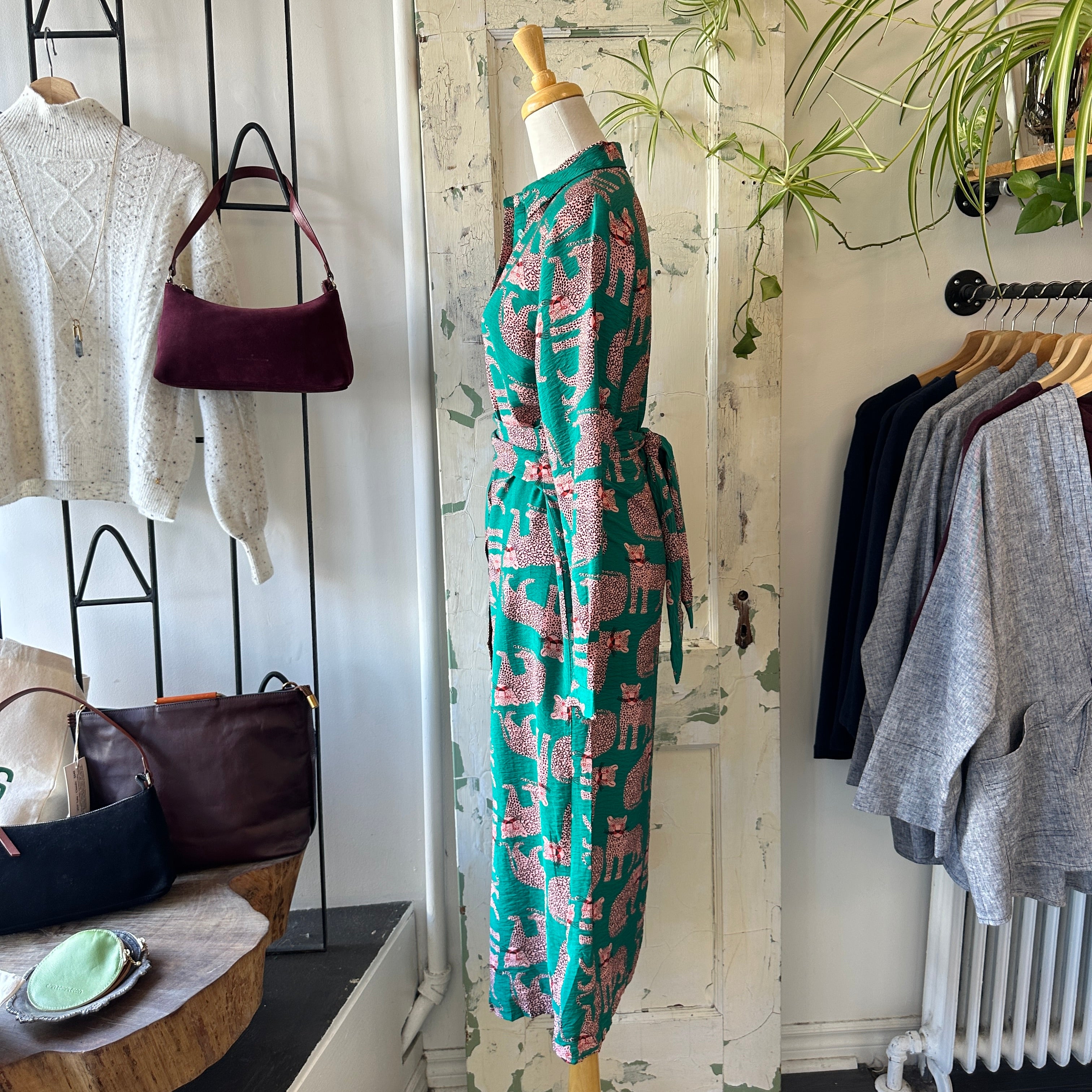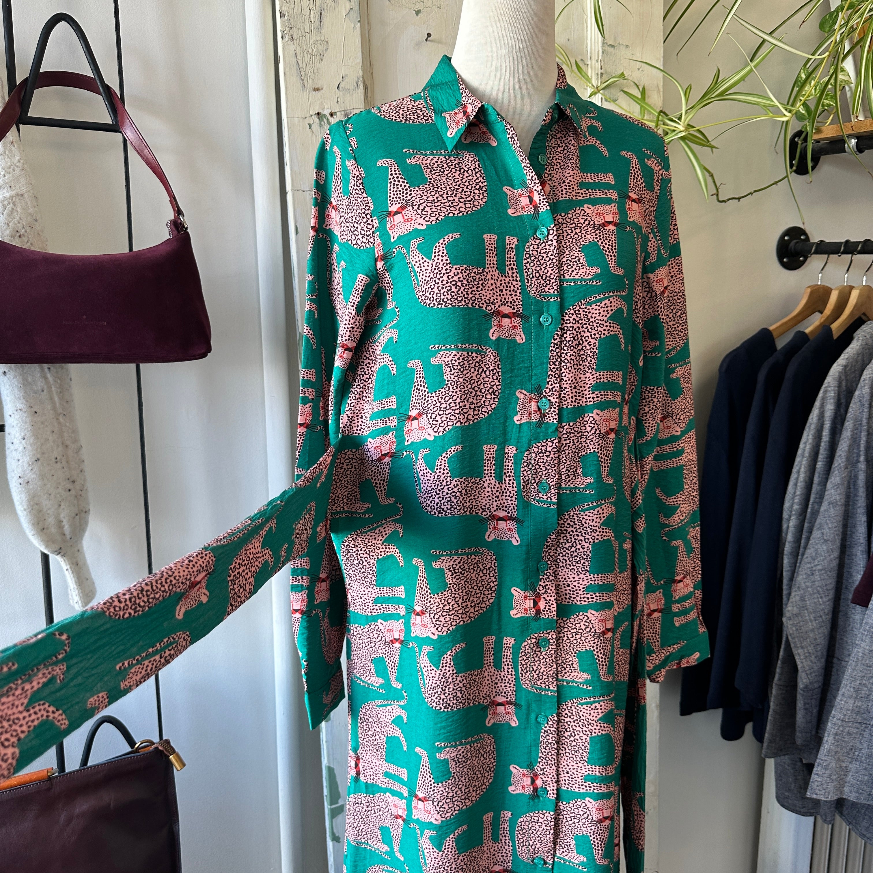 This item is stocked at our 744 Queen St West location.   Fun shirt dress that features a playful jaguar print, shirt collar, and attached waist belt that can be styled in the front or back. Midi length. Material:...