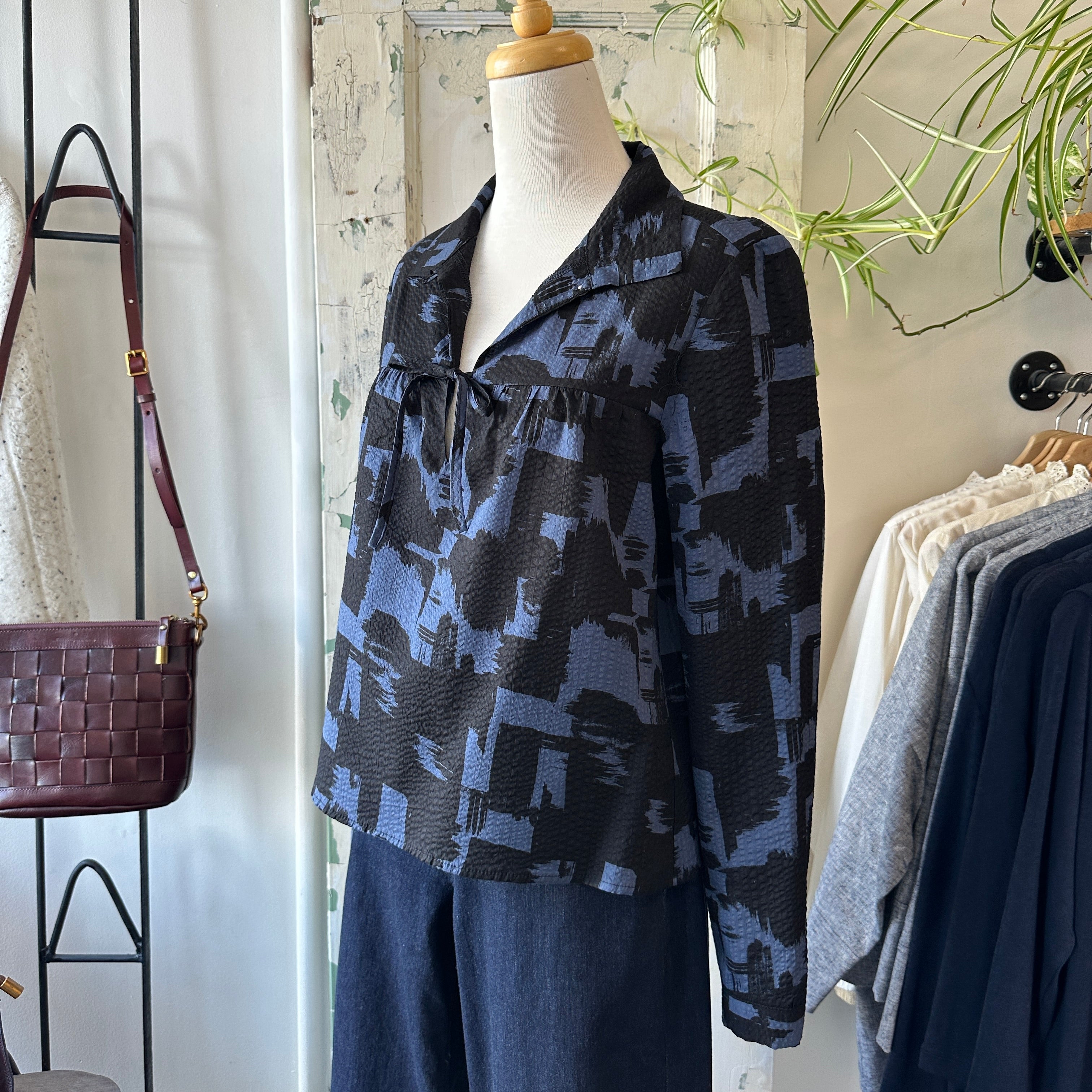 Stocked at our Junction location, 3095 Dundas Street West We're happy to welcome back the best-selling Phoebe blouse. Oeko Tex Certified Miracle Wave Cotton. Subtle Texture with a sweet tie-front and button at the neck. Relaxed fit. Made in...