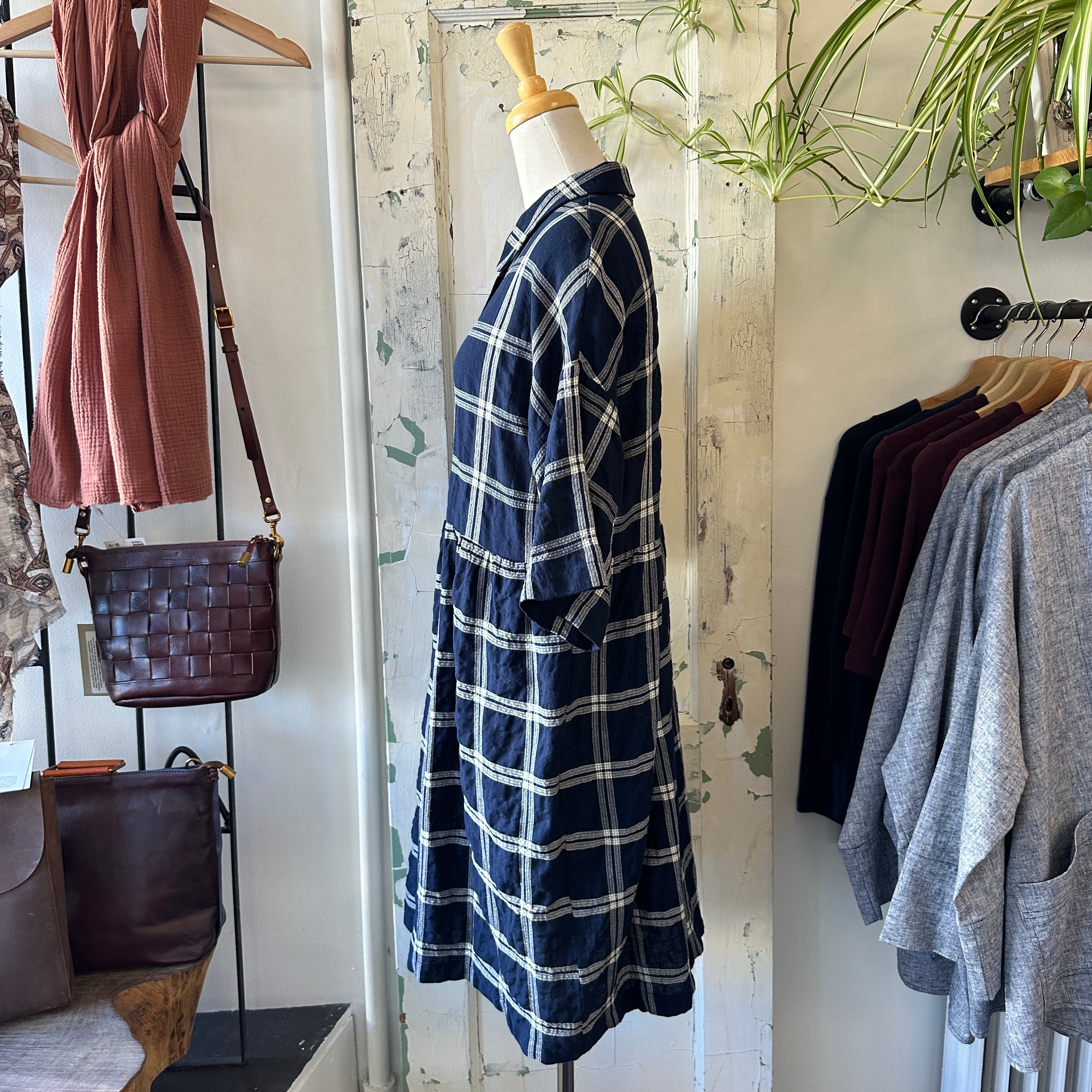 Stocked at our 744 Queen Street West location.   Oversized dress with a shirt collar and short sleeves, enhanced by gathers at the waist and a button placket at the bust. It features a patch pocket at the front...