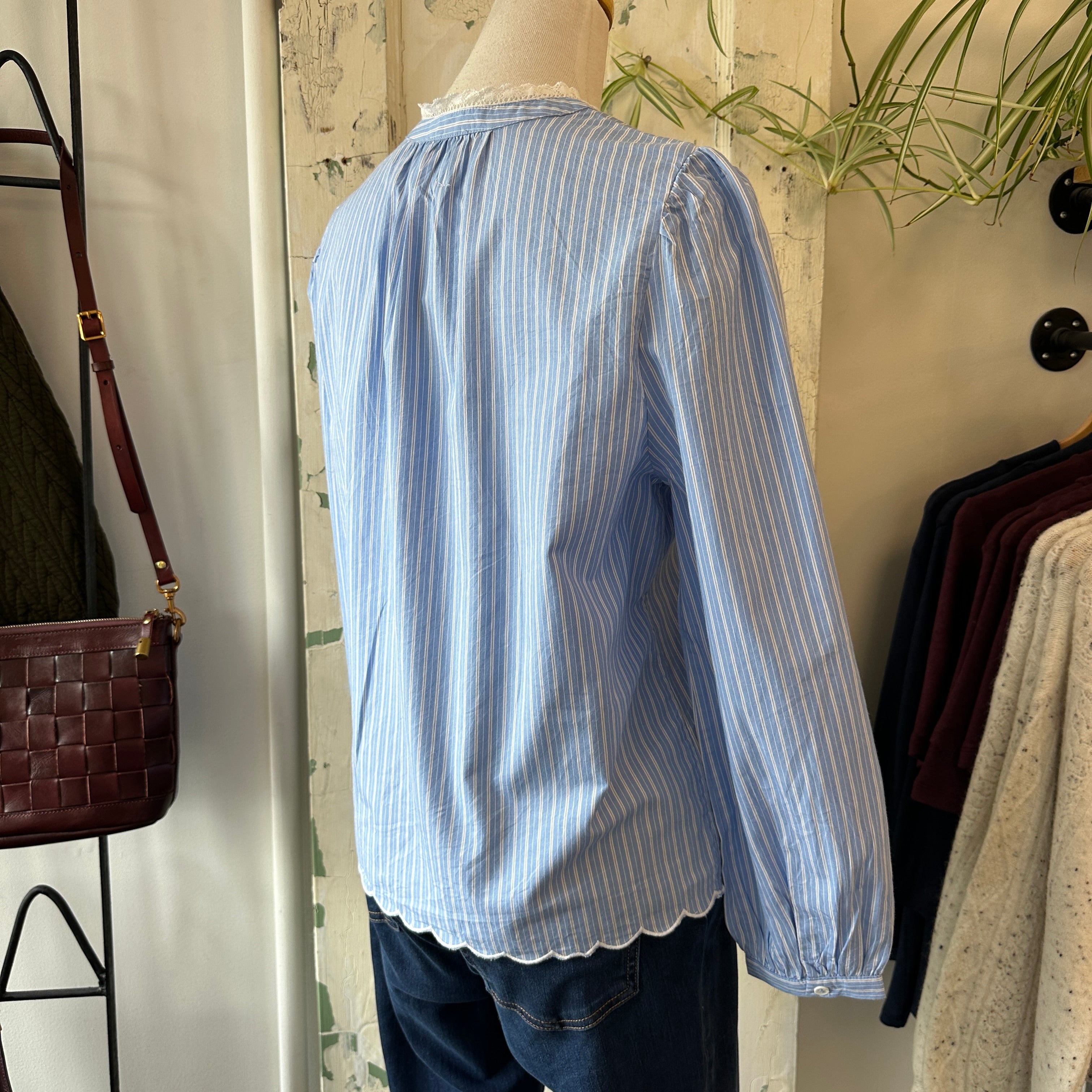 This item is stocked at our 87 Roncesvalles Avenue location. This poplin shirt will be the most special shirt in your wardrobe. It has a square collar and half-placket buttoned closure, plus hand-cut floral motifs. Many details to love with...