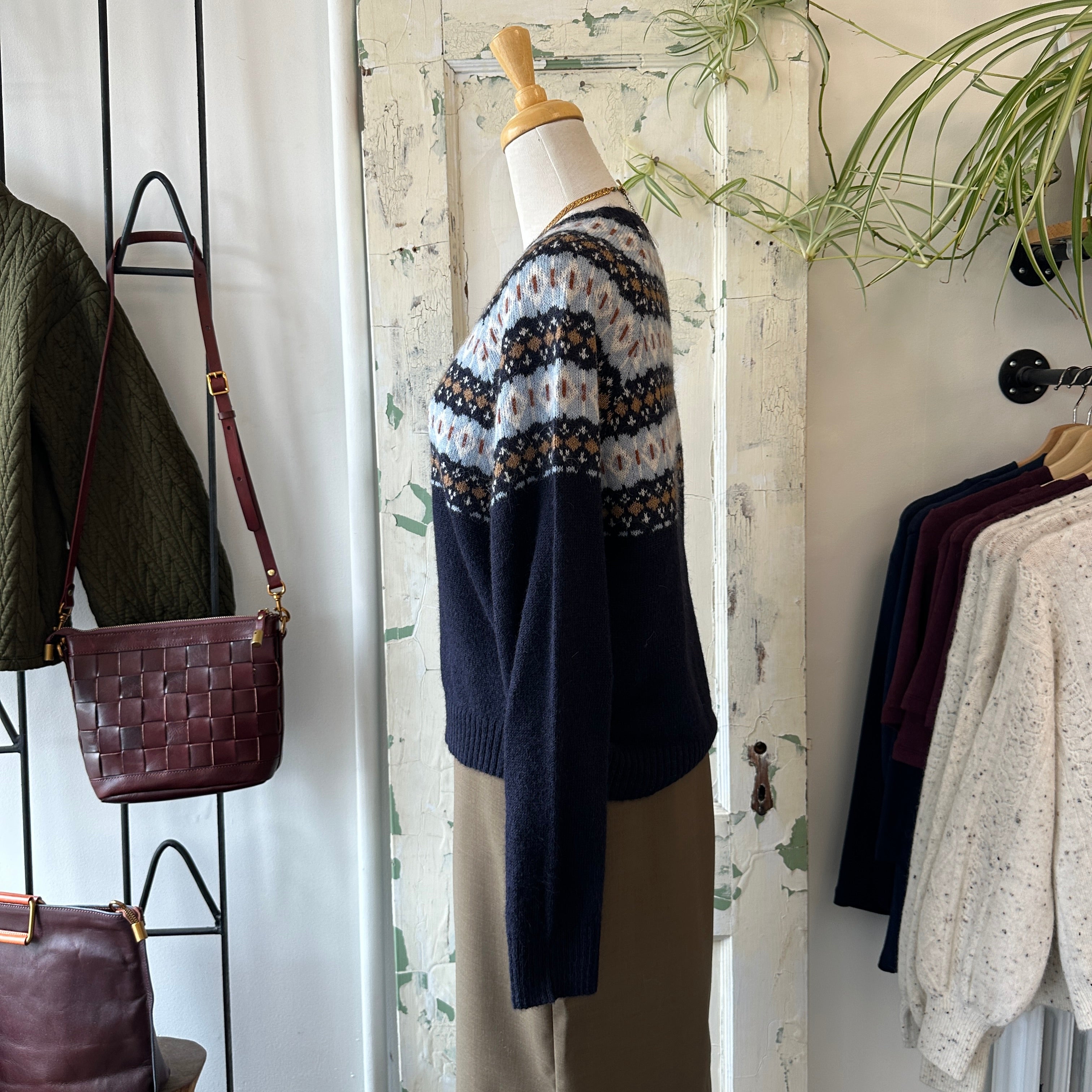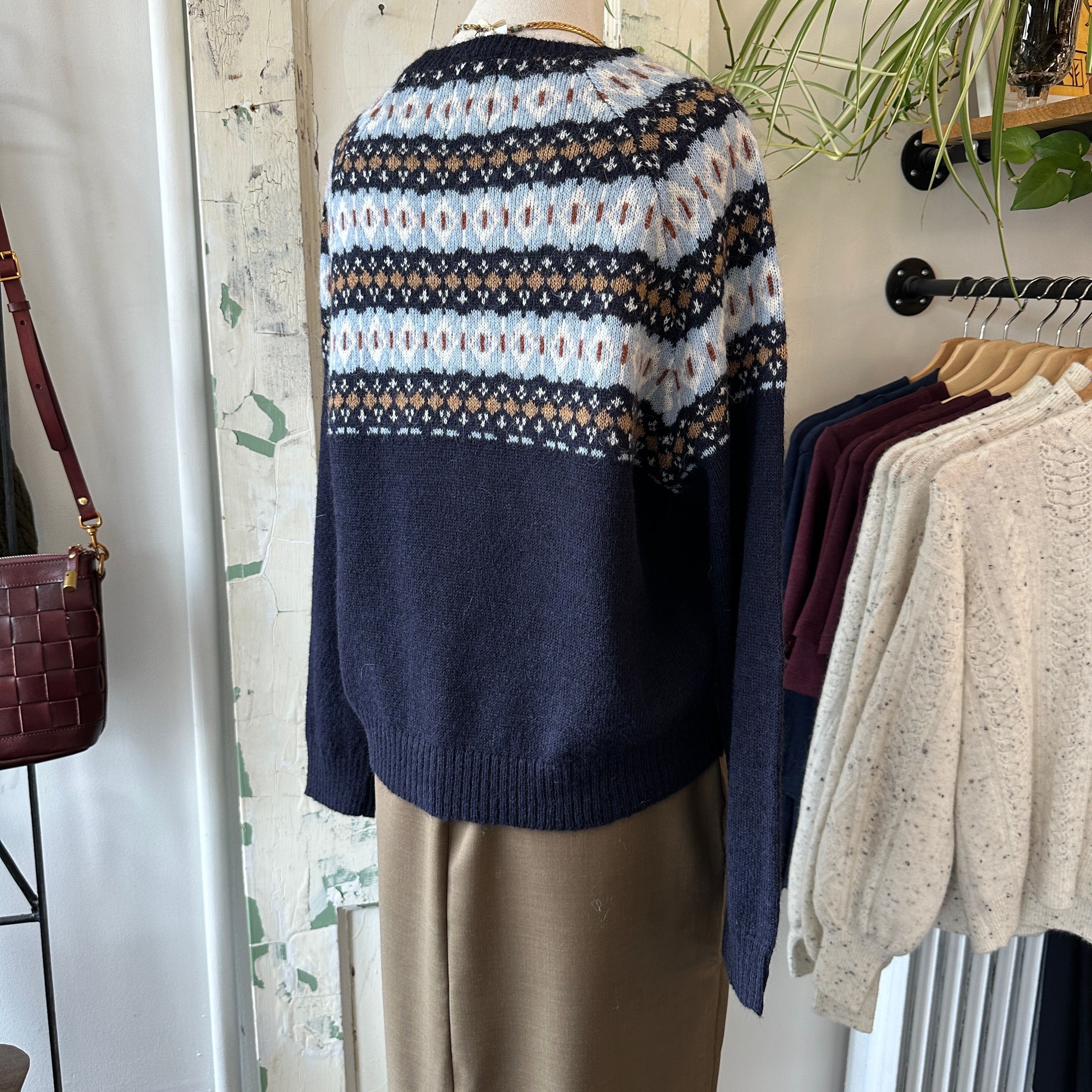 Stocked at our 87 Roncesvalles Avenue location.We love the classic styling of this fair-isle inspired knit sweater with alpaca and wool fibers. It features raglan sleeves, ribbed trim on cuffs and hem and a relaxed fit. Perfect for the chilly...