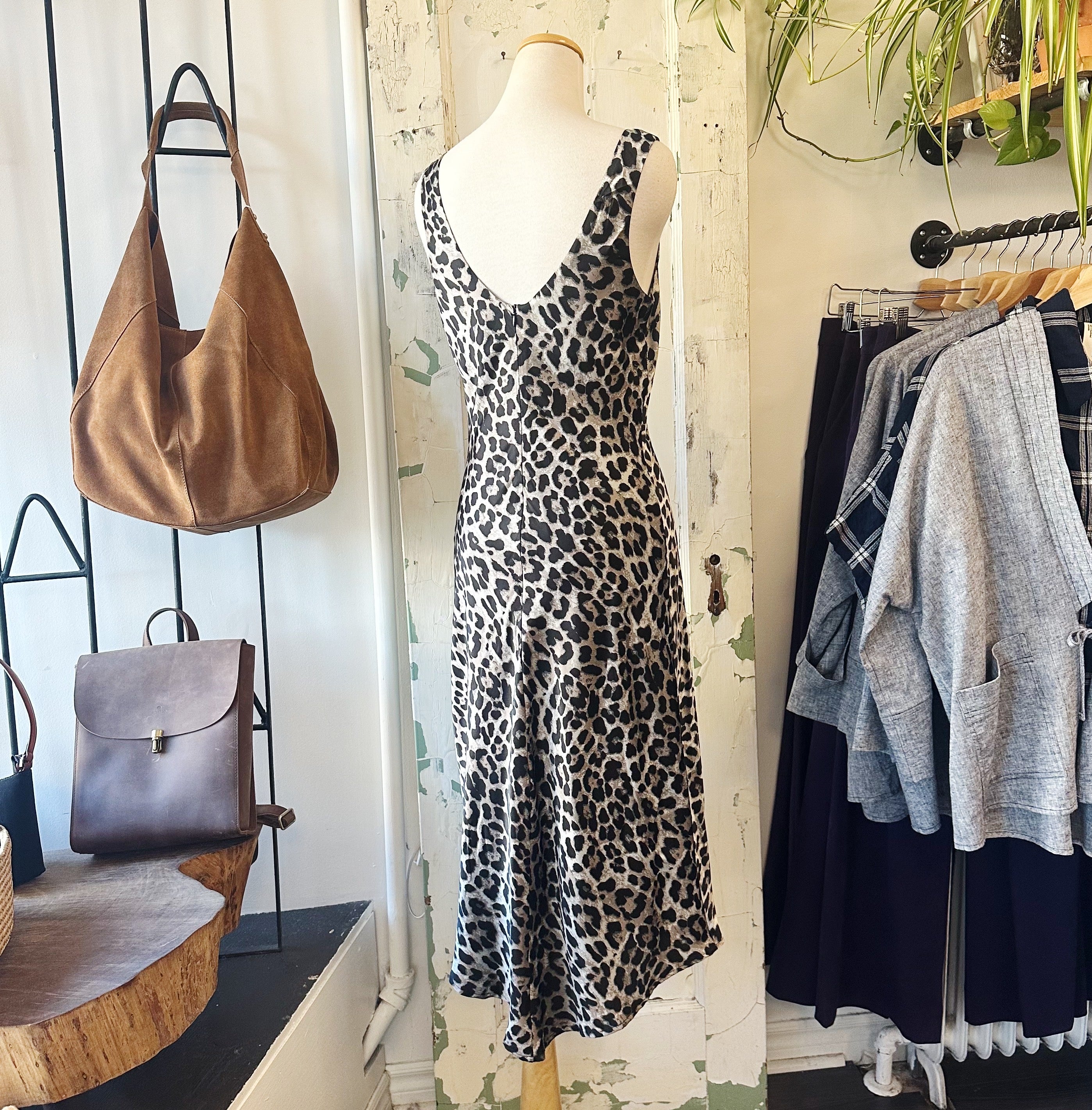 This style is available at our 744 Queen West location.    The Jazlyn Dress is a leopard print satin dress that drapes effortlessly on the body for a sleek, flattering silhouette. Designed with a cowl neckline and asymmetrical hem,...