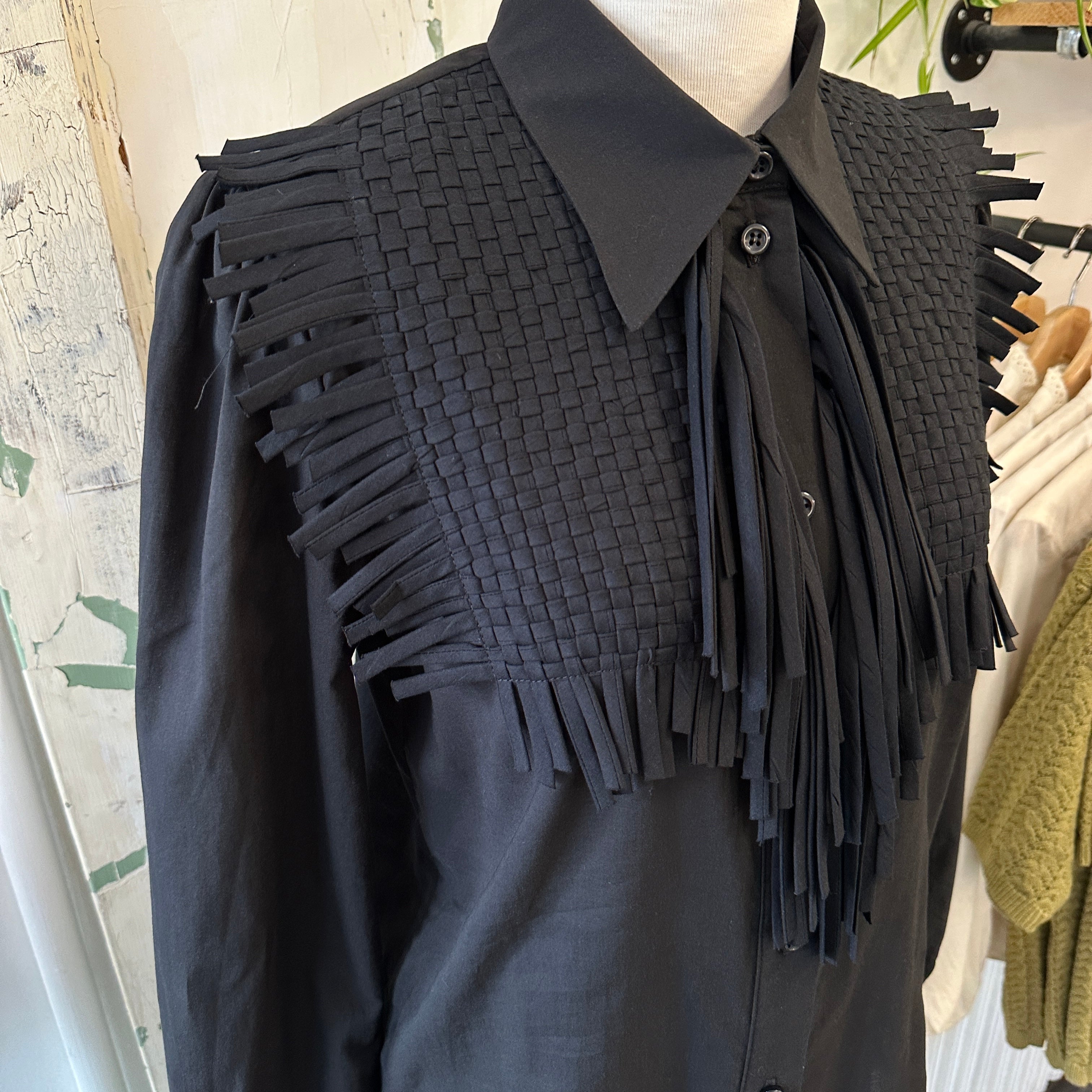 This item is stocked at our 744 Queen Street West location.   The Ostuni in Black buttoned down shirt features long sleeves, a classic collar and a tailored fit. It has intricate hand-woven appliques on the two front panels for...