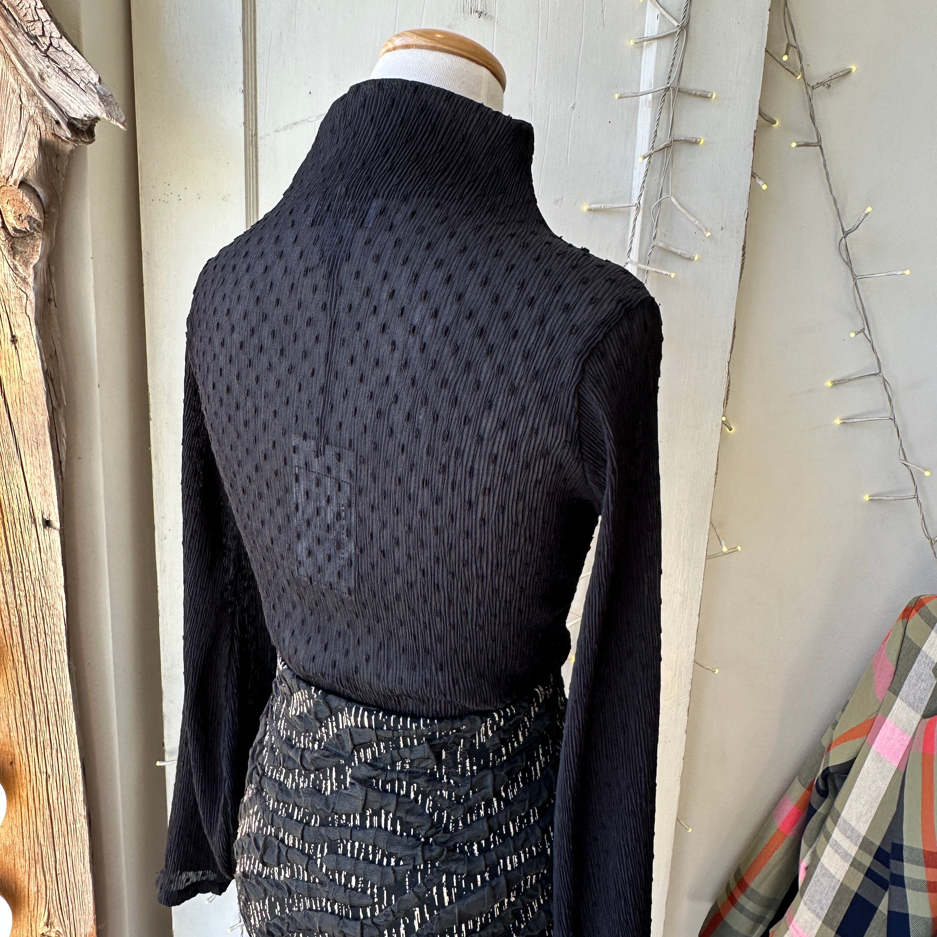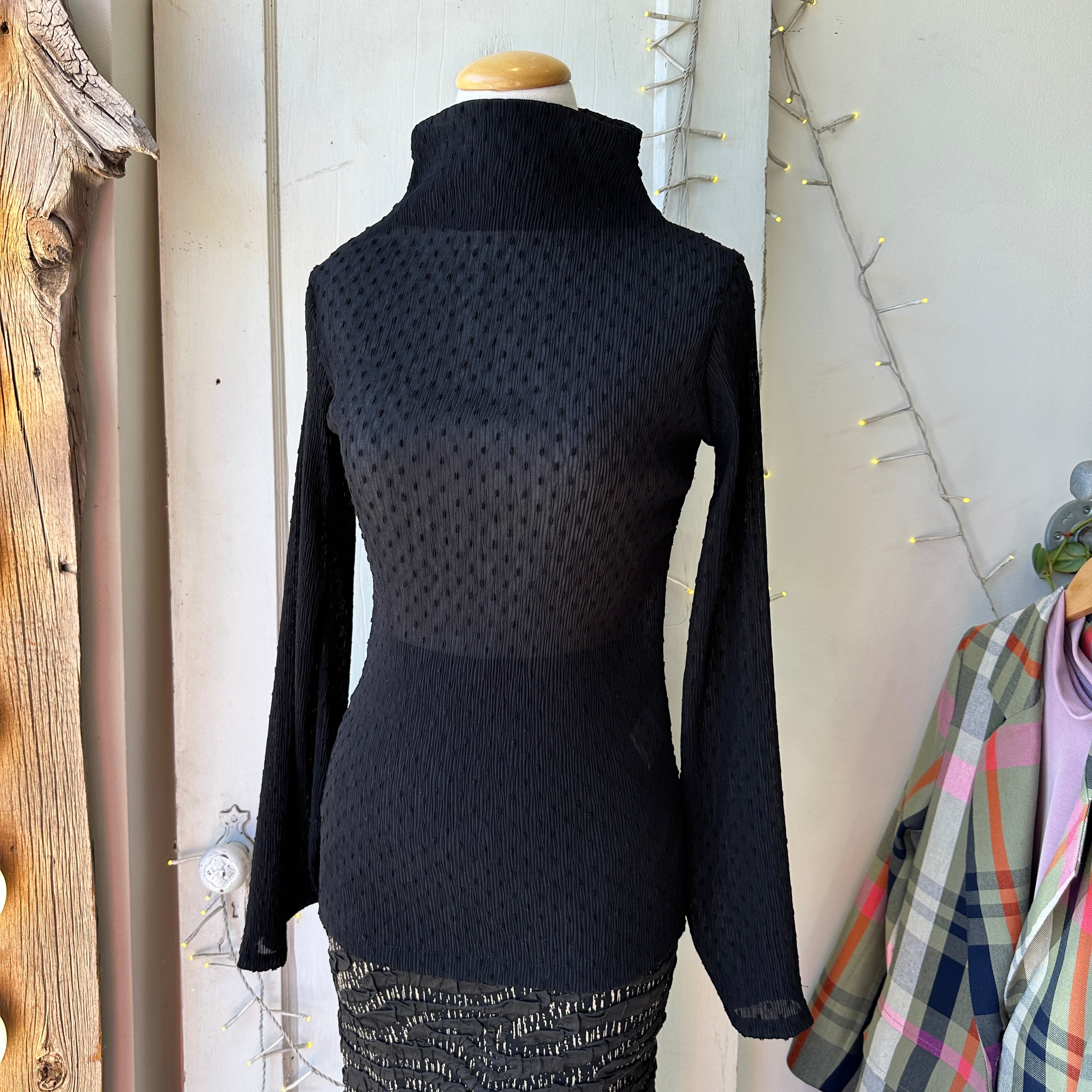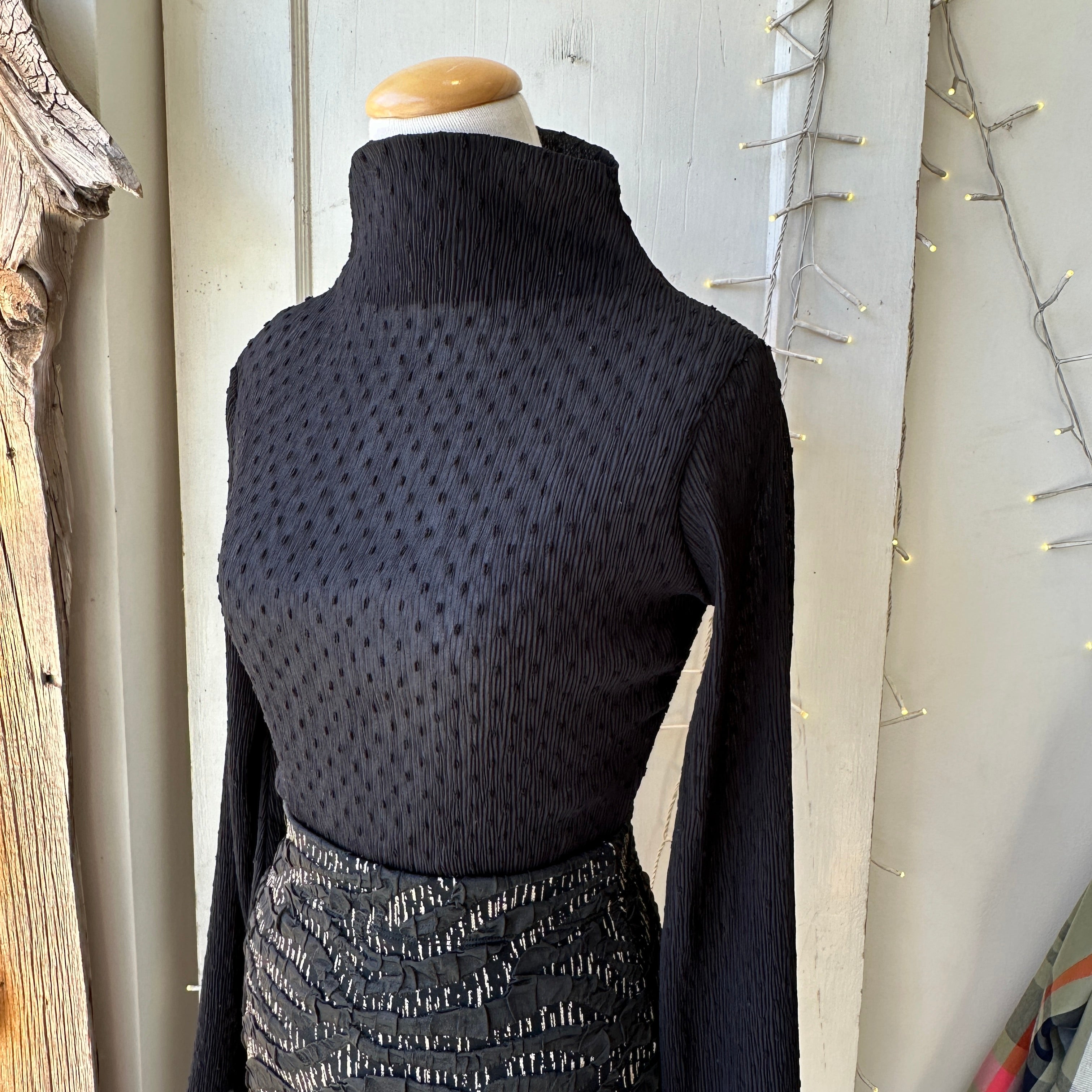 This item is stocked at our 744 Queen West location. Add a playful and sophisticated touch to your evenings with this pleated balloon-sleeve top. Its delicate, polka-dot texture and slight sheer detailing offer a unique and refined style, perfect for...
